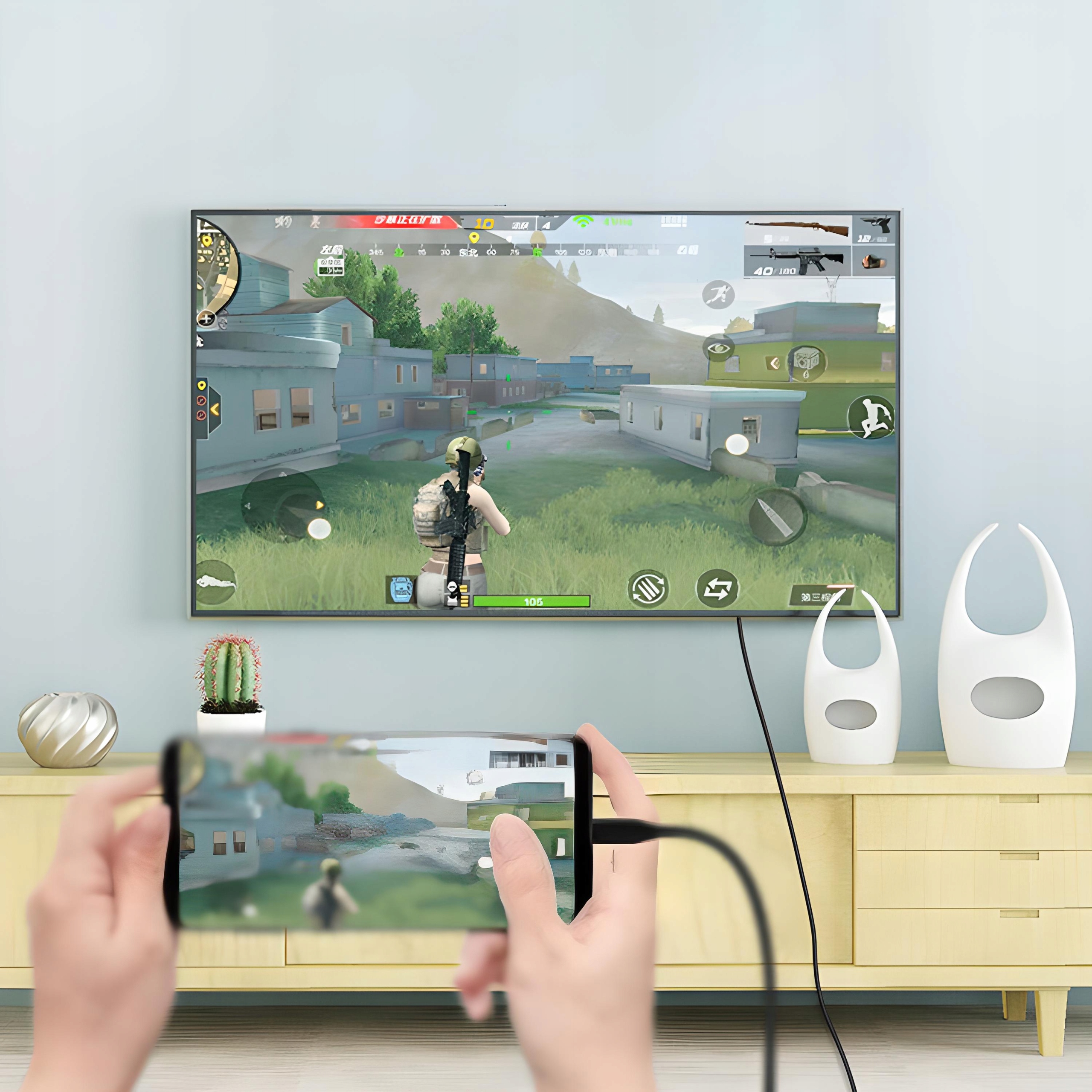 Przewód USB-C - HDMI pozwala przesyłać obraz oraz dźwięk ze smartfonu lub tabletu na ekran TV przez wejście HDMI. Na telewizorze zostanie wyświetlone dokładnie to samo co na podłączonym urządzeniu. Urządzenie musi posiadać złącze USB-C 3.1 oraz obsługiwać konwersję do HDMI. Nie wymaga dodatkowego zasilania, działa na zasadzie Plug and play.