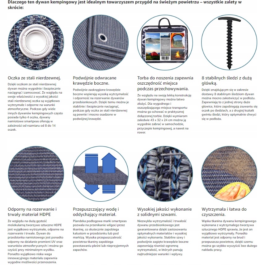 Wytrzymały dywan zapewnia czystość i komfort wokół namiotu lub przyczepy kempingowej/kampera.