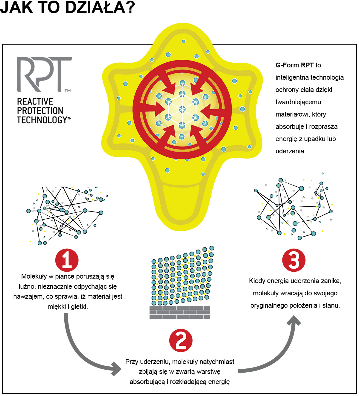 G-Form Pro-X to kompresyjne spodenki termoaktywne z ochraniaczami umieszczonymi w newralgicznych punkach na ciele. Dzięki inteligentnej technologii RPT™ zapewniają maksymalną ochronę przy jednoczesnej swobodzie ruchu i elastyczności materiału. Giętkie ochraniacze umieszczone na spodenkach w normalnych warunkach są miękkie, twardnieją dopiero w momencie uderzenia dzięki czemu nie krępują naturalnych ruchów. Niezwykły komfort zapewniony jest dodatkowo dzięki niezwykle lekkiemu, ale za to bardzo wytrzymałemu materiałowi oraz możliwości prania w pralce. Ochraniacze przytwierdzone są do spodenek na stałe pozostając na swoim miejscu bez względu na wykonywane manewry.