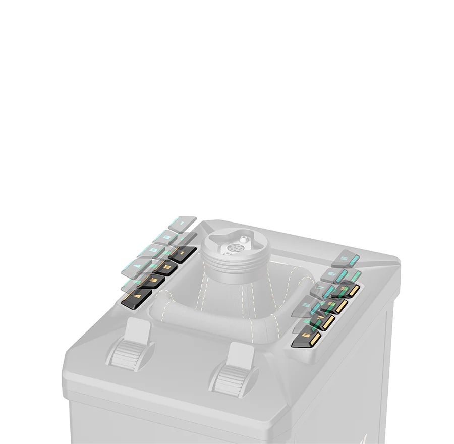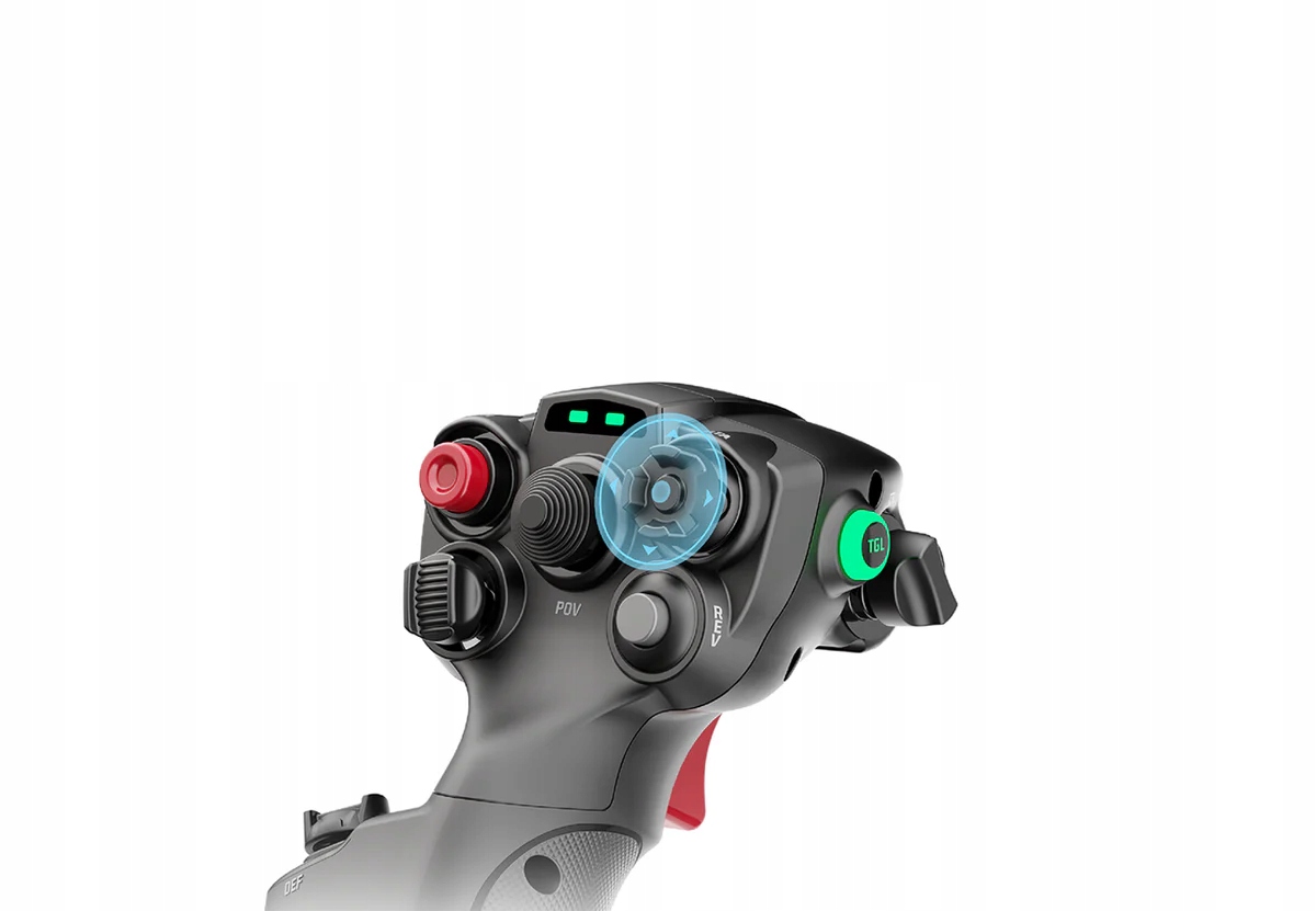 Drążek MHG oferuje ponad 25 programowalnych wyjść, w tym cztery 5-kierunkowe przełączniki oraz 2-stopniowy spust. Pozwala to na mapowanie niemal wszystkich kluczowych systemów samolotu – od uzbrojenia po zarządzanie sensorami – bezpośrednio pod palcami, bez konieczności odrywania wzroku od horyzontu.