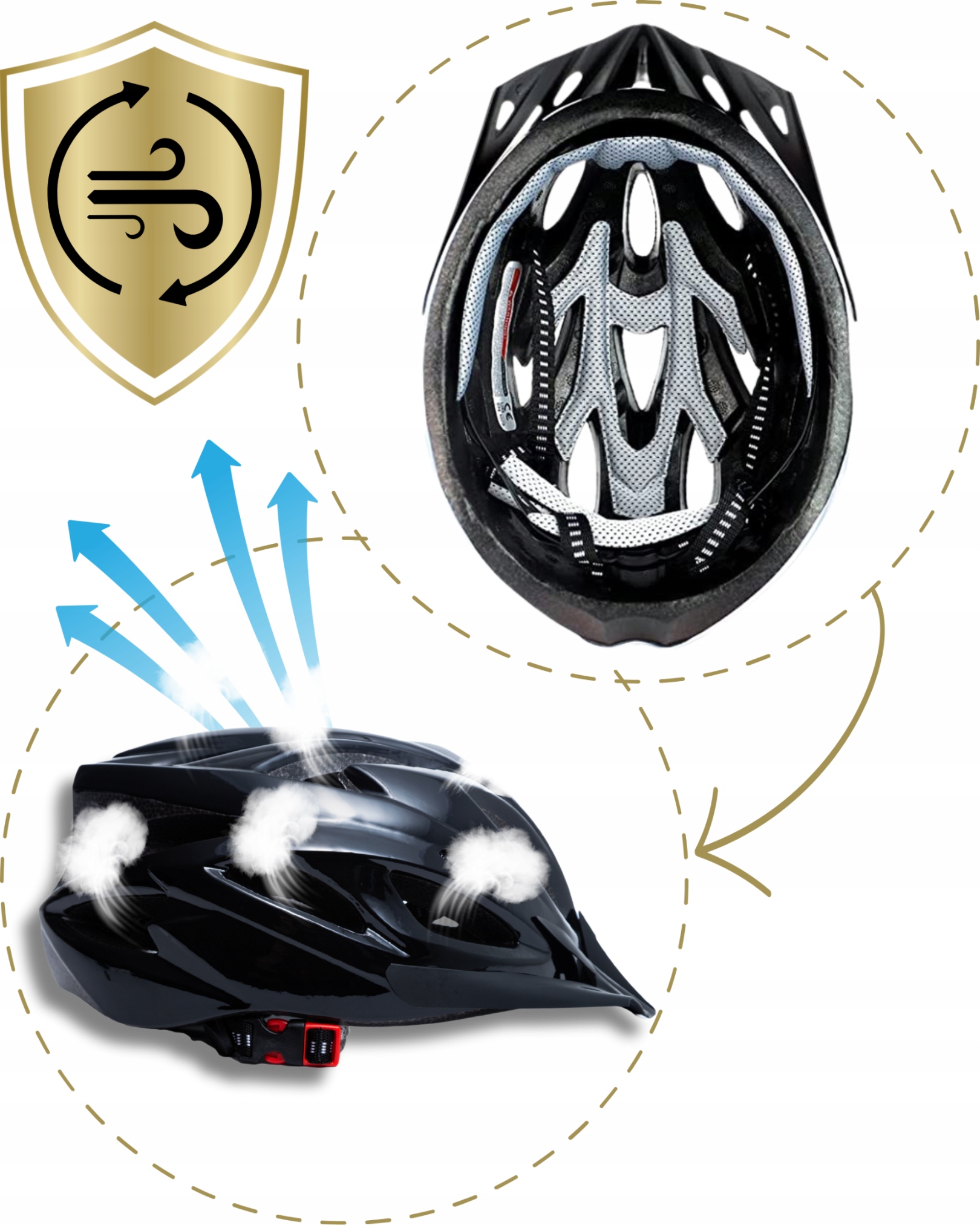 Dodatkowo, dzięki licznym otworom wentylacyjnym, powietrze może swobodnie krążyć wewnątrz kasku, chroniąc głowę przed przegrzaniem nawet w upalne dni czy podczas intensywnego wysiłku.