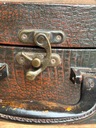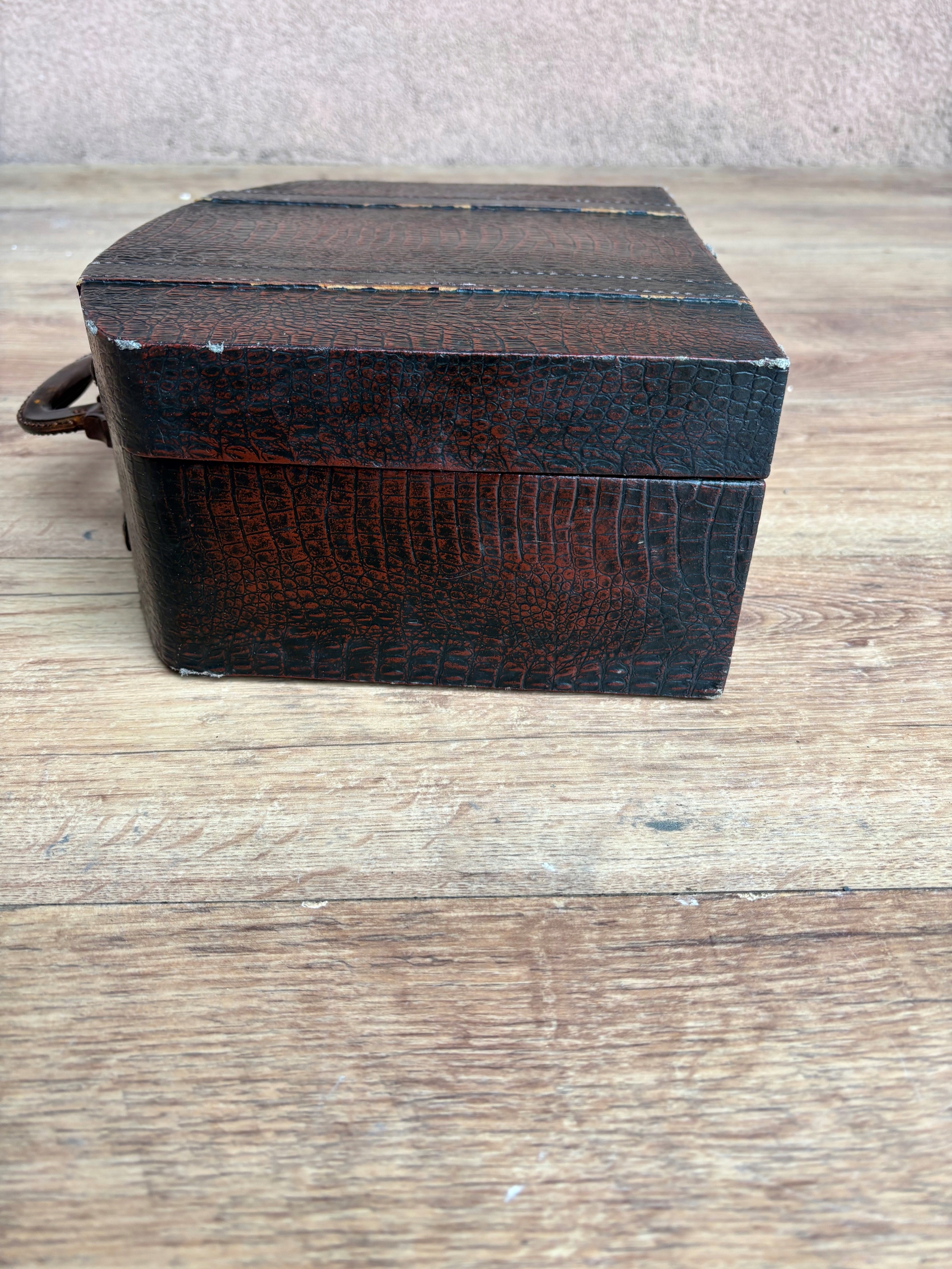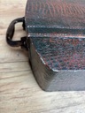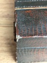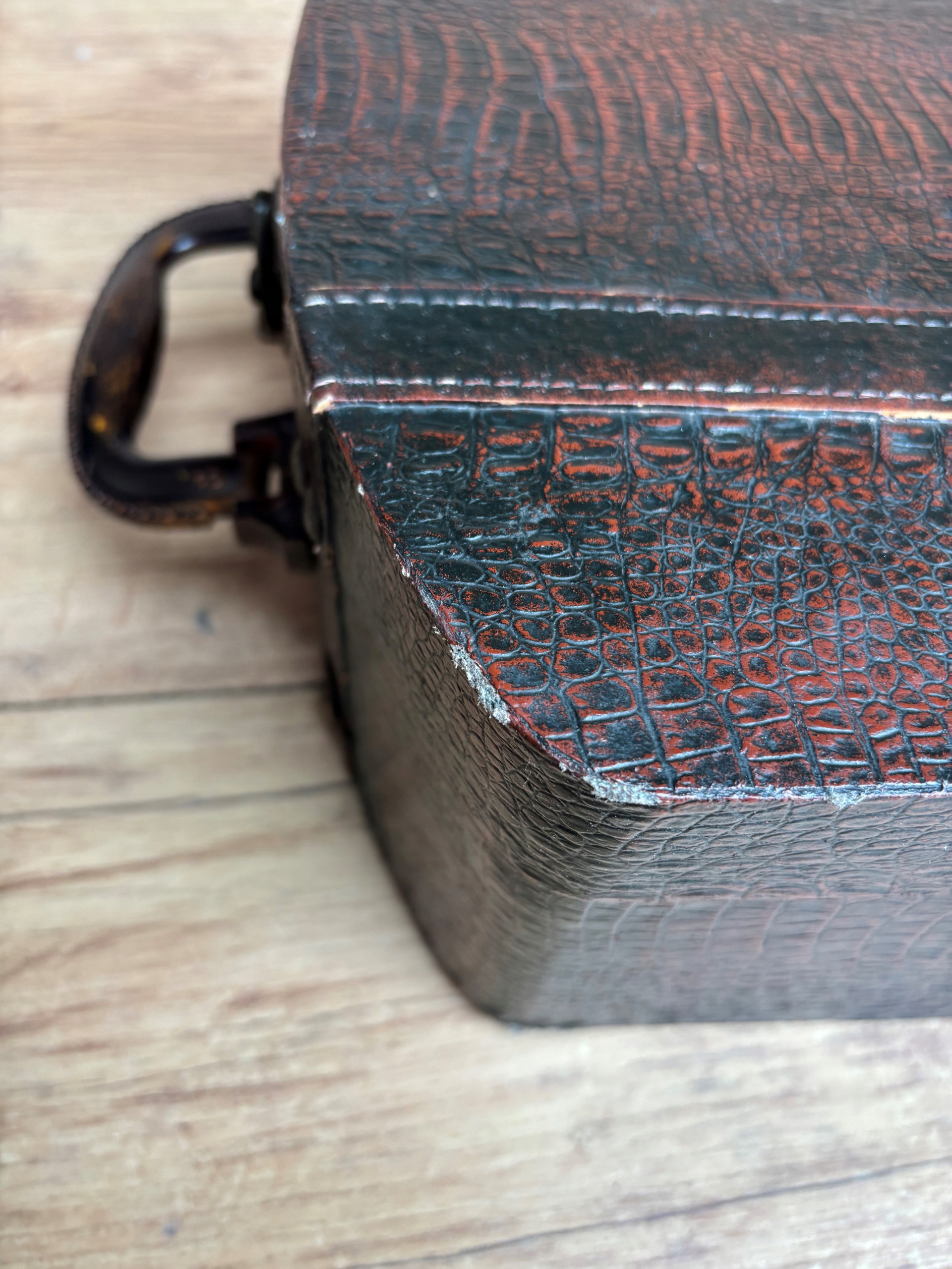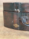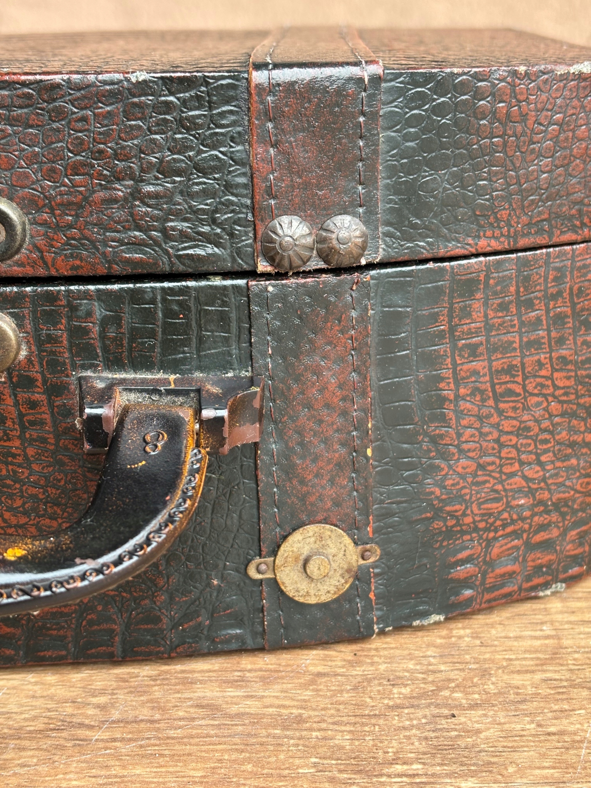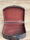 Kuferek podróżny z okresu PRL. Pokryty imitacją skóry, metalowe okucia i drewniana rączka. .Stan przedmiotu wraz ze śladami użytkowania pokazany na zdjęciach. Wymiary wys.; 12,5 cm. szer..30 x 25 cm.