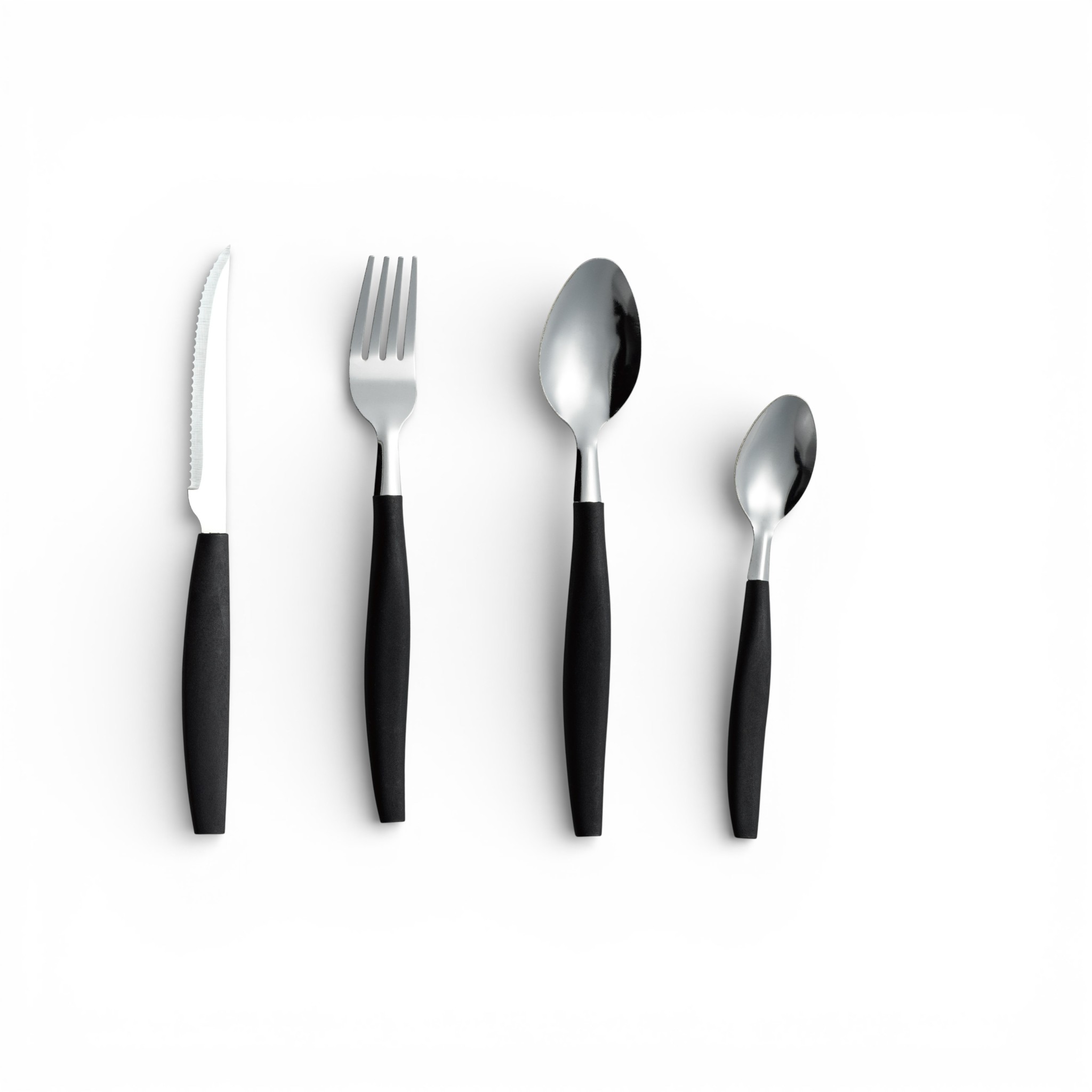 Elegancki zestaw sztućców dla 6 osób, który łączy nowoczesny wygląd z wygodą użytkowania. Stylowe, czarne rączki z tworzywa sztucznego świetnie komponują się zarówno z klasyczną, jak i nowoczesną zastawą stołową.