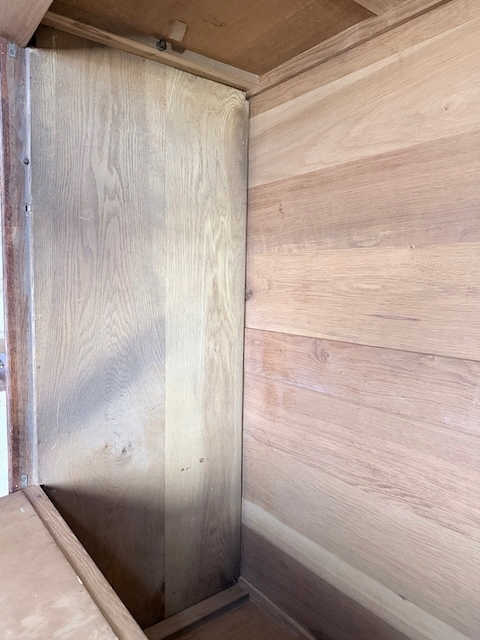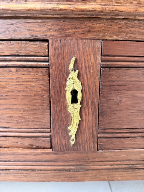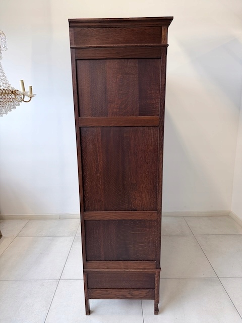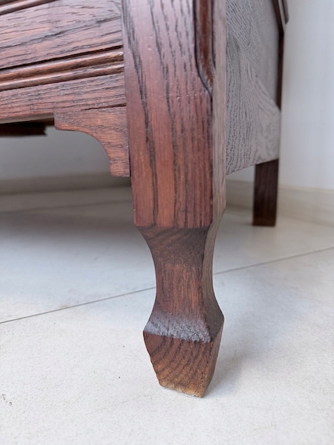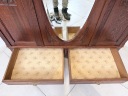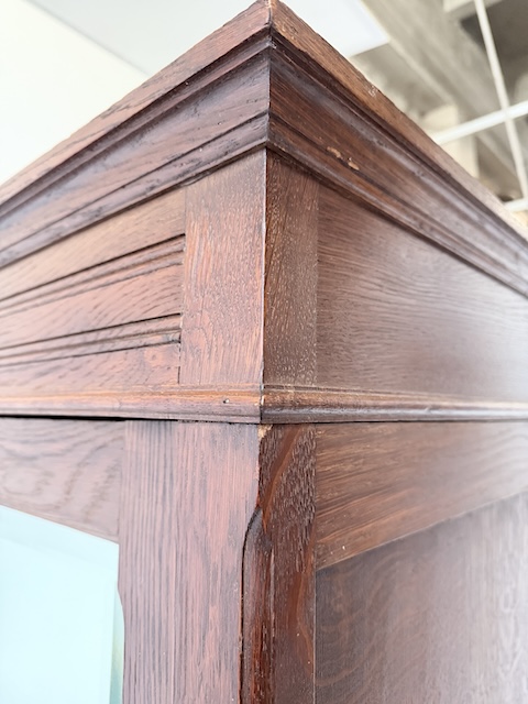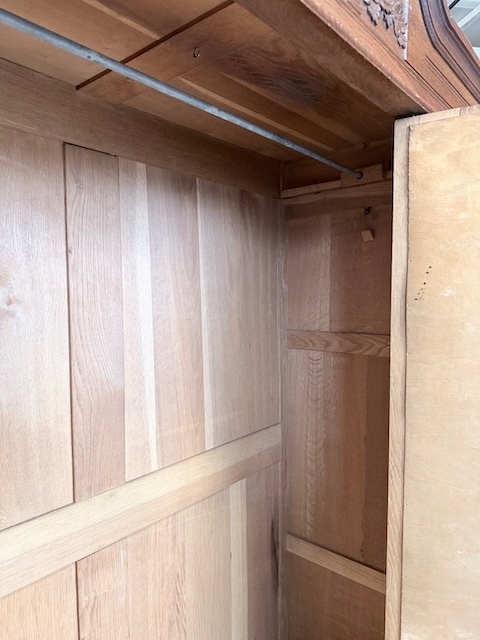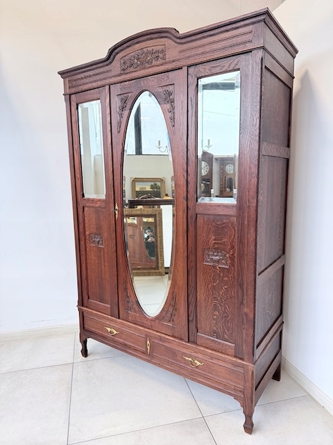 Szafa dębowa. Wykonana w stylu secesyjnym w 1931 roku. Bardzo ładna. Ma trzy skrzydła ale otwierane są tylko dwa; środkowe i lewe. Zamek jest sprawny( mamy tylko klucz do drzwi) z kluczem w komplecie. W każdym skrzydle jest oryginalne, fazowane lustro. Nadają one szafie lekkości. Lustra noszą ślady upływu czasu. Wewnątrz jest drążek. Na uwagę zasługują również stylowe, oryginalne okucia. Stan szafy szczegółowo pokazany jest na zdjęciach. Jest rozbieralna i do nowego właściciela przyjedzie w elementach. Gotowa jest do wstawienia.