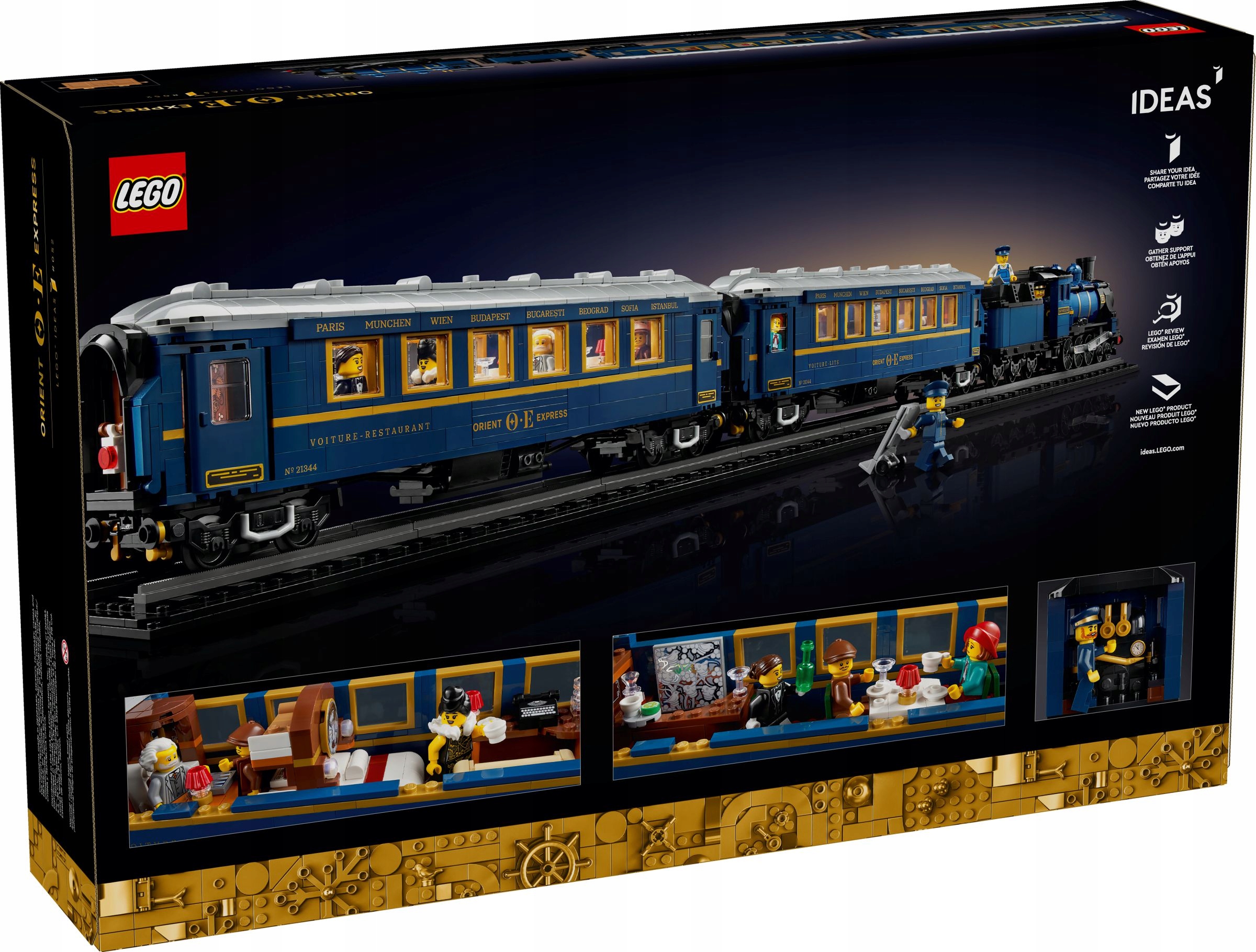 Powróć do złotej ery podróży pociągami, budując wspaniały model LEGO Ideas Orient Express. To idealny prezent dla miłośników pociągów, podróży i historii. Zawiera zbudowaną z klocków lokomotywę, wagon restauracyjny i wagon sypialny, a także tory kolejowe. Zdejmowane dachy umożliwiają podziwianie autentycznych szczegółów wnętrza wagonu restauracyjnego i sypialnego, w tym inkrustowanych paneli i efektu lustra nad łóżkiem w przedziale wagonu sypialnego pierwszej klasy.
