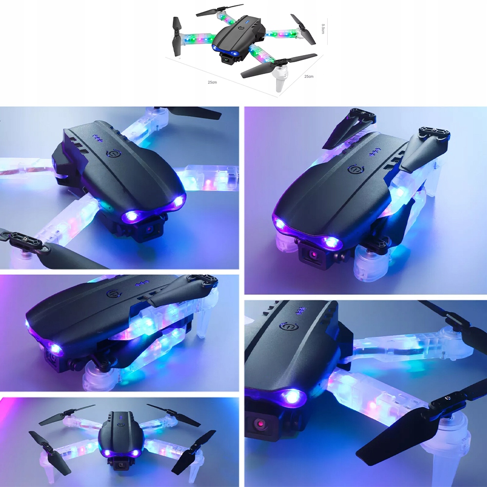 Ten nowoczesny dron wyposażony jest w przezroczyste, kolorowe ramiona LED, które zapewniają niesamowite efekty świetlne podczas lotu. Podświetlenie znacząco poprawia widoczność drona podczas lotów nocnych, umożliwiając łatwą identyfikację kierunku lotu w każdych warunkach oświetleniowych.