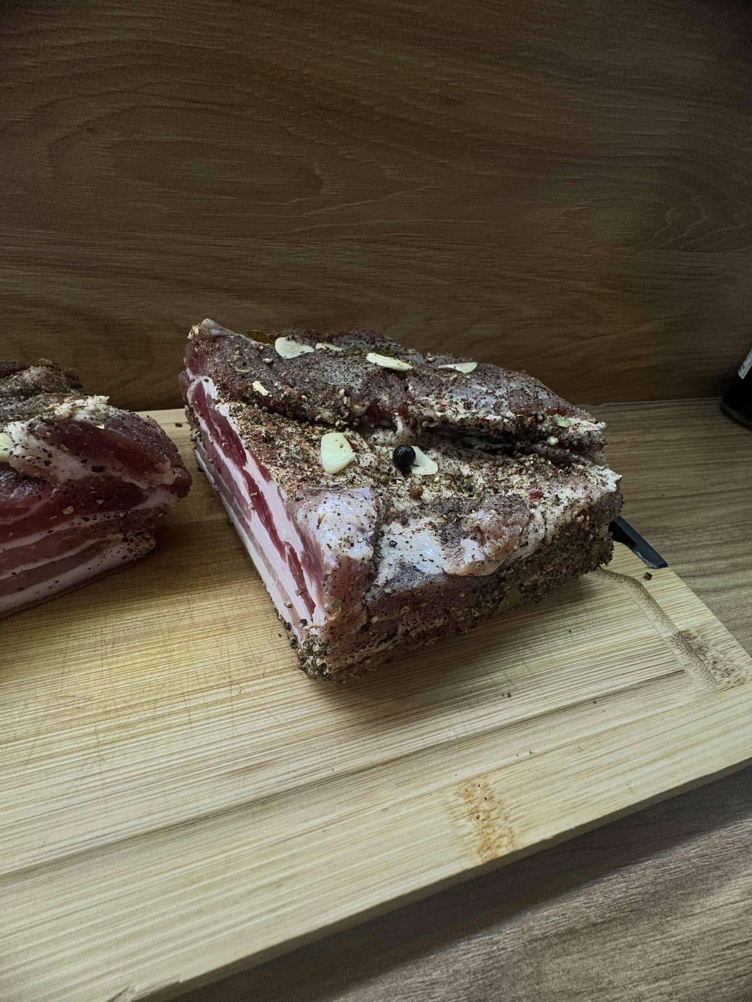 Wariantów słoniny jest bardzo wiele, zależne jest to głównie od naszego indywidualnego smaku i dostępnych przypraw. Proponuję boczek «Firmowy”, marynowany w soli, pieprzu w połączeniu z kolendrą i liściami laurowymi. Nacierany ziołami według firmowej receptury.To połączenie sprawia, że smak staje się bardziej wyrazisty, a sama słonina nadaje się do bezpośredniego spożycia na chlebie. Ziół dodaję w takiej ilości aby żadne z nich nie tłumiło smaku i aromatu ziół pozostałych. Wszystkie zioła są idealnie dobrane. Sama słonina nie smakuje ziołowo a jedynie jest przyprawiona, jej smak jest wyraźnie wyczuwalny.