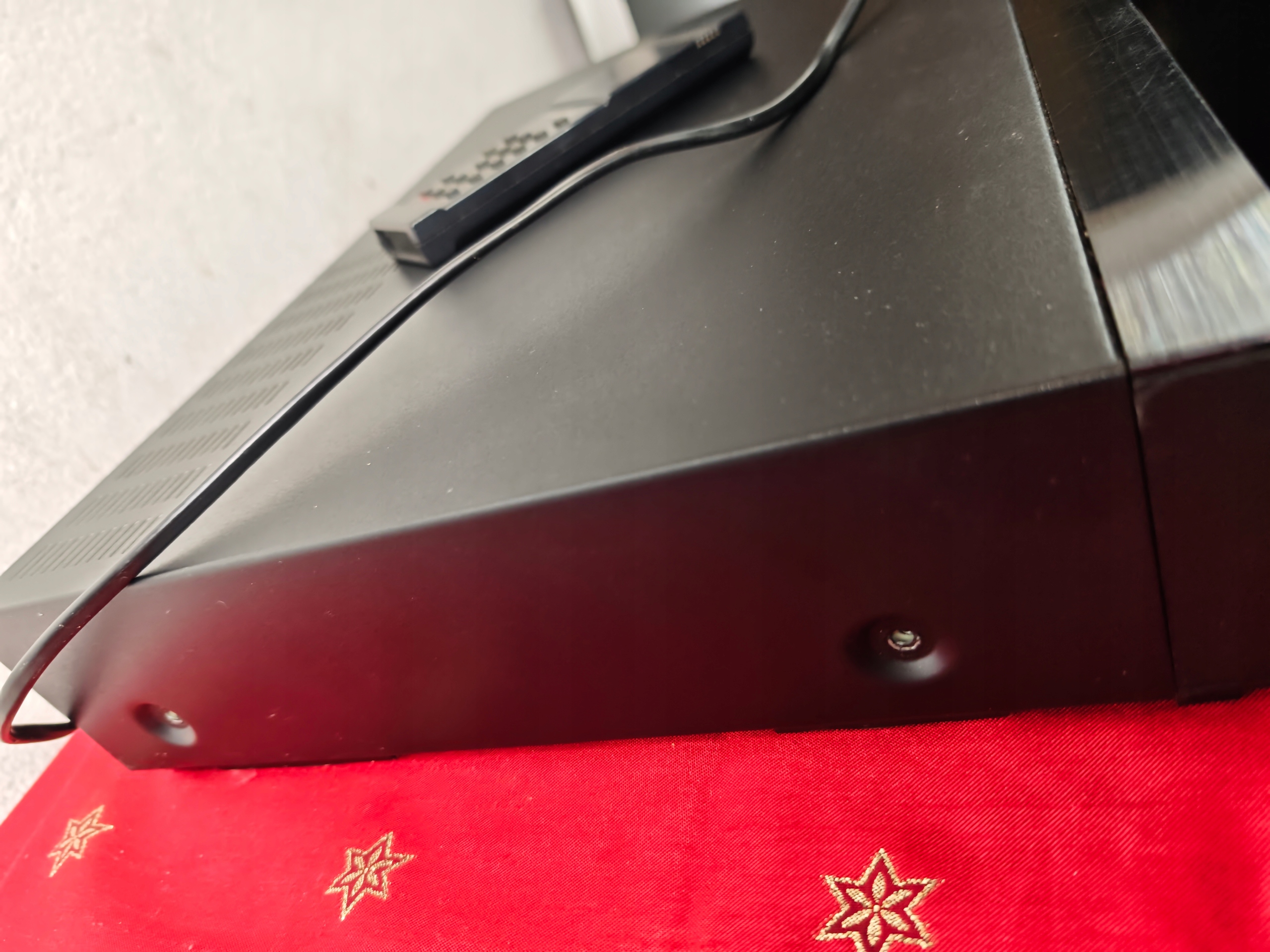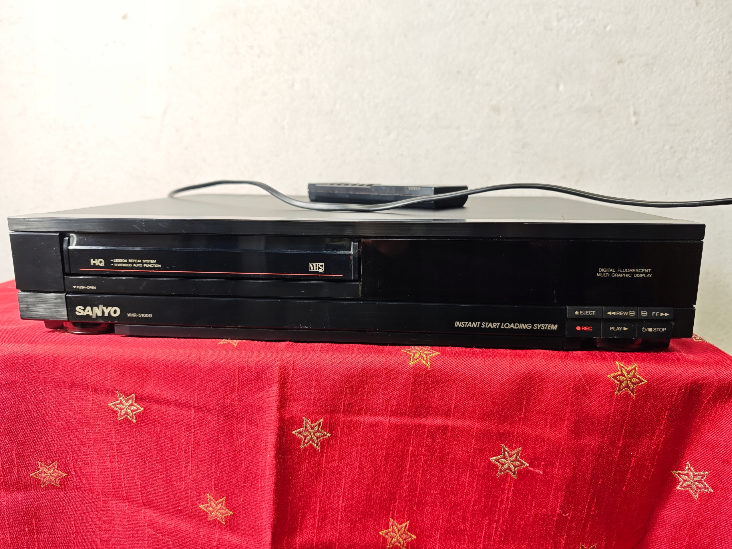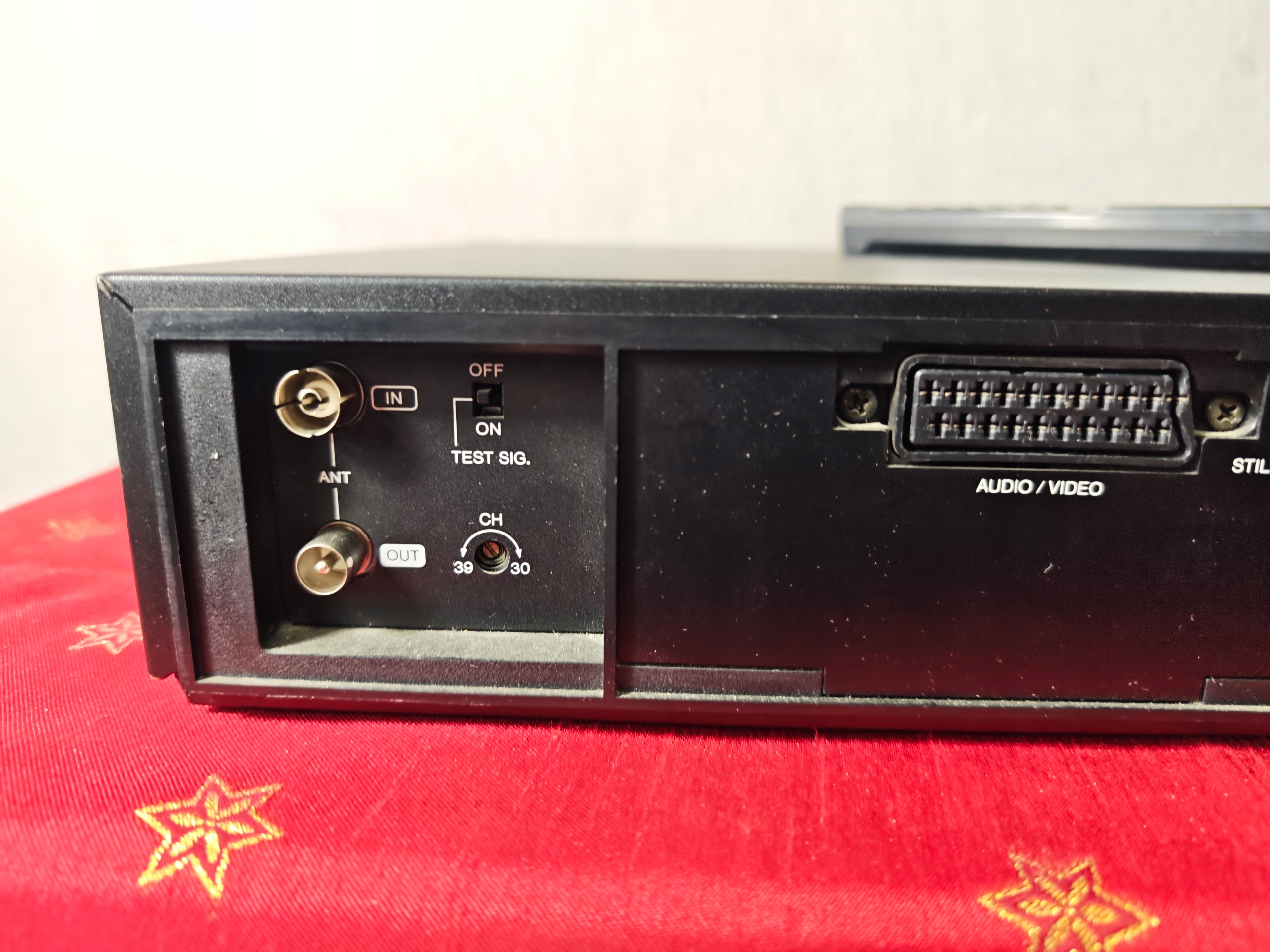Magnetowid jest niesprawny. Połknął kasetę i nie chce oddać. Wyświetlacz miga. Jak widać nie ma śrub ktoś go otwierał pewnie próbował naprawić i tak zostawił. Pilot w zestawie