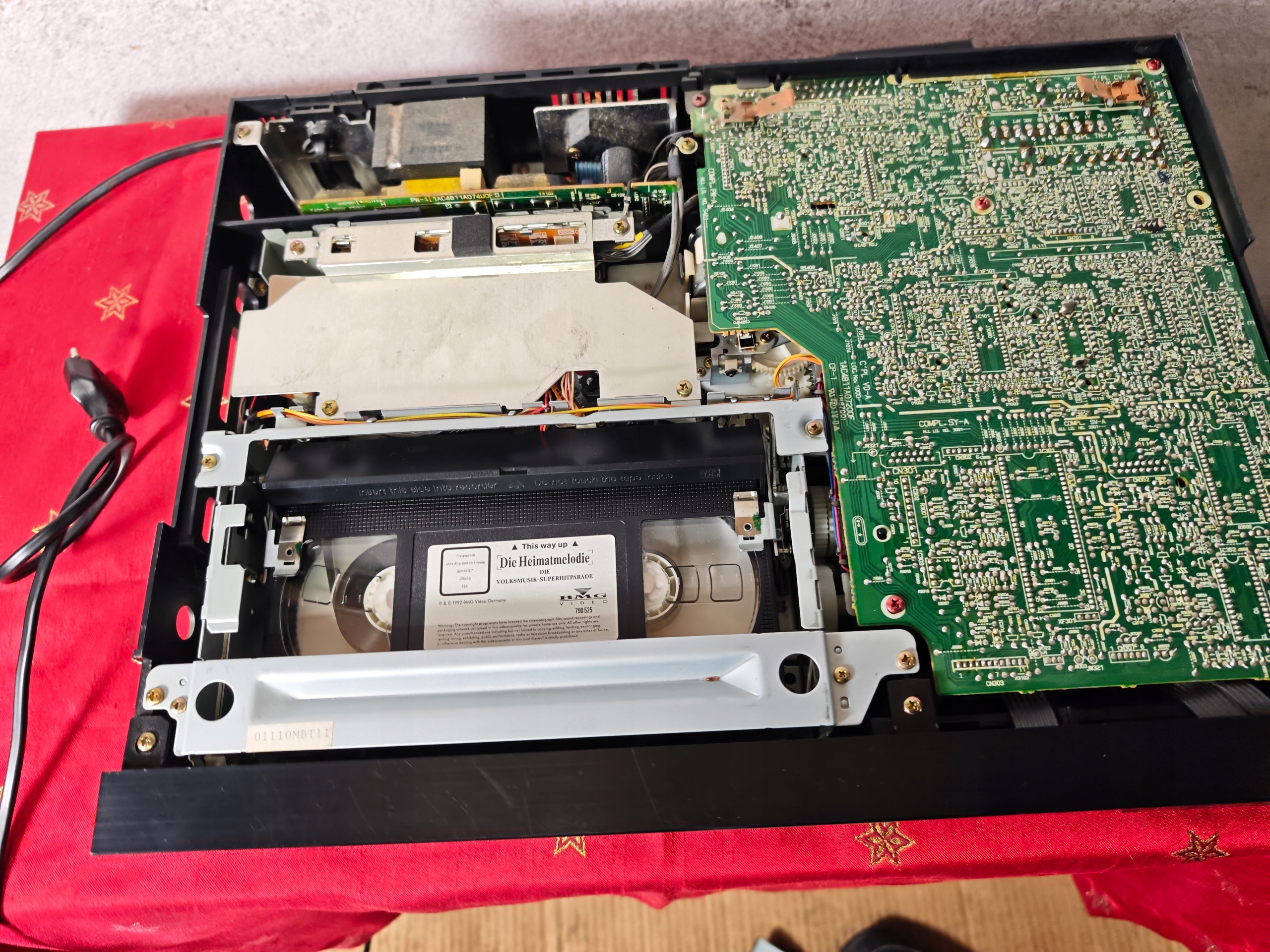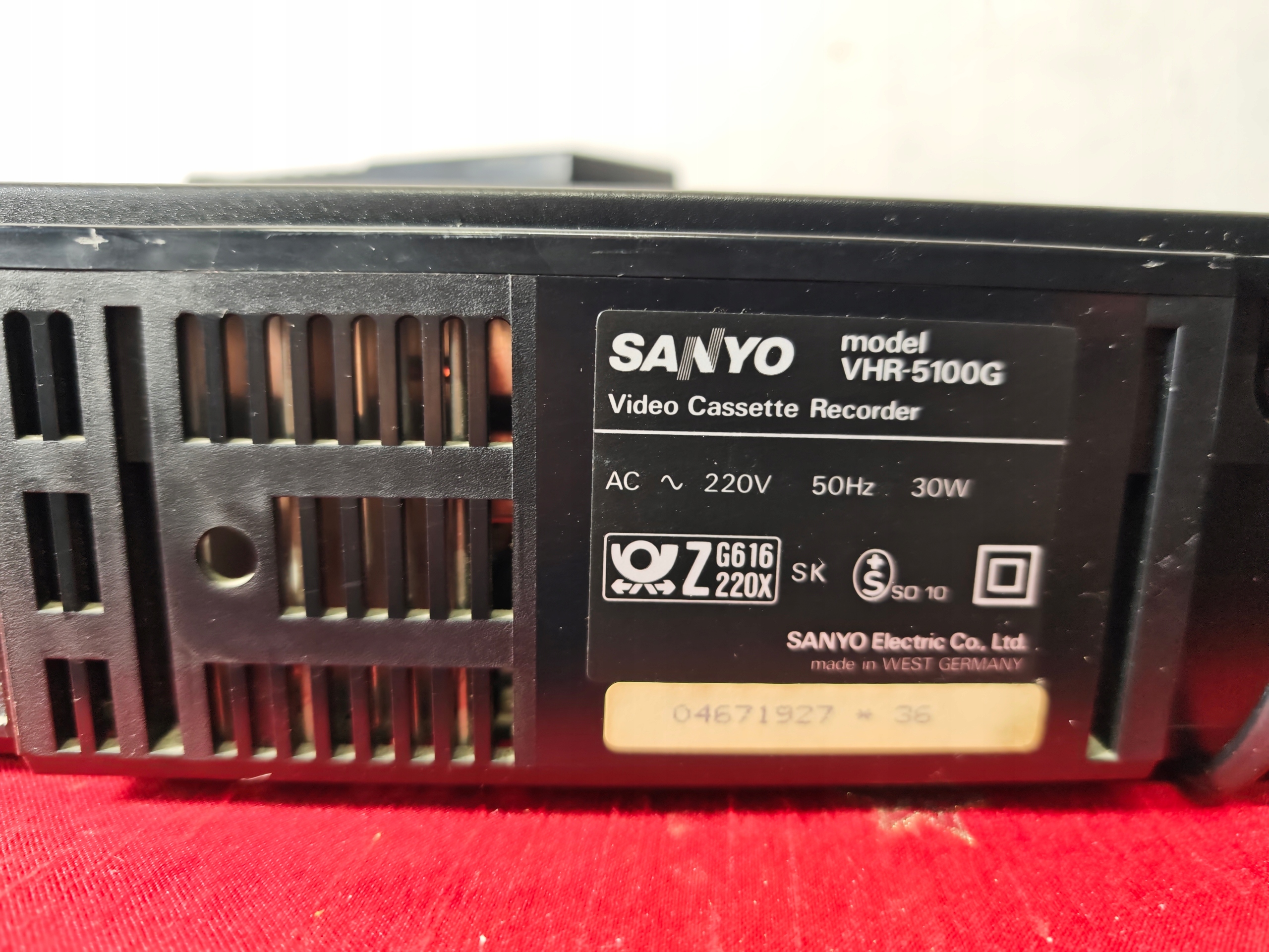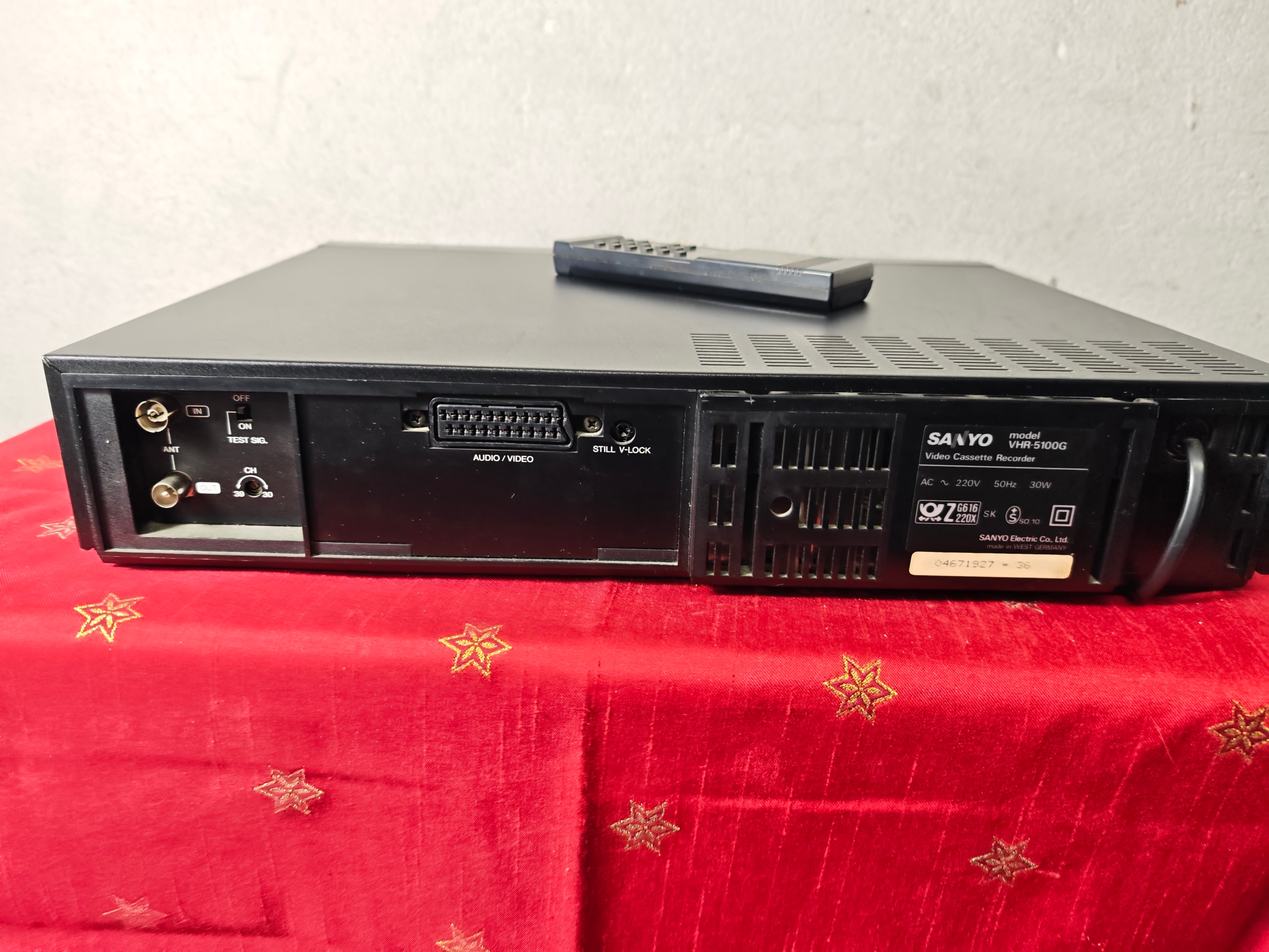 Magnetowid jest niesprawny. Połknął kasetę i nie chce oddać. Wyświetlacz miga. Jak widać nie ma śrub ktoś go otwierał pewnie próbował naprawić i tak zostawił. Pilot w zestawie