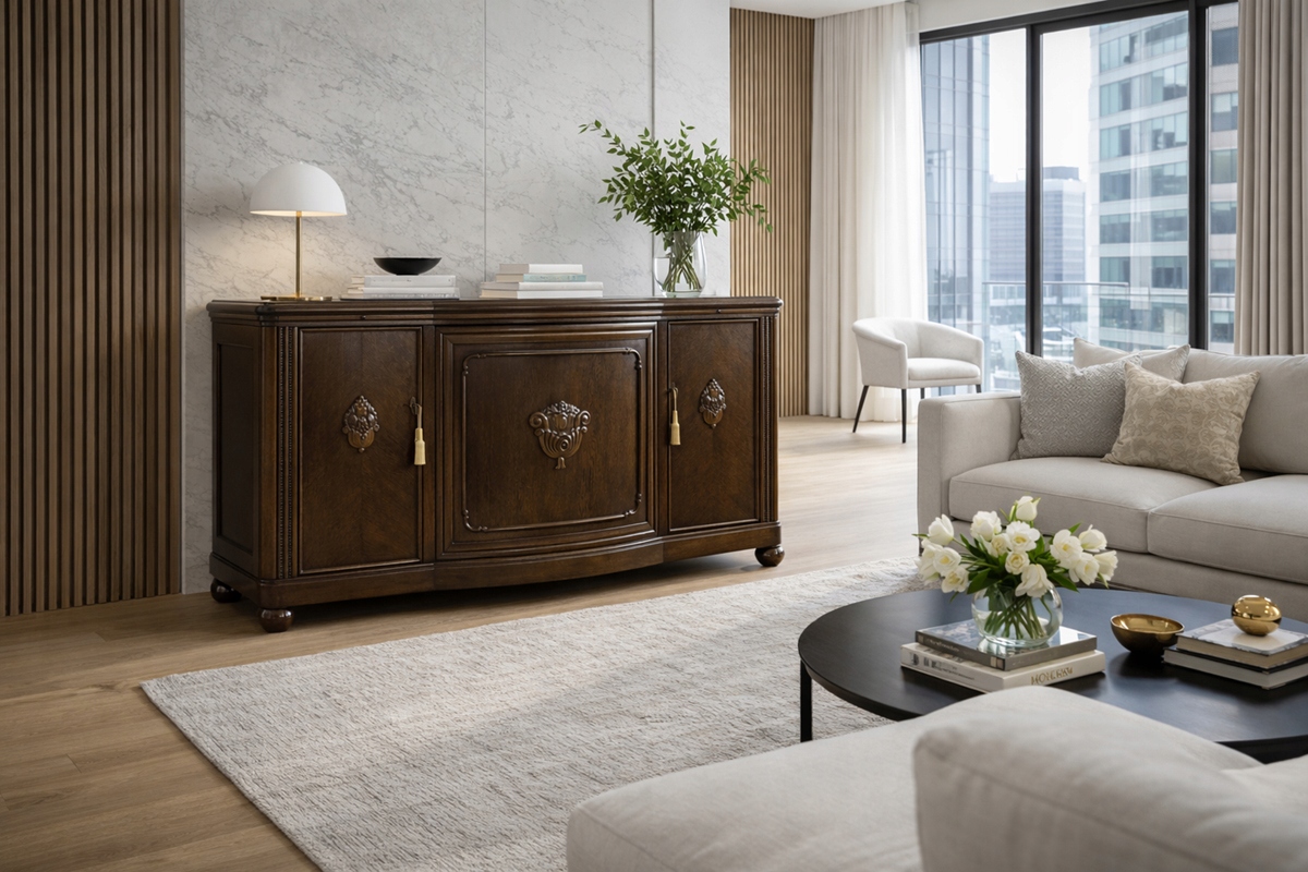 Miłośnikom klasycznych w formie, antycznych mebli oferujemy trzydrzwiową komodę - bufet z płaskorzeźbami.