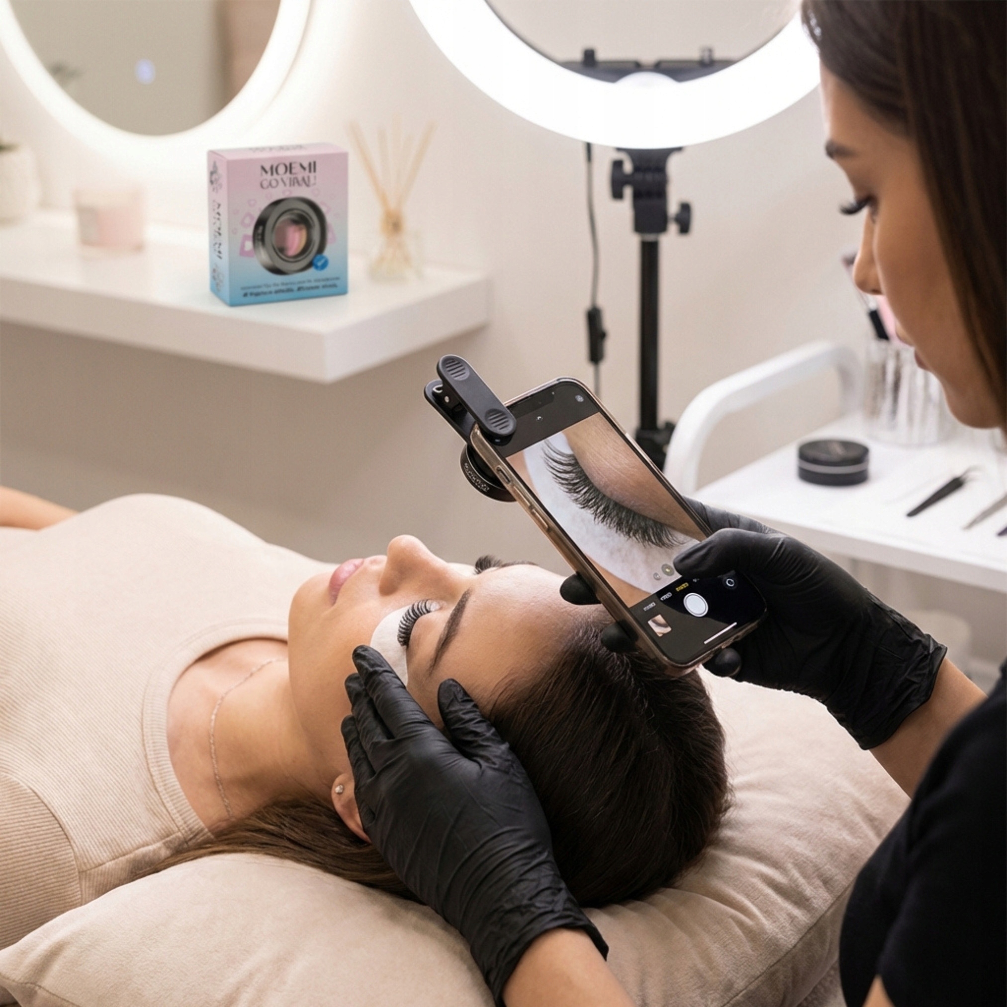 Większość tanich soczewek makro zmusza Cię do przybliżenia telefonu na odległość 1-2 cm od oka klientki. To nie tylko niekomfortowe, ale też rzuca cień na stylizację. Moemi Go Viral! zmienia zasady gry: