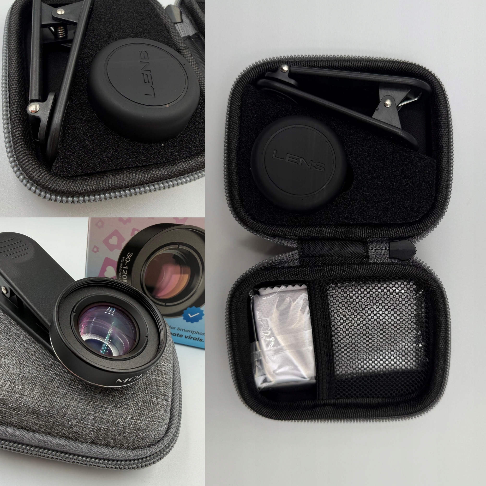 W zestawie otrzymasz: profesjonalny obiektyw makro, uniwersalny klips mocujący, dekielki ochronne oraz eleganckie, sztywne etui transportowe a także ściereczkę do przecierania.