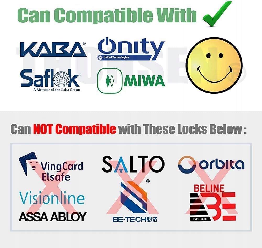 Te karty RFID współpracują z KABA, SAFLOK, MIWA i ONITY LOCKS, . Ale nie mogą pracować z zamkami HID, Salto i Assa Abloy Locks/Systems itp.