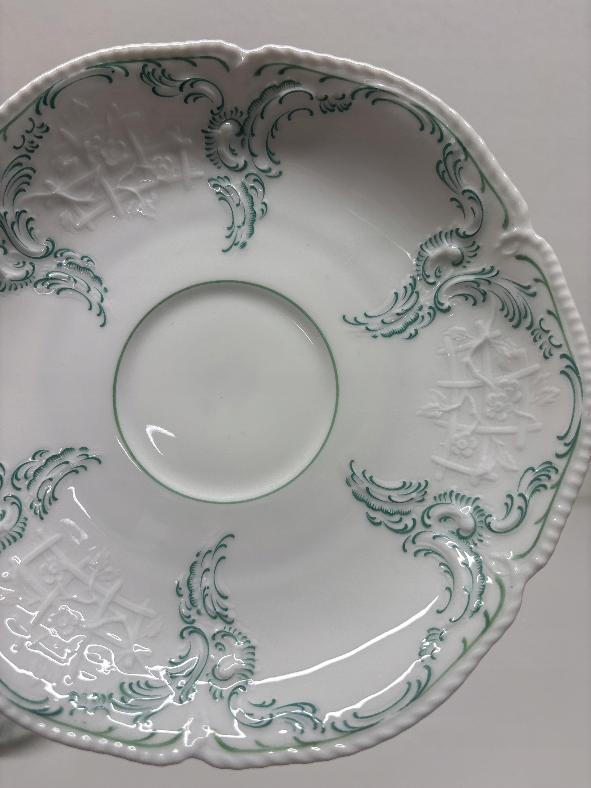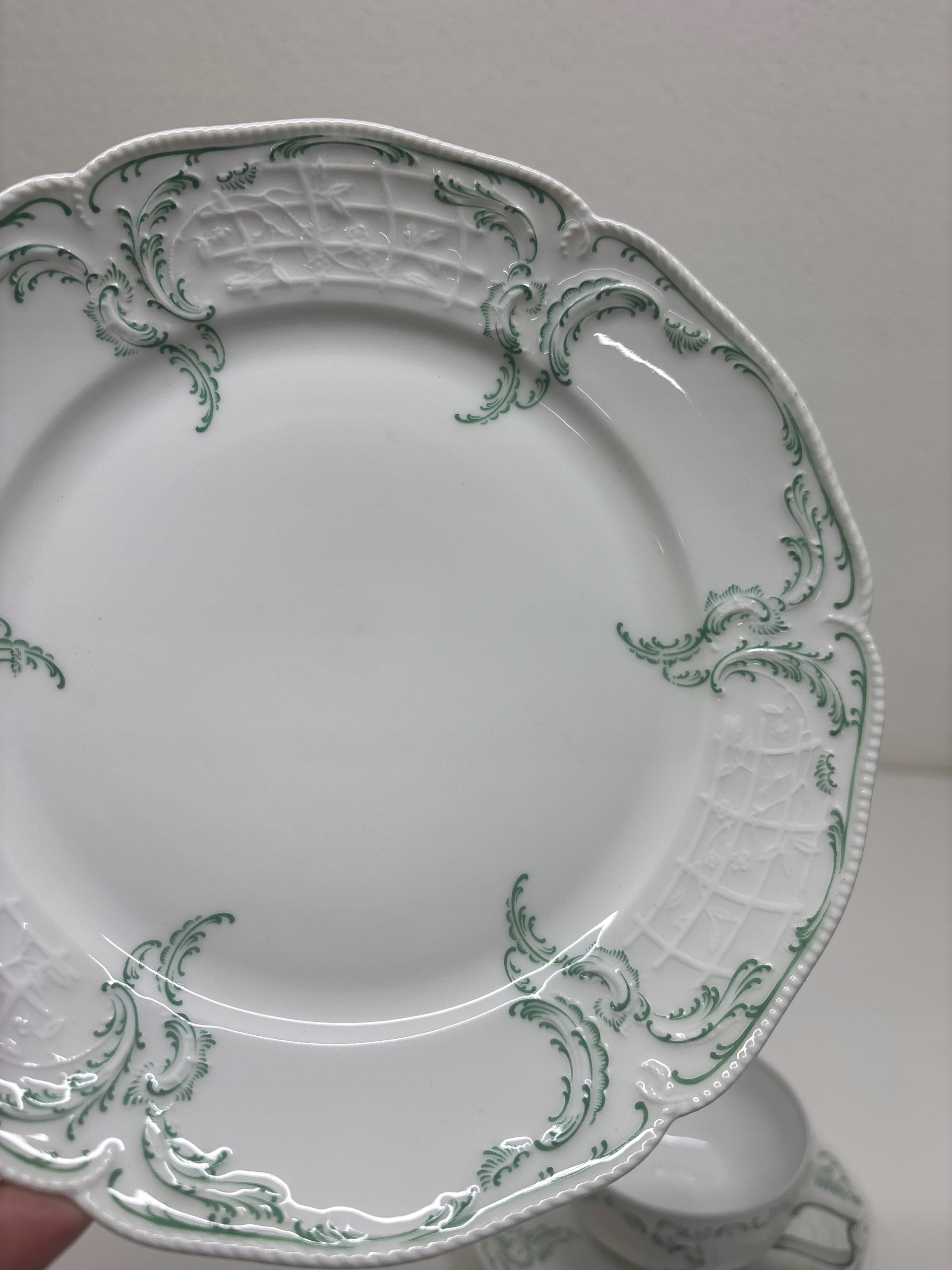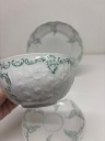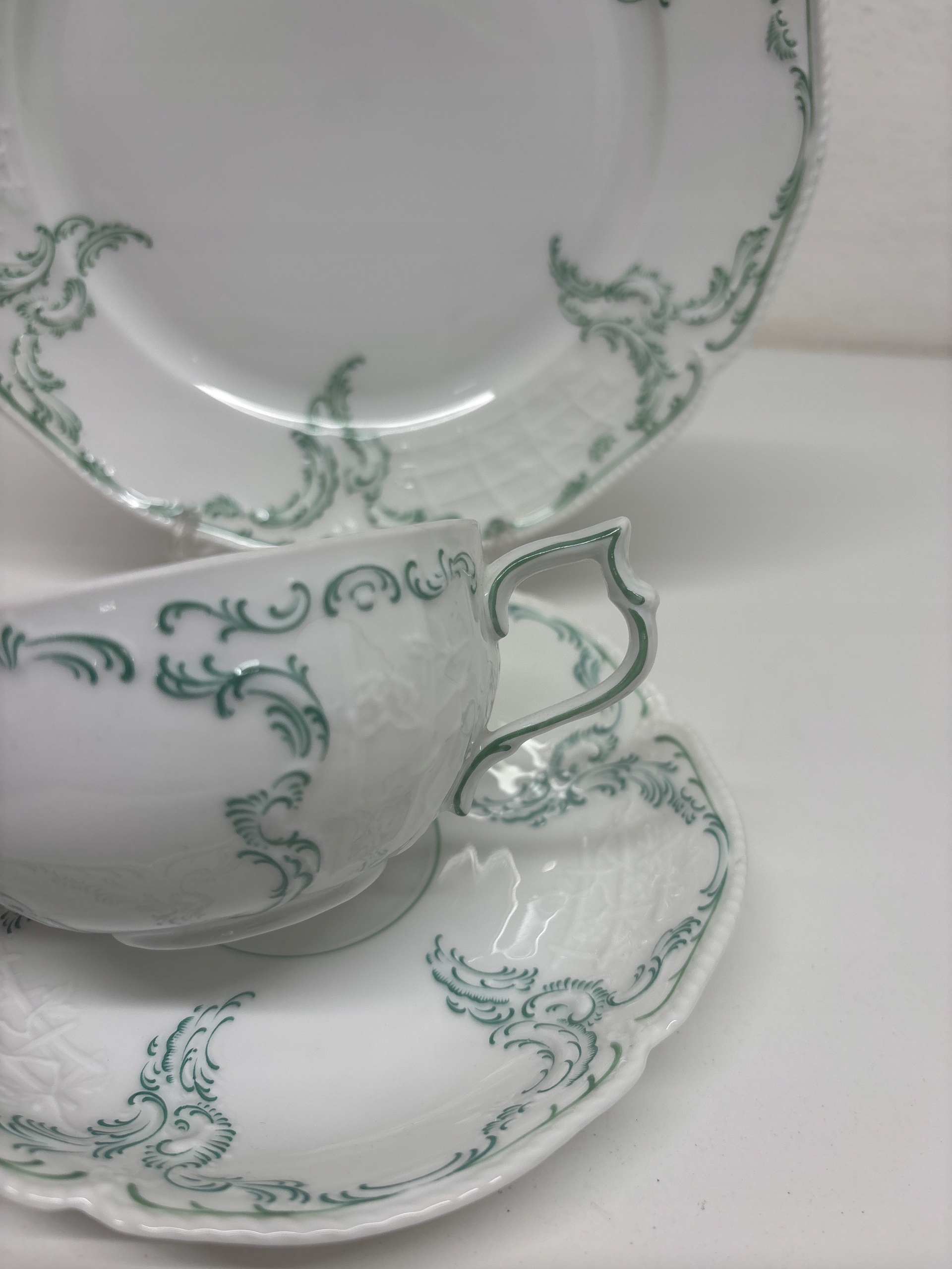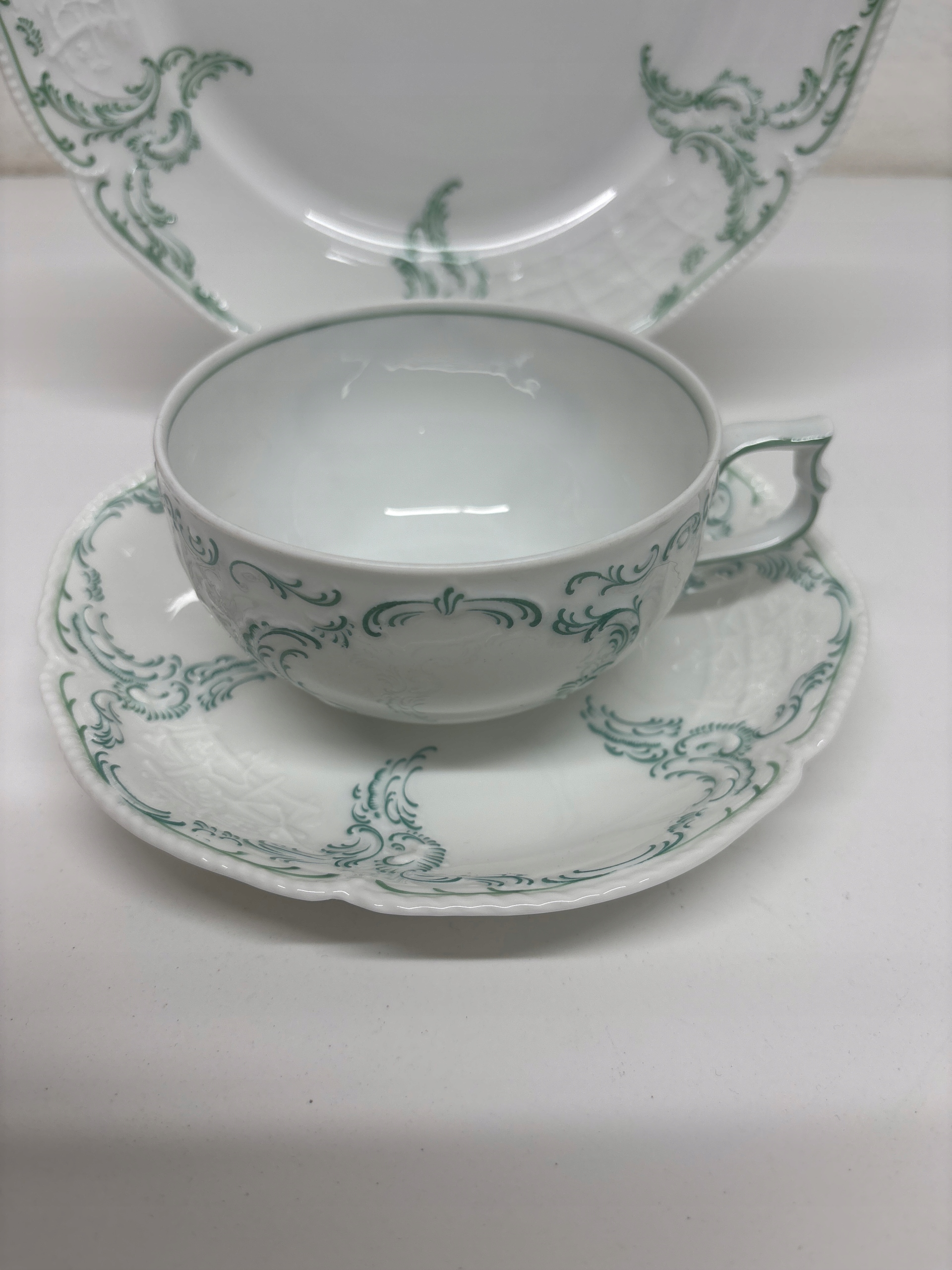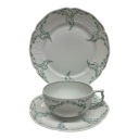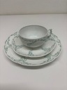 Trio w kolorze białym z zielenią w bardzo dobrym stanie o wymiarach wysokość filiżanki 5 cm, średnicy wlewu 9,5cm, pojemność 180 ml. Średnica talerzyka pod filiżankę 15,5cm, średnicy talerzyka deserowego 20 cm.