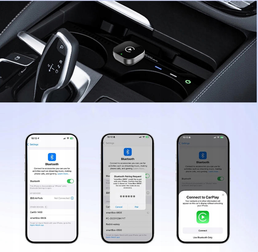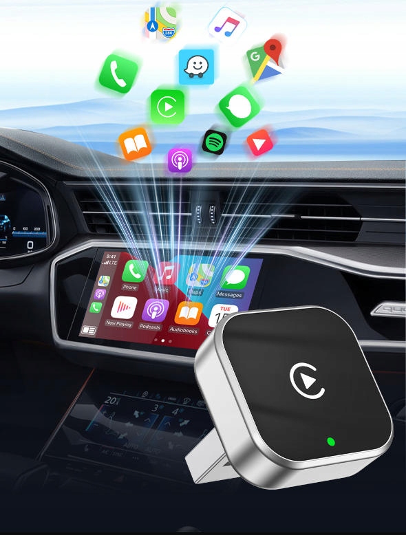 Zaawansowany adapter bezprzewodowy SMART DRIVE BOX AI, który umożliwia korzystanie z funkcji Apple CarPlay i Android Auto w samochodzie, eliminując potrzebę używania kabli. Urządzenie oferuje wygodę, elastyczność i pełne wsparcie dla popularnych aplikacji.