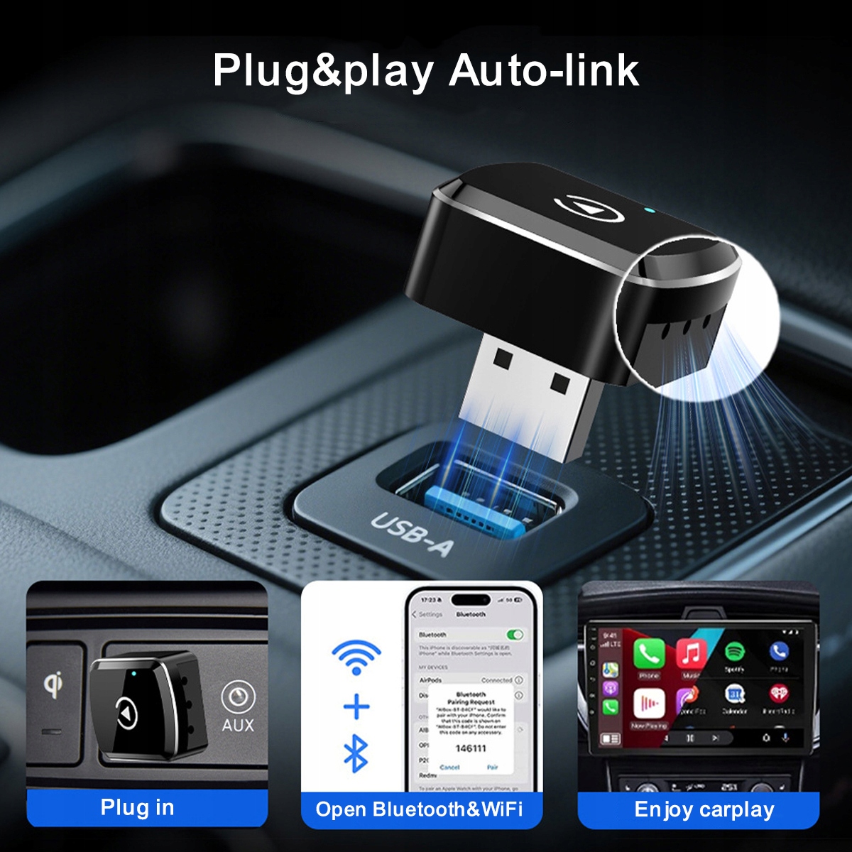 Podłączenie przez port USB w samochodzie, bez konieczności modyfikacji instalacji elektrycznej. Wymaga fabrycznego wsparcia dla CarPlay/Android Auto.