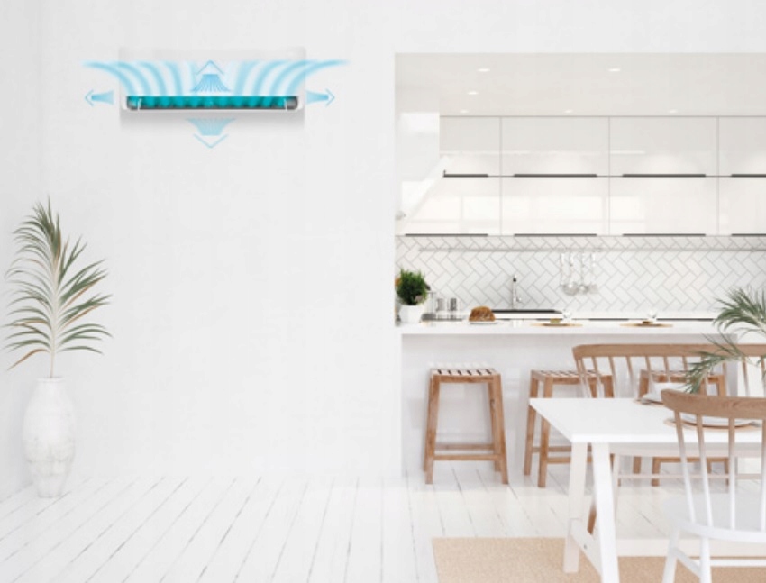 Klimatyzator wydajnie rozprowadza powietrze dzięki szerokiemu zakresowi nawiewu oraz systemowi automatycznego nawiewu 4D eMOTO. Umożliwia on sterowanie pracą żaluzji pionowych i poziomych za pomocą pilota bezprzewodowego.