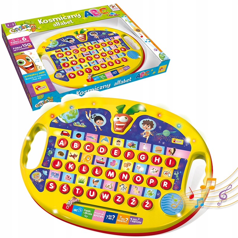 Kosmiczny Alfabet z Carotiną to wyjątkowa elektroniczna baza dydaktyczna, stworzona na podstawie metody nauki czytania i alfabetu dla dzieci już od najmłodszych lat. Wyposażona jest w wiele efektów świetlnych, posiada 6 klawiszy i 6 funkcji dydaktycznych. Po przesunięciu dźwigienki dzieci mogą poznać razem z głosem Carotiny literki alfabetu, wesołe wierszyki, a także wziąć udział w quizach, podczas których ich zadaniem będzie odnalezienie odpowiedniej literki lub wyrazu. Za poprawną odpowiedź Carotina nagrodzi ich wesołym okrzykiem. Jeśli jednak odpowiedź będzie nieprawidłowa, dziecko ma drugą szansę by spróbować ponownie.