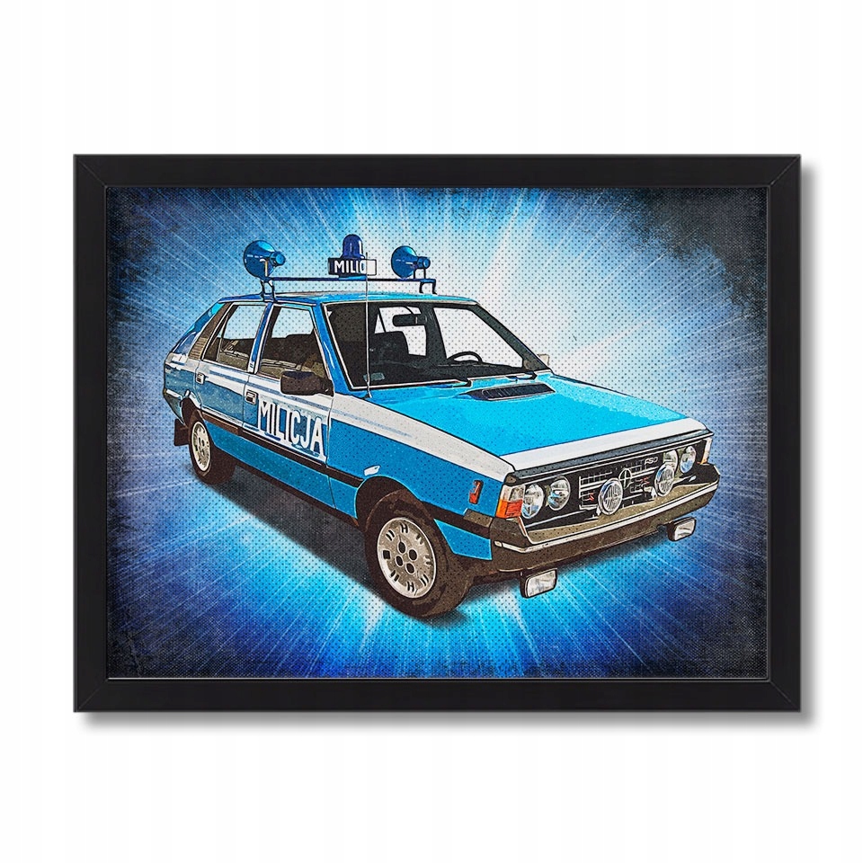 Stylowy obraz przedstawiający kultowego Poloneza w barwach Milicji Obywatelskiej w klimacie retro PRL. Grafika nawiązuje do historii polskiej motoryzacji i służb mundurowych, tworząc wyjątkową dekorację dla miłośników klasyków oraz nostalgii lat 70–90.