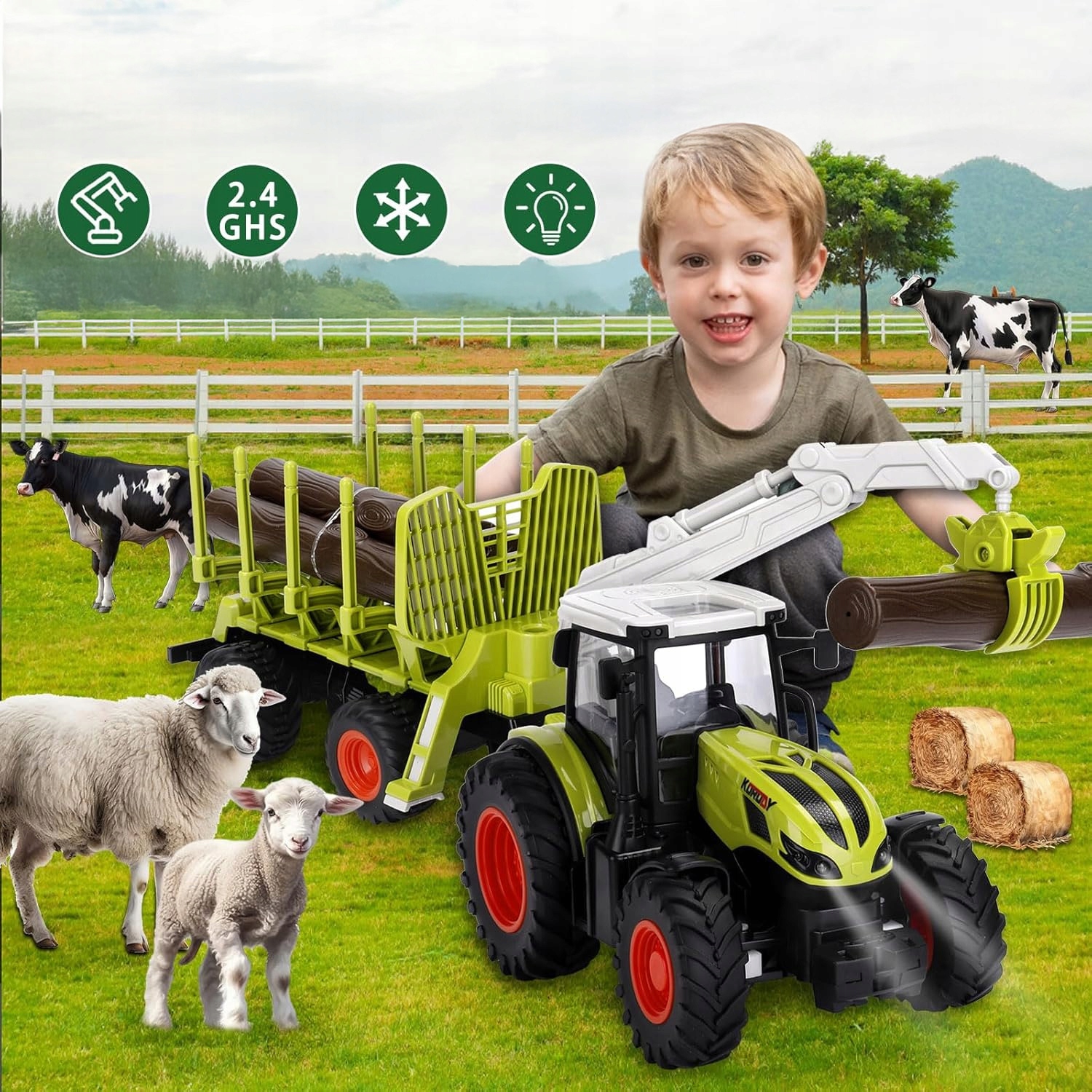 Traktor jest precyzyjnie odwzorowany w skali 1:24. Zestaw zawiera: zdalnie sterowany traktor, przyczepę z możliwością rozbudowy, trzy „kufry”, akumulator, pilota 2,4 GHz, kabel USB do ładowania oraz śrubokręt. Dzięki temu zestawowi do transportu drewna dzieci mogą symulować cały proces załadunku i rozładunku drewna, a także transportować i rozładowywać „drewno”.