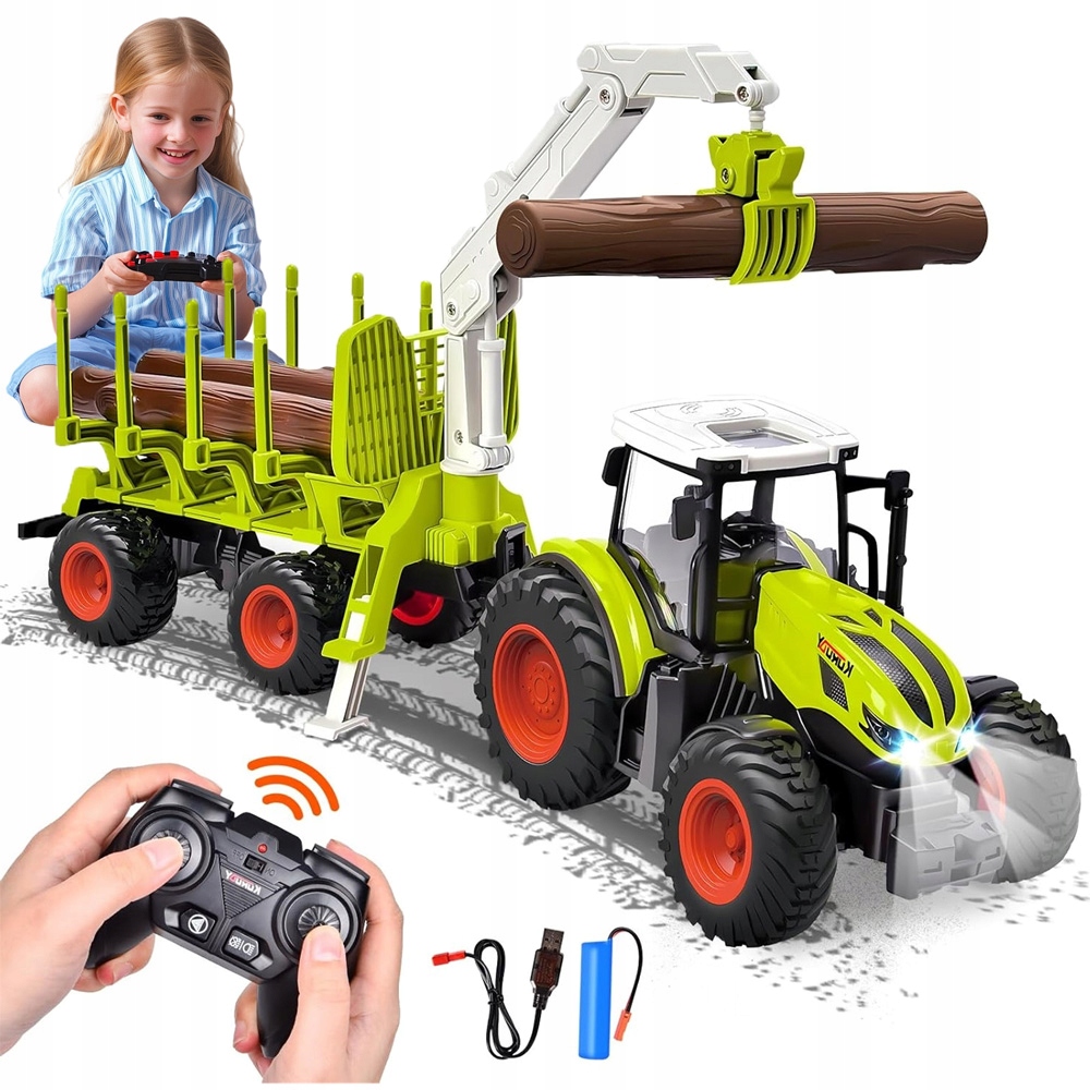Ten zdalnie sterowany traktor z przyczepą charakteryzuje się nie tylko pięknym wyglądem zewnętrznym, ale także szczegółowym wnętrzem, takim jak realistyczny fotel, kierownica i konsola sterownicza, przypominające prawdziwy traktor. Model jest wyposażony w kompletne ramię robota i przyczepę – ramię obraca się o 360 stopni i porusza w górę i w dół, pozwalając dzieciom precyzyjnie układać każdy kawałek „kłody”.