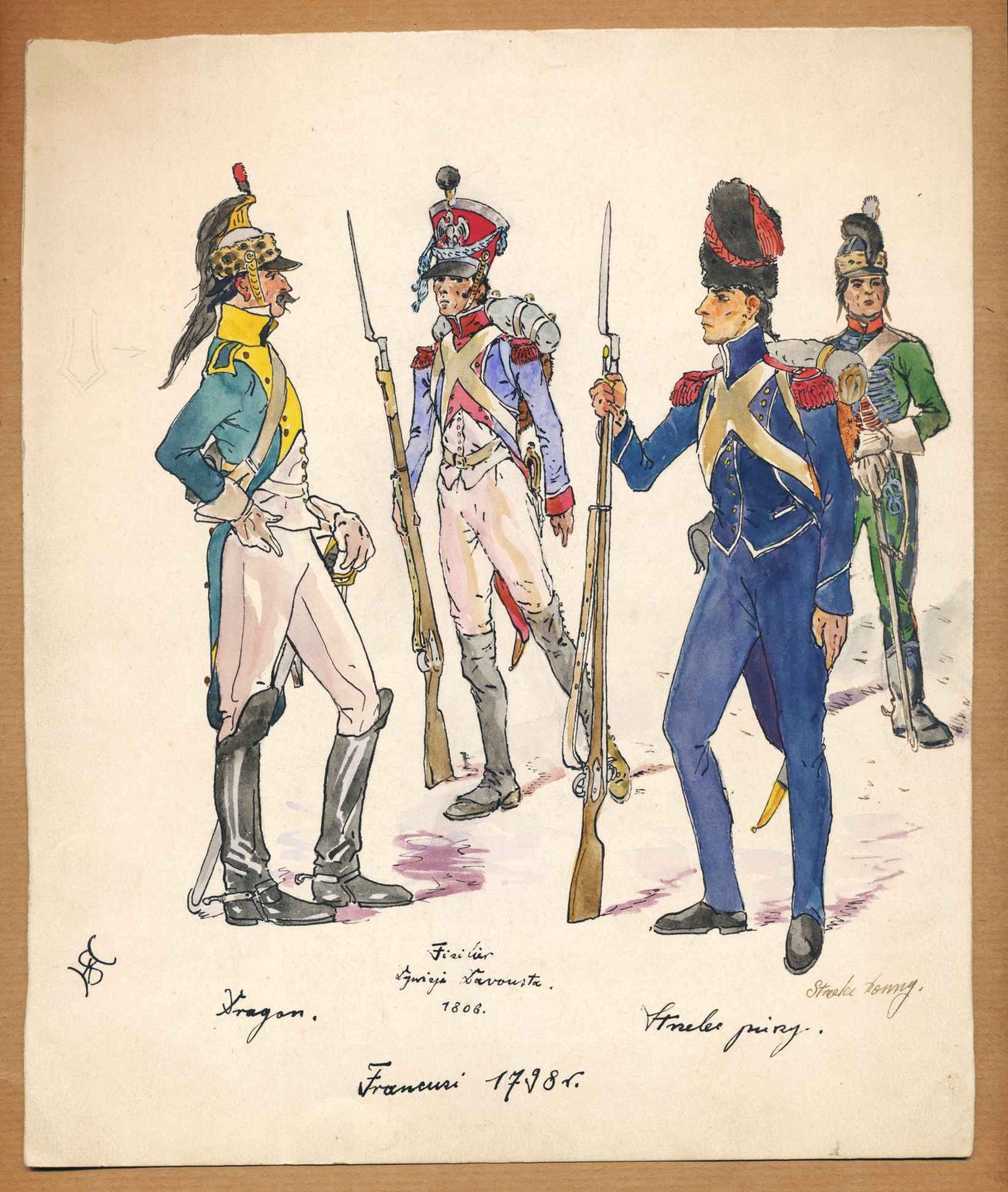 1798 ARMIA NAPOLEONA, 4 postacie, akwarela, wymiar 198x230mm, oryginał, sygnowana.