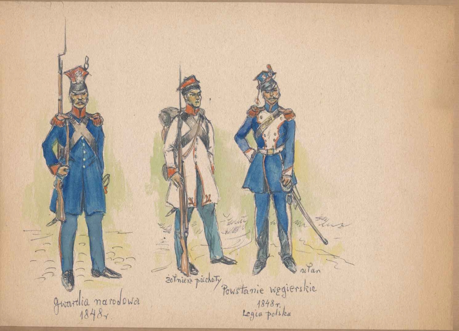 1848 POWSTANIE WĘGIERSKE, LEGI APOLSKA GENERAŁA JÓZEFA BEMA, 3 postacie, akwarela, wymiar 295x218mm, oryginał.