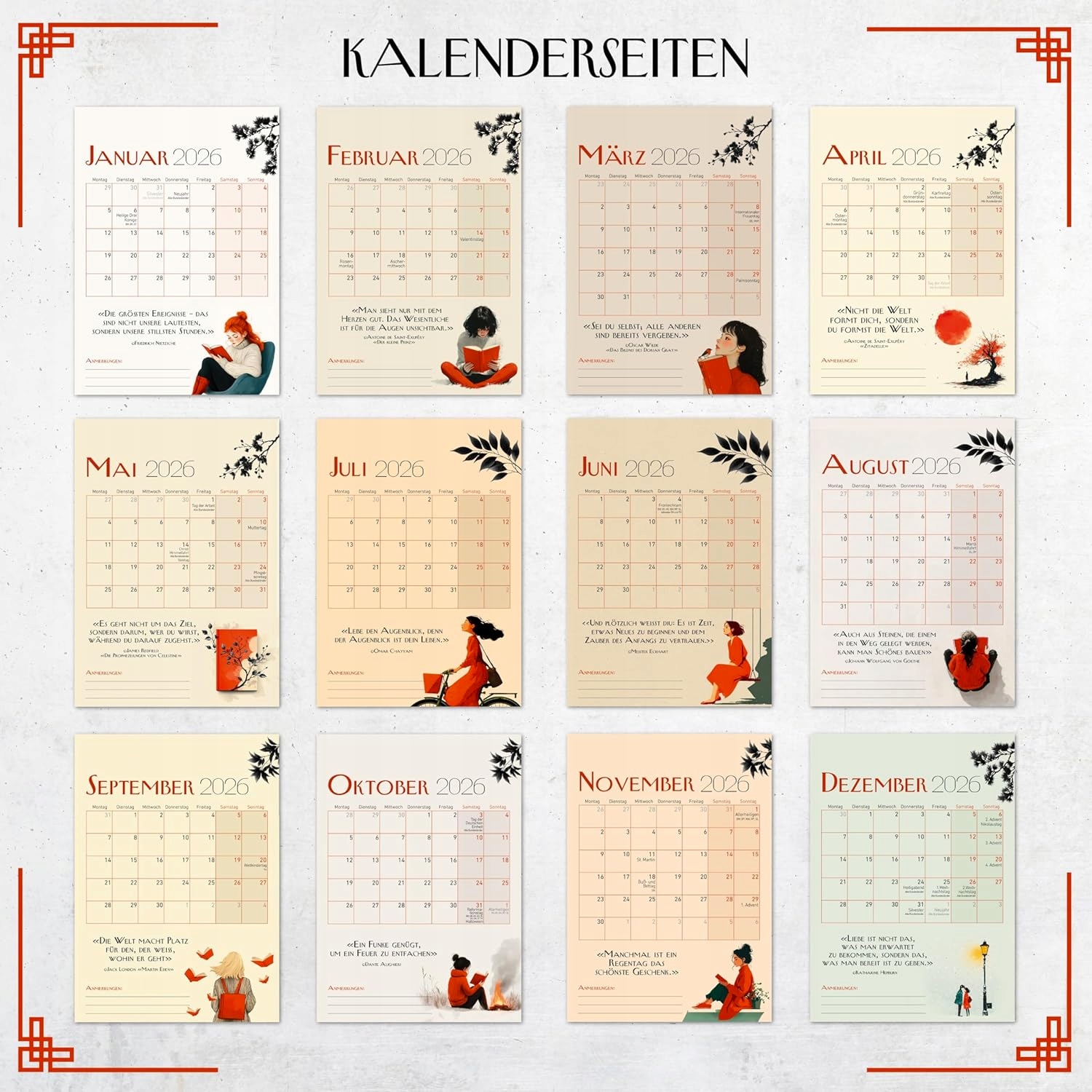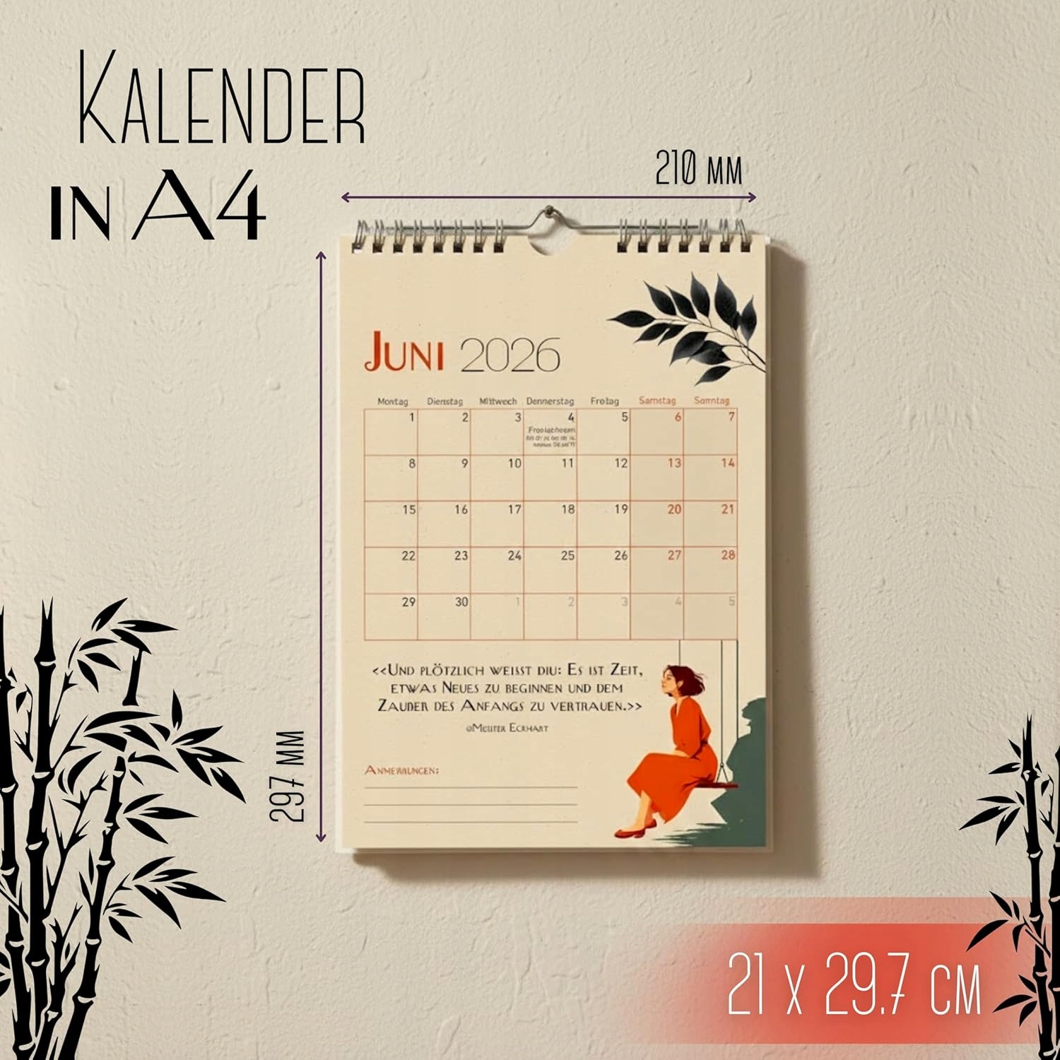 Praktyczny kalendarz ścienny w formacie A4 (21,0 x 29,7 cm) od marki E&G Klasse. Wykonany z mocnego papieru 250 g i spiralnego wiązania, co ułatwia przewracanie stron. Każdy miesiąc ma oddzielną stronę oraz dużo miejsca na notatki. W zestawie inspirujące cytaty, krótkie sentencje i afirmacje, a także wskazówki dotyczące świąt i wakacji.