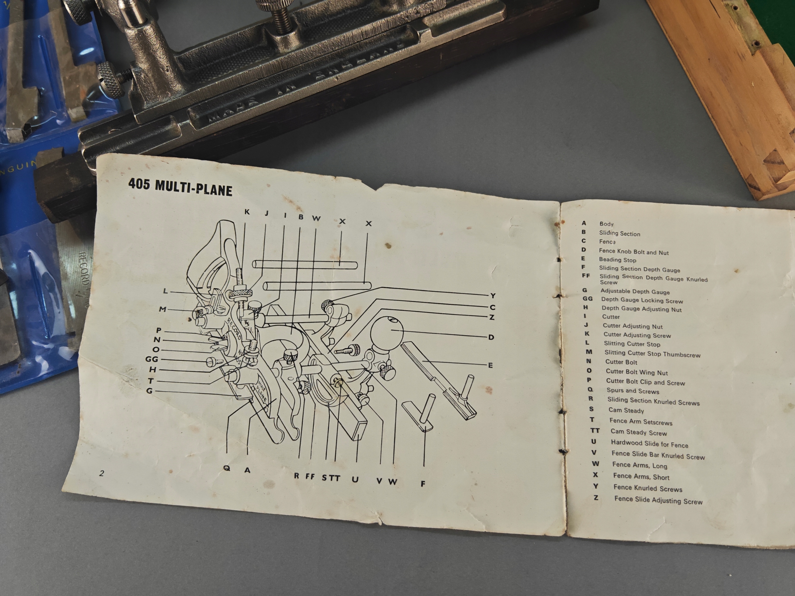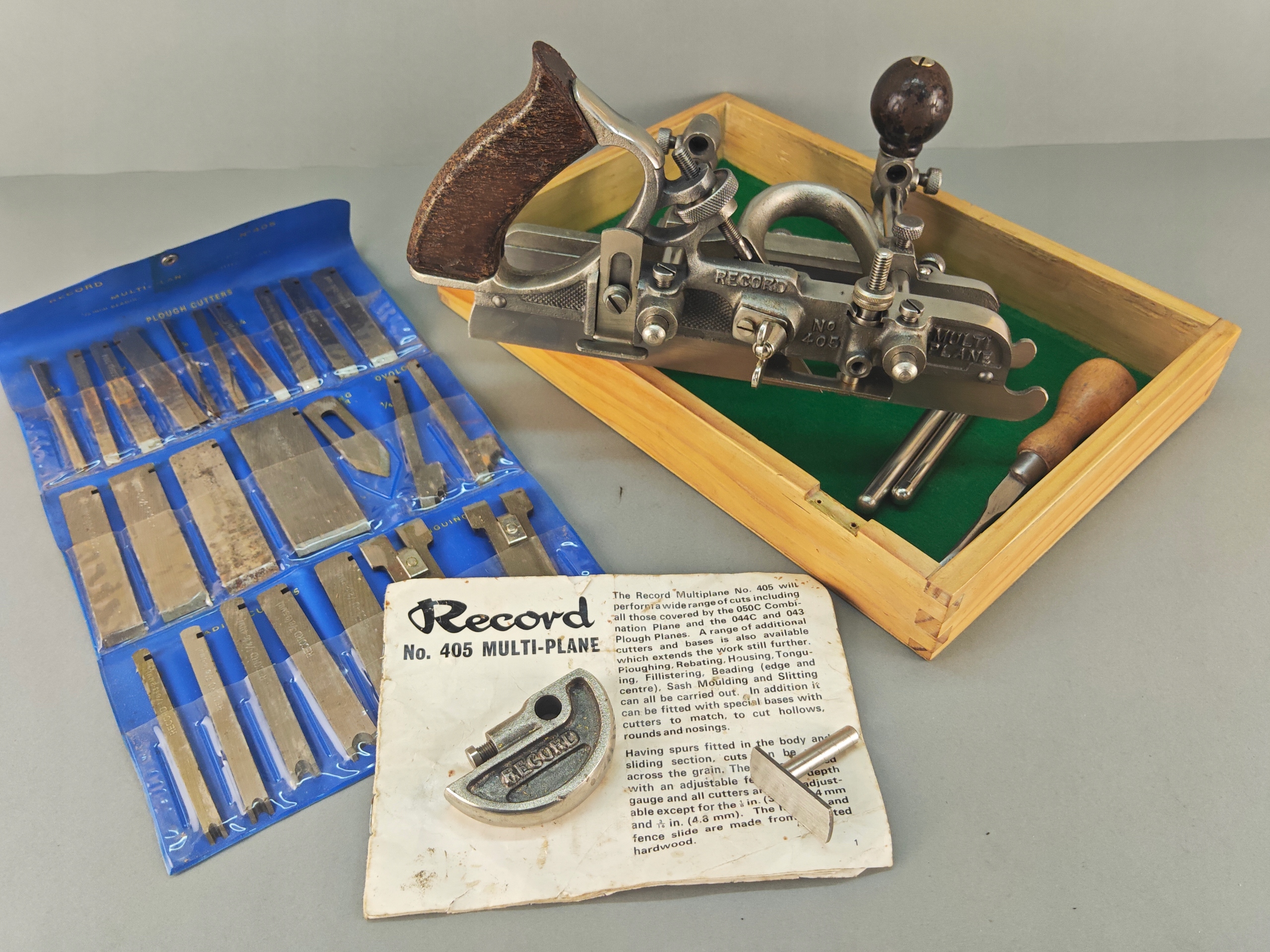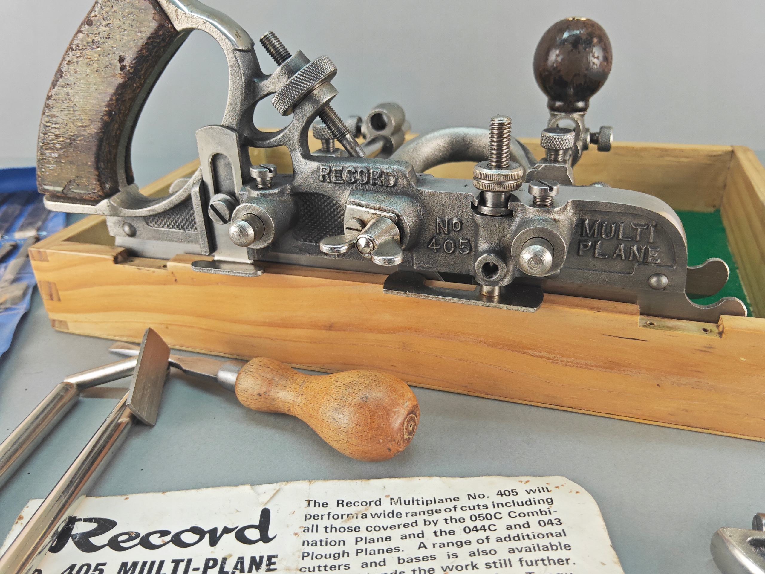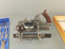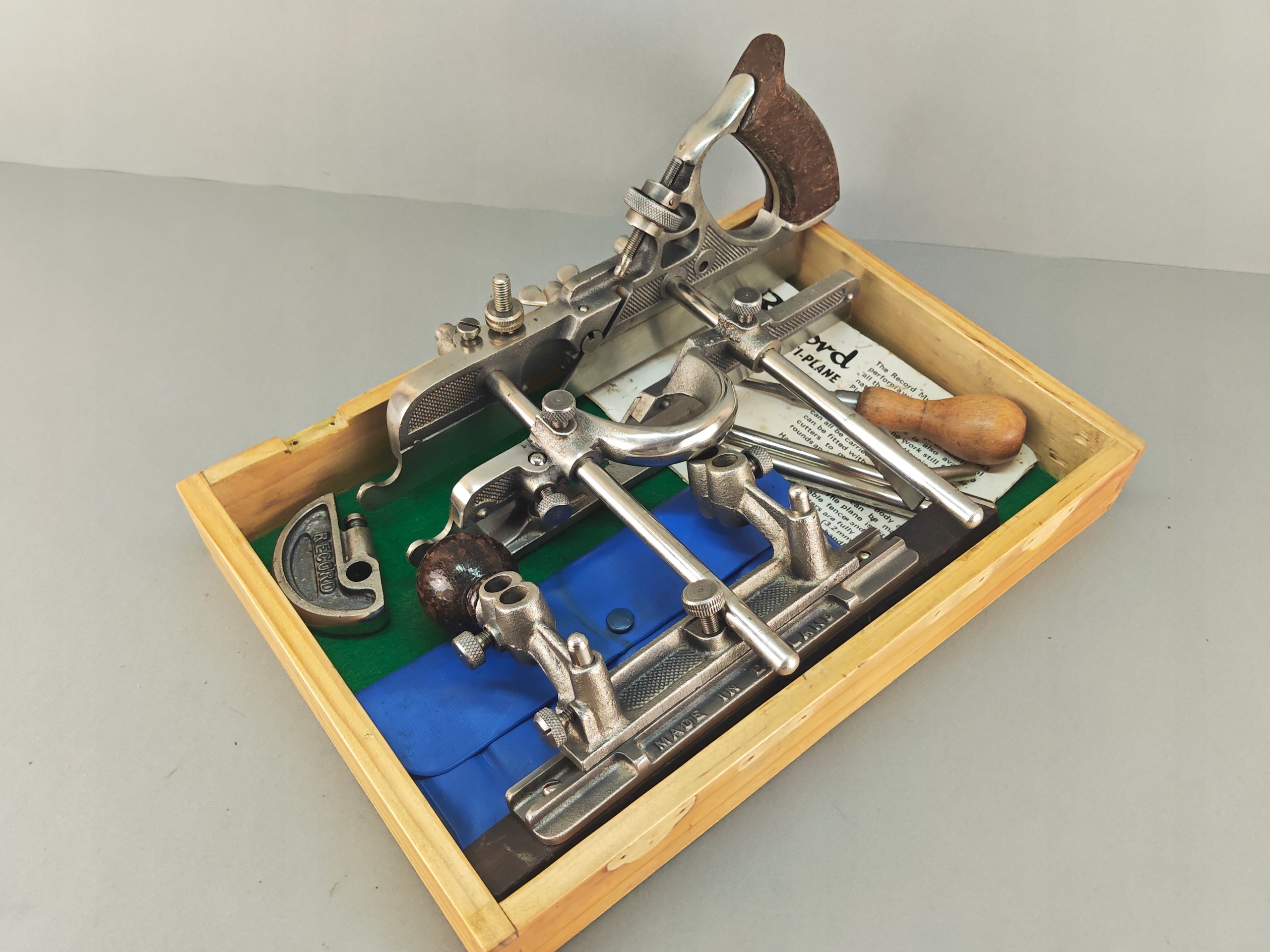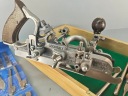 Ładny profesjonalny egzemplarz, kompletny, bardzo mało używany, znakomita angielska firma RECORD, model no 405, jest to najlepszy i największy model z tak zwanych strugów kombinowanych na wymienne ostrza, wszystko w bardzo dobrym stanie, nic nie brakuje,, metalowe elementy całe żadnych pęknięć ani uszczerbków, wszystkie śruby, mechanizmy regulacji działają poprawnie, dwa rozmiary prowadnic dłuższe i krótkie. Ostrza w idealnym stanie, najprawdopodobniej nigdy nie używane, orginalny smar. Ostrza 24 sztuk. Instrukcja obsługi. Stare oryginalne narzędzie.