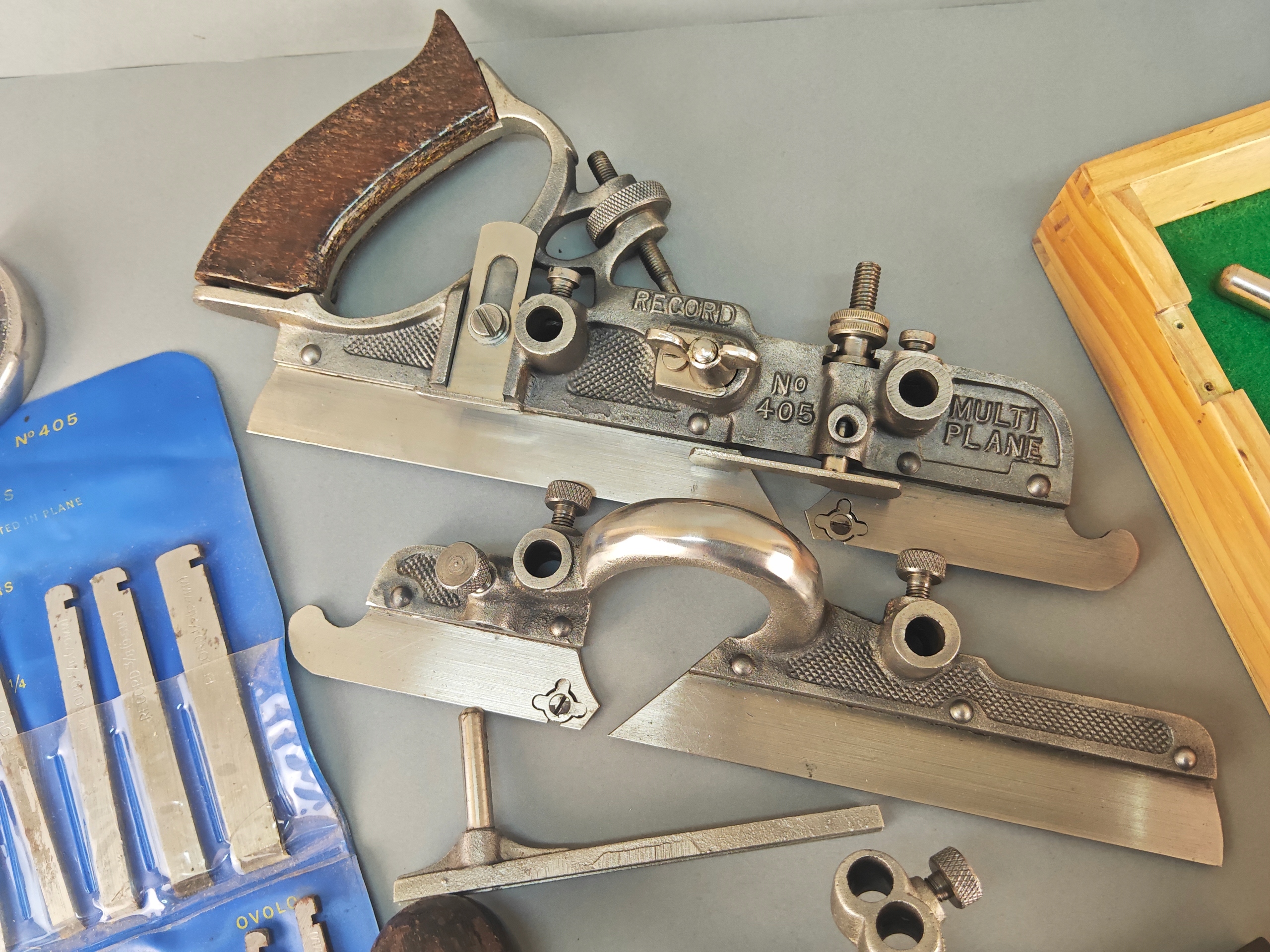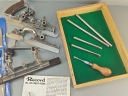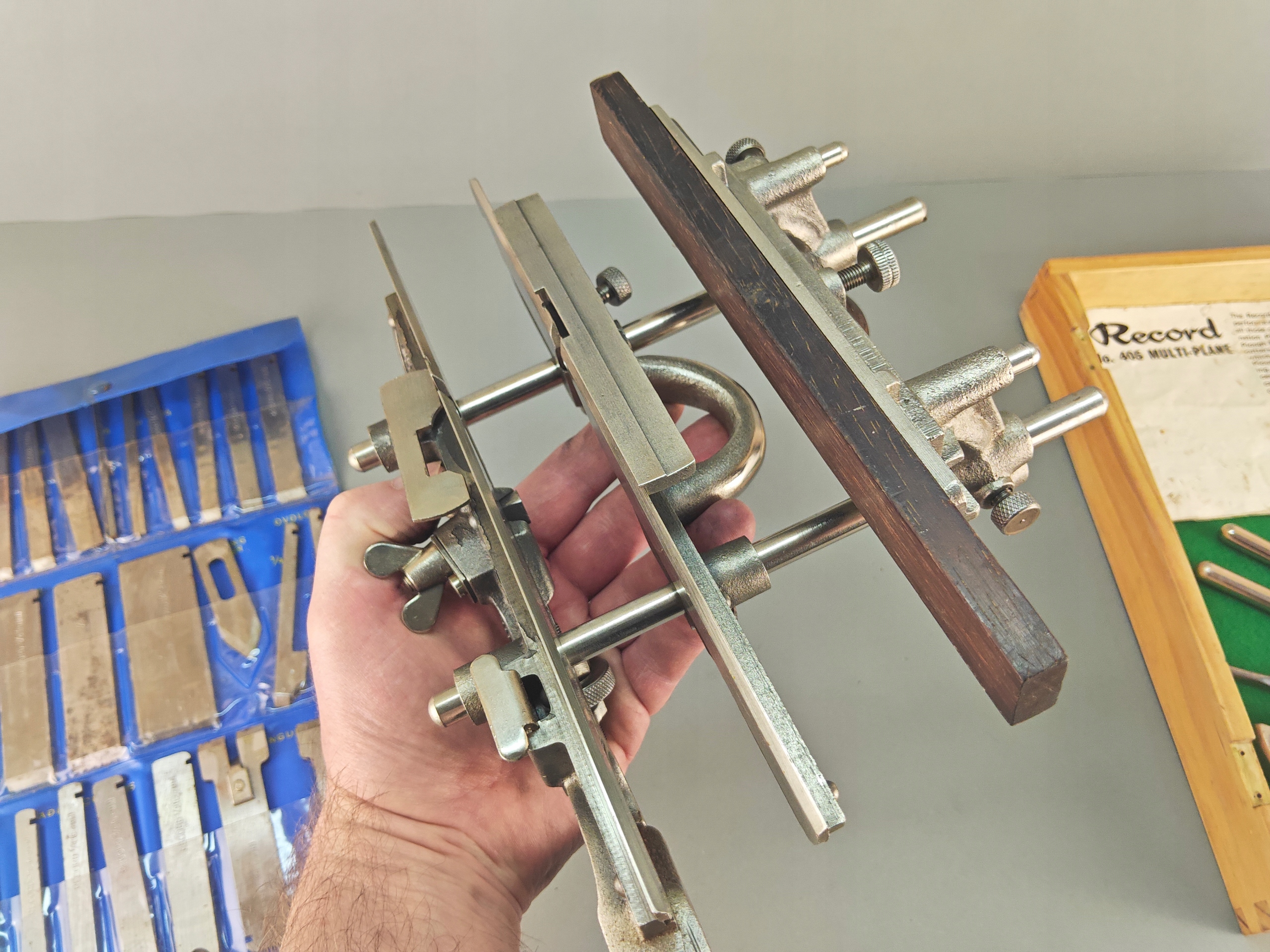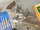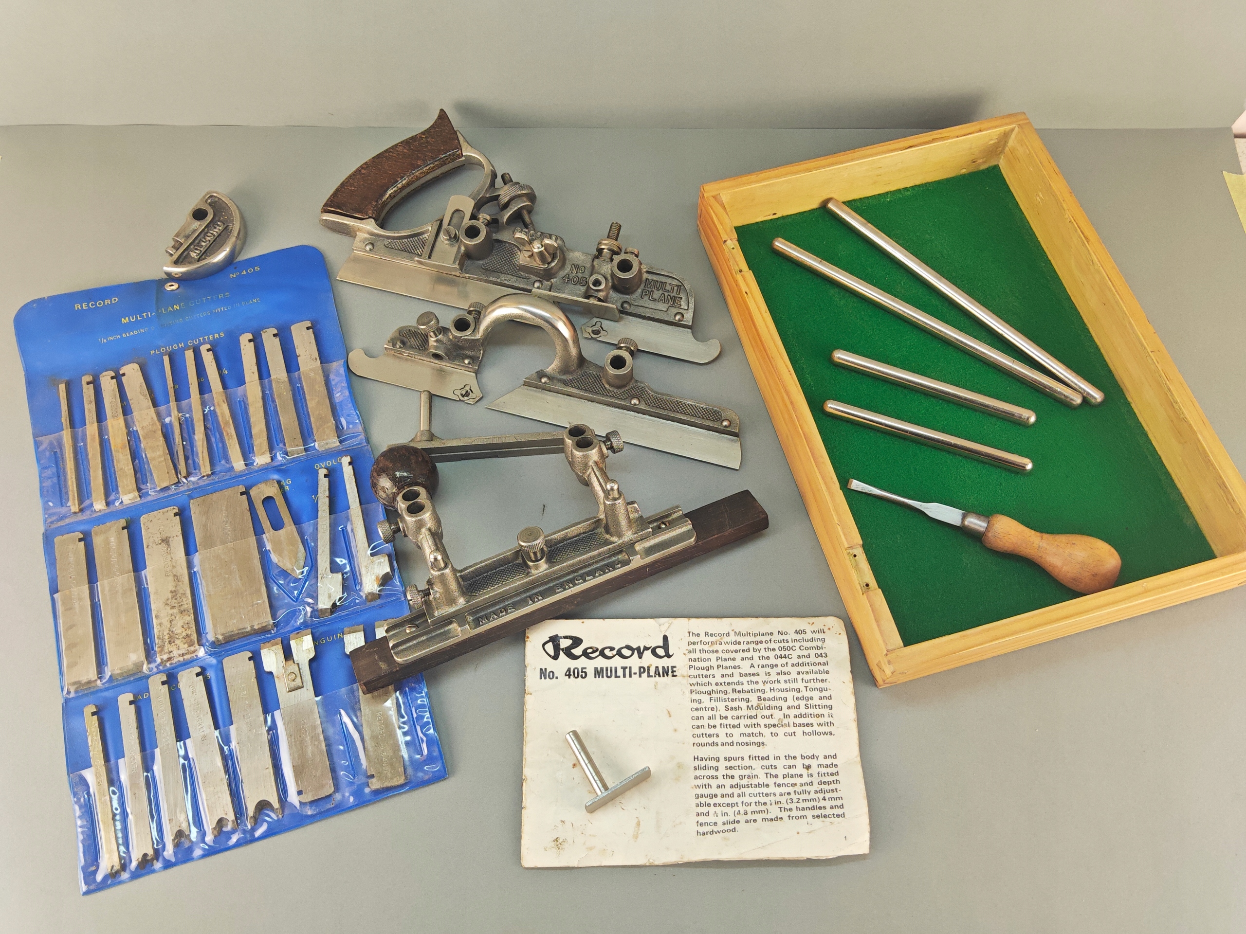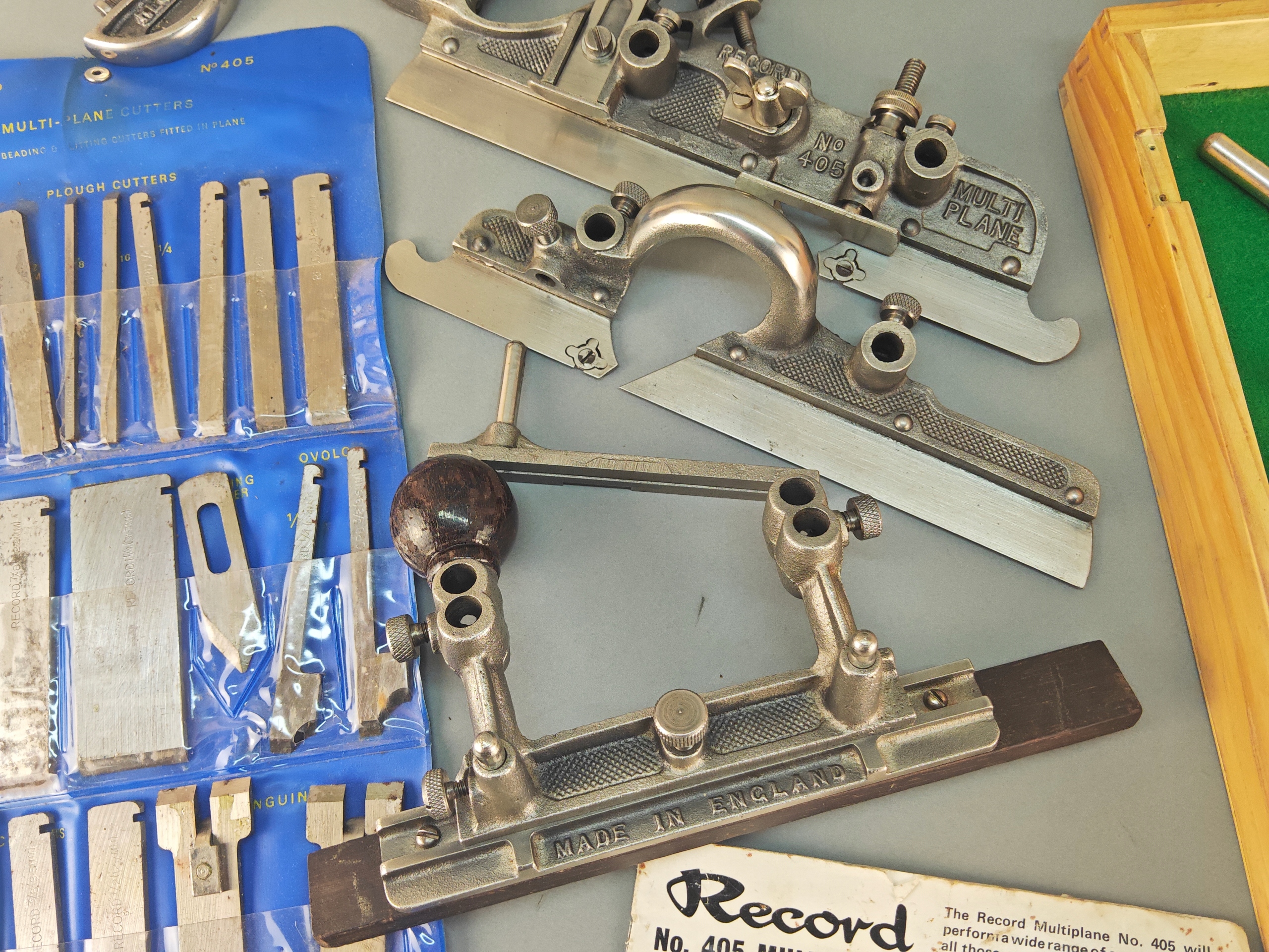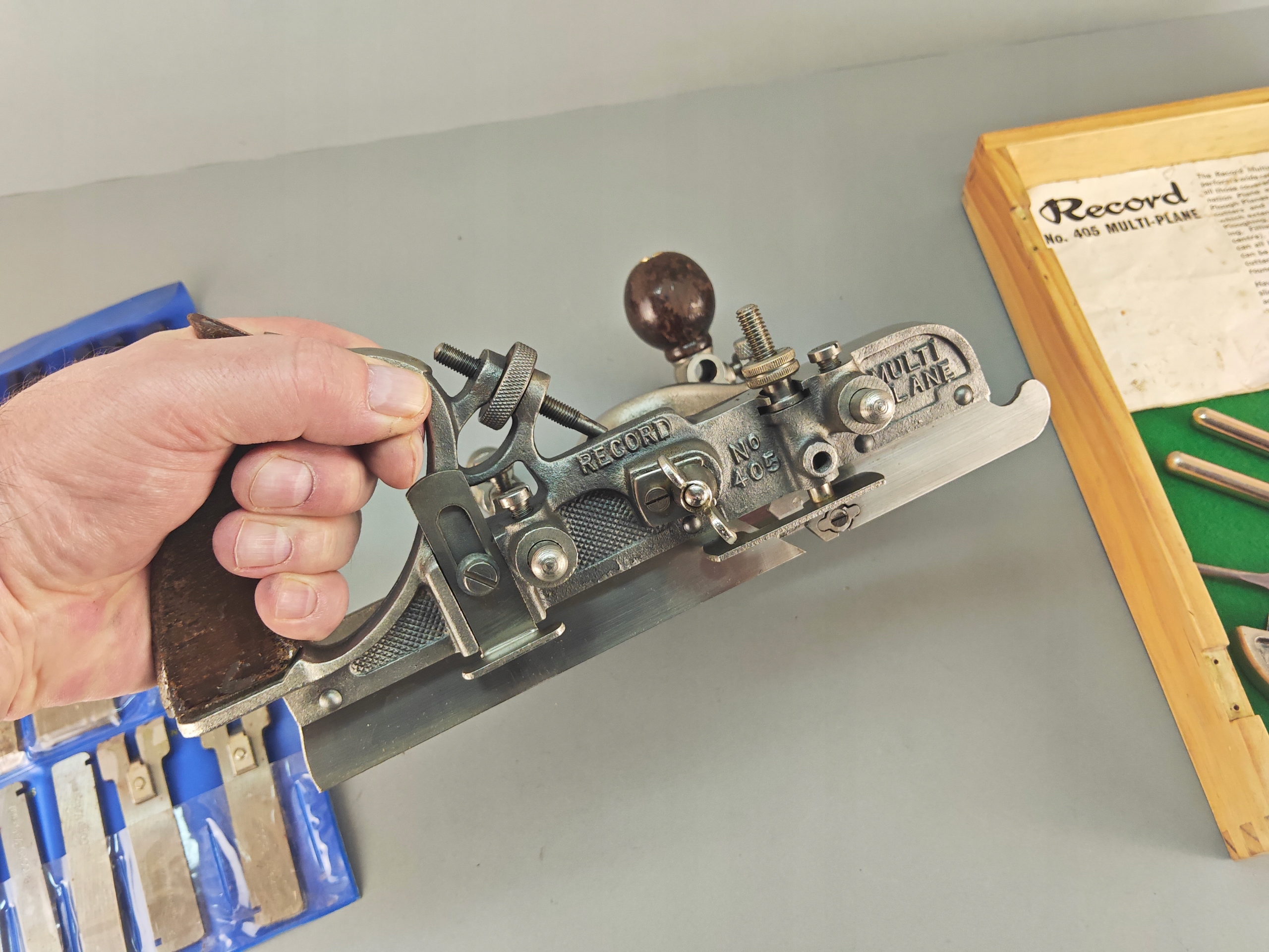 Ładny profesjonalny egzemplarz, kompletny, bardzo mało używany, znakomita angielska firma RECORD, model no 405, jest to najlepszy i największy model z tak zwanych strugów kombinowanych na wymienne ostrza, wszystko w bardzo dobrym stanie, nic nie brakuje,, metalowe elementy całe żadnych pęknięć ani uszczerbków, wszystkie śruby, mechanizmy regulacji działają poprawnie, dwa rozmiary prowadnic dłuższe i krótkie. Ostrza w idealnym stanie, najprawdopodobniej nigdy nie używane, orginalny smar. Ostrza 24 sztuk. Instrukcja obsługi. Stare oryginalne narzędzie.