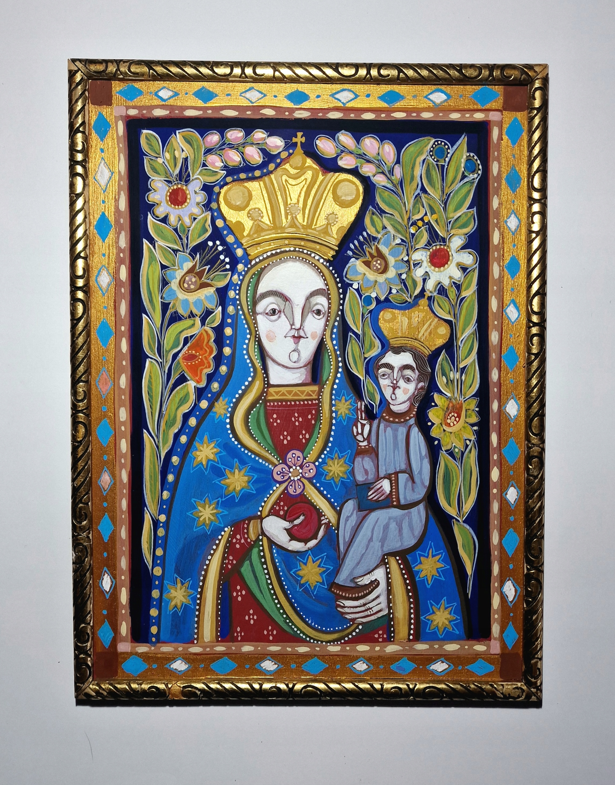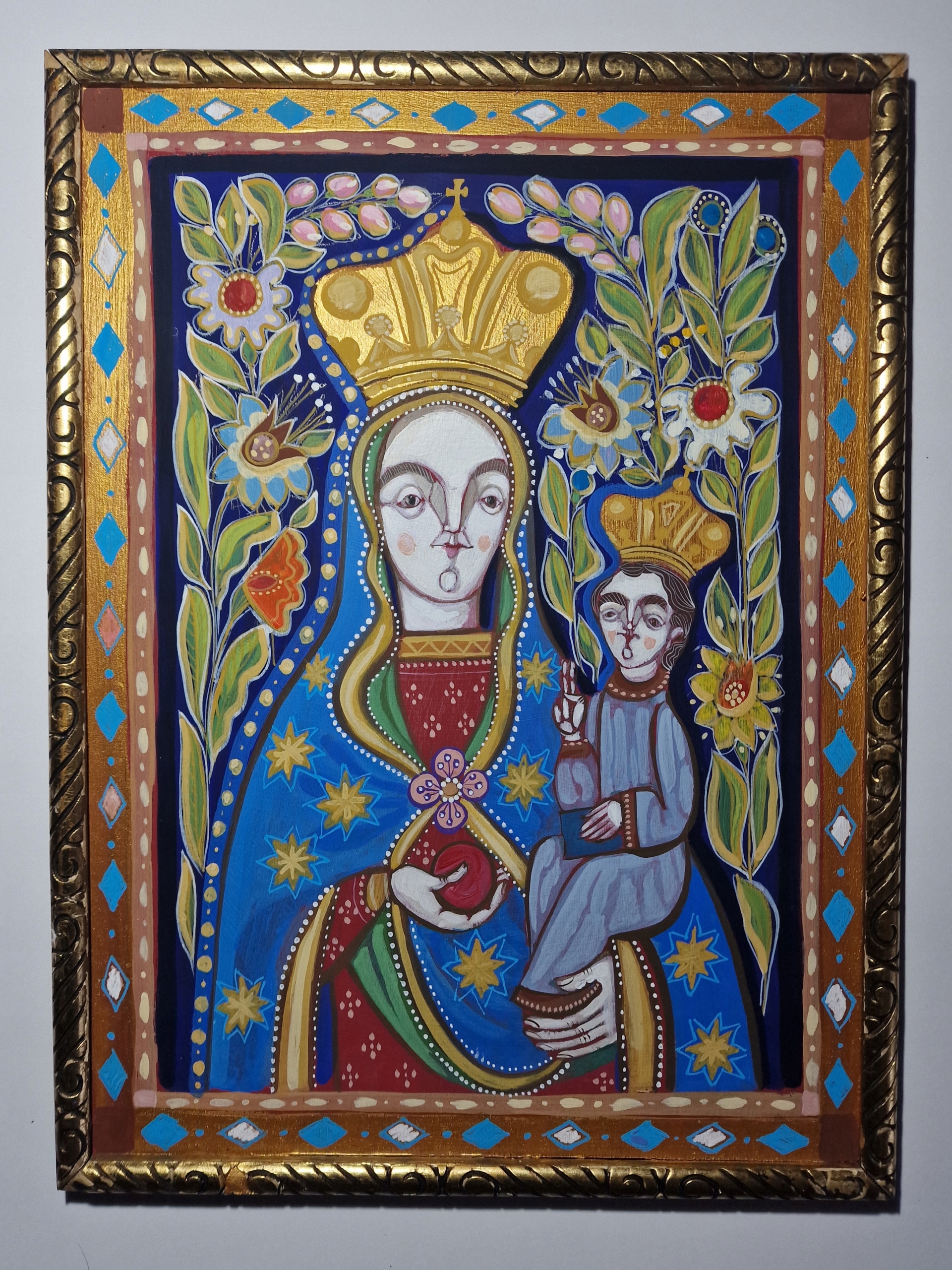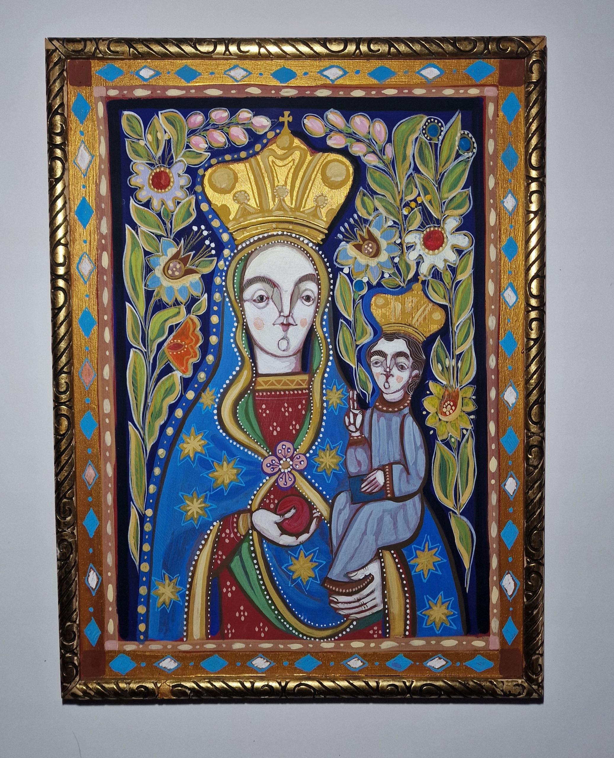 Monika Kwiecińska (1982), graduate of the Academy of Fine Arts in Warsaw, has years of experience painting religious-themed work.She is also at ease with synthesized easel painting.However, her most prominent passion and joy is creating work inspired by Polish folk art, full of warmth, simplicity, a wealth of color and symbolism.What distinguishes her work from others is the creation of each piece from the very basics: carefully selected canvases and frames make this artists‘ pieces unique and exceptional.