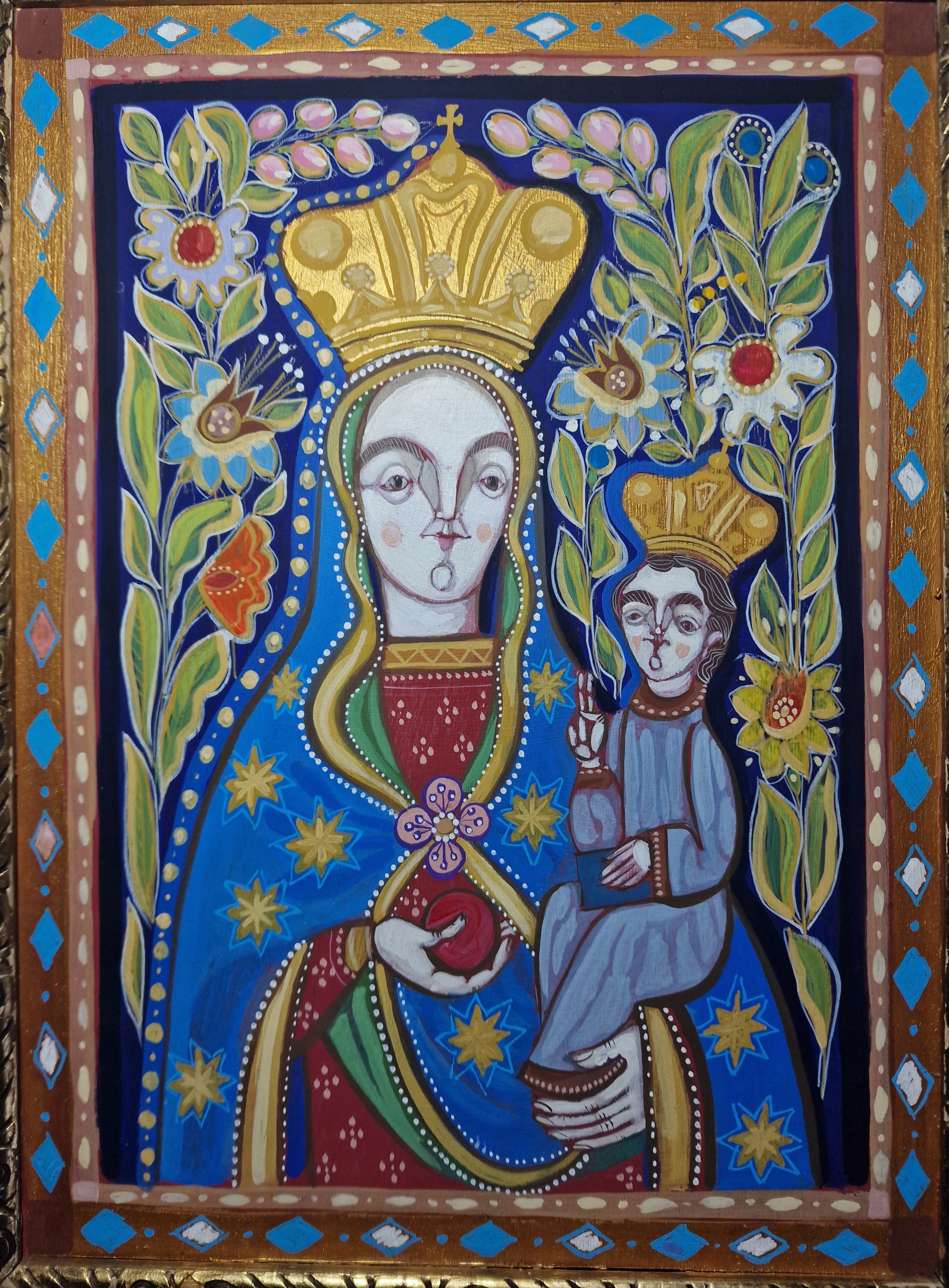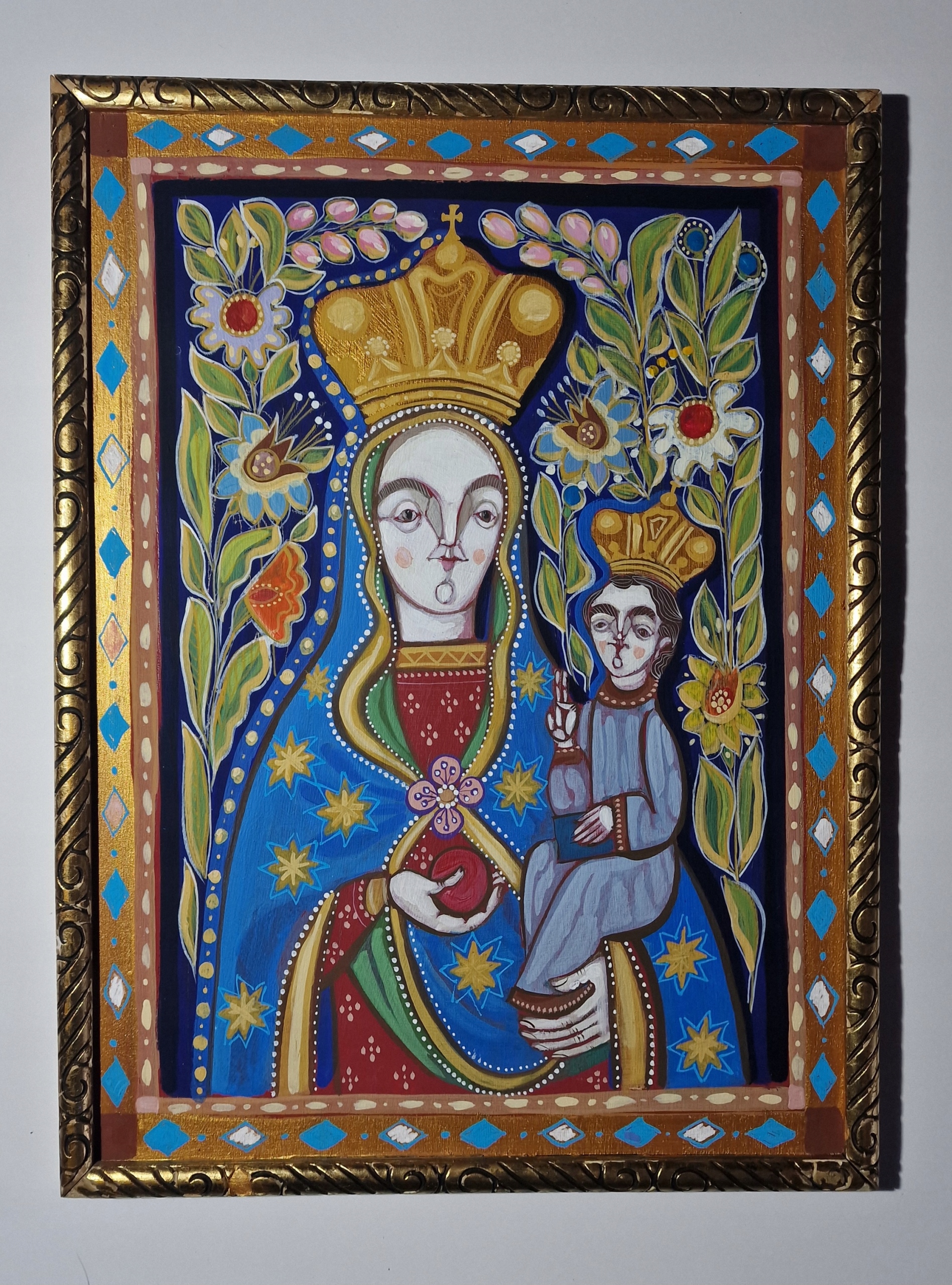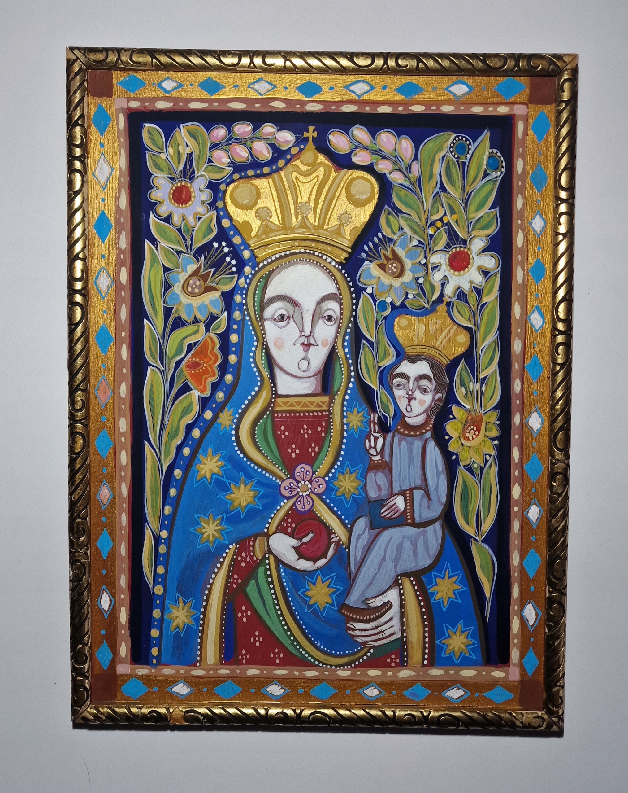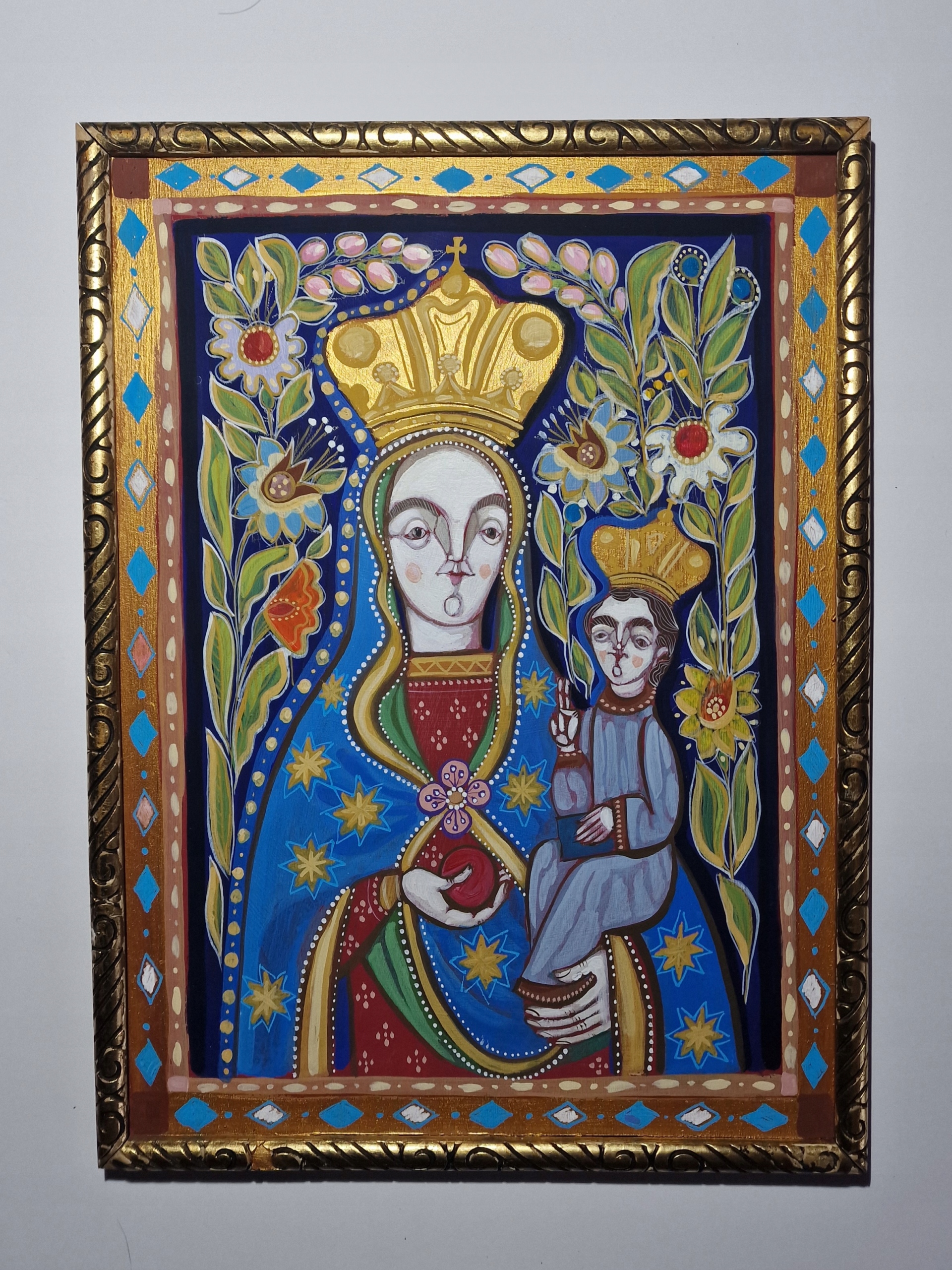Monika Kwiecińska (1982), graduate of the Academy of Fine Arts in Warsaw, has years of experience painting religious-themed work.She is also at ease with synthesized easel painting.However, her most prominent passion and joy is creating work inspired by Polish folk art, full of warmth, simplicity, a wealth of color and symbolism.What distinguishes her work from others is the creation of each piece from the very basics: carefully selected canvases and frames make this artists‘ pieces unique and exceptional.