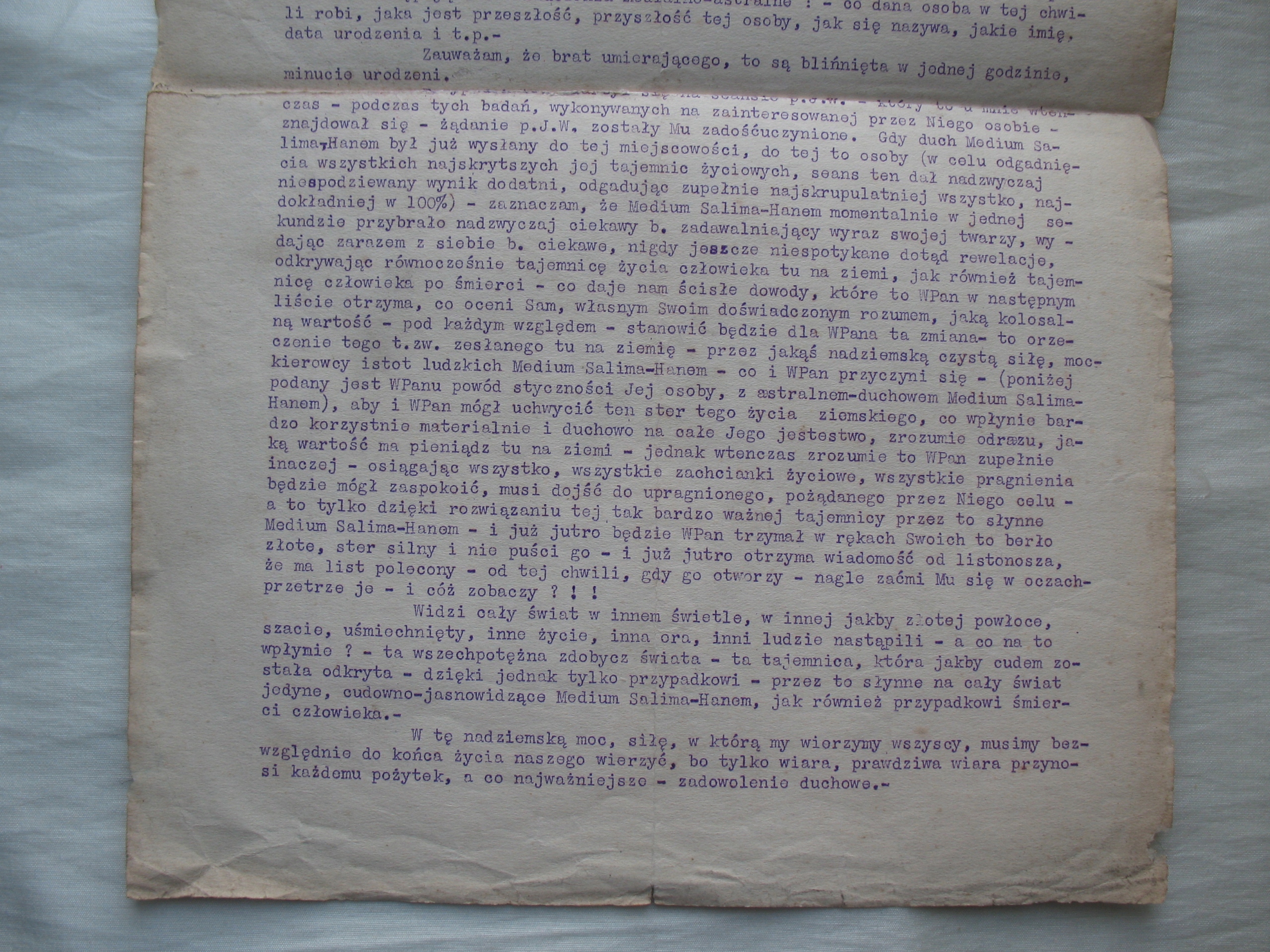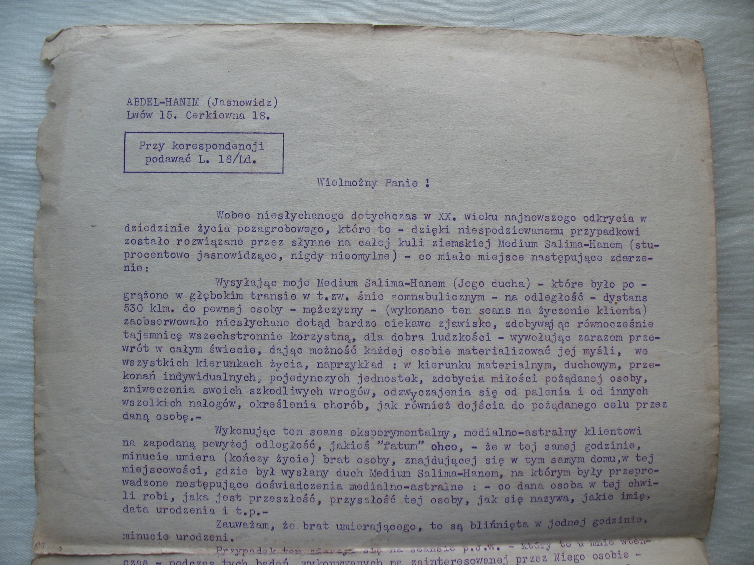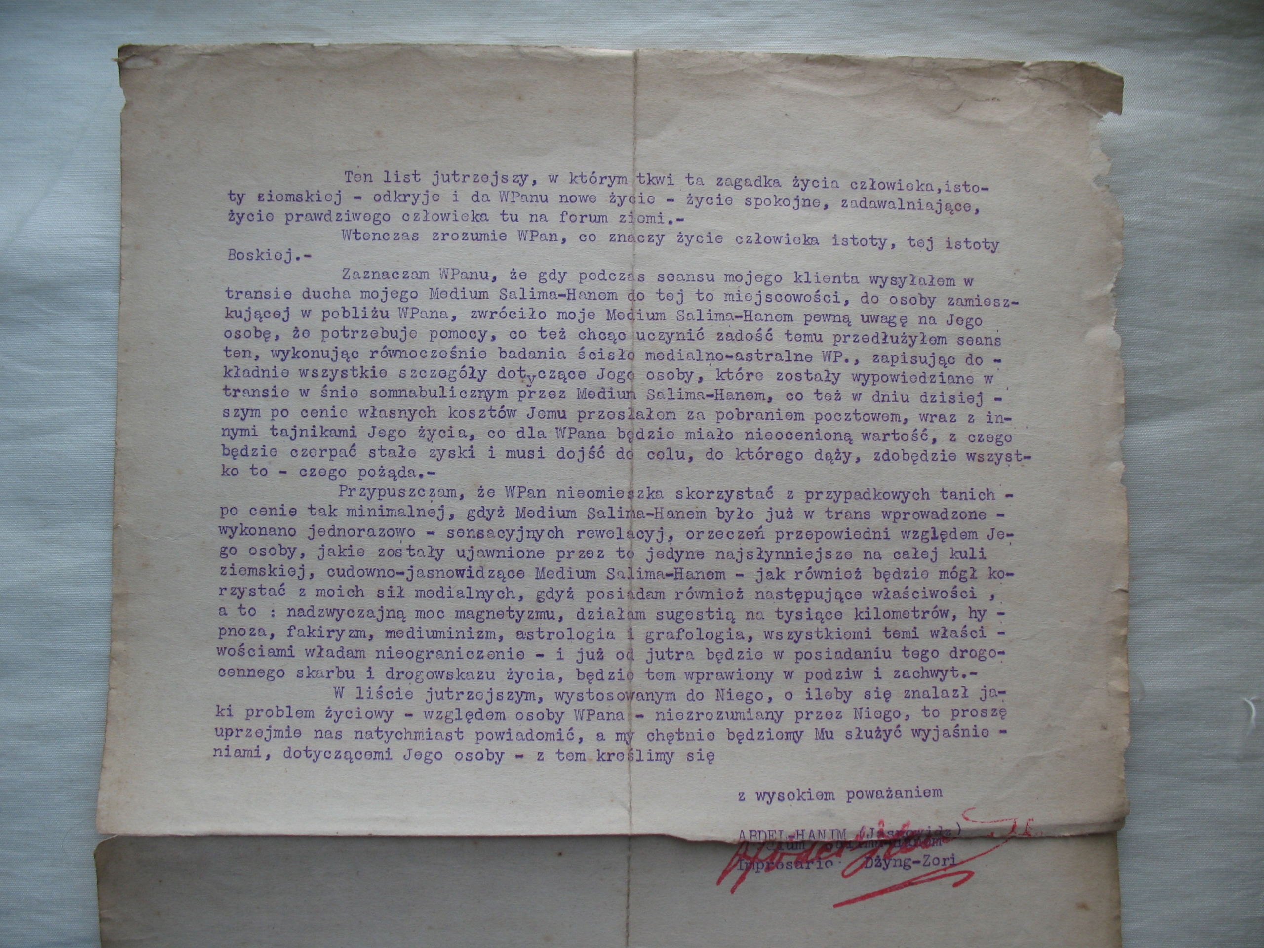 Stary, oryginalny, przedwojenny dokument: list jasnowidza Abdel-Hanim ze Lwowa do potencjalnego klienta. Oryginał. Datowanie: lata międzywojenne. Wymiary: 220 x 340 mm. Stan zachowania: według mnie -db/+dst, ślady złożenia na 4 części, niewielkie zabrudzenia, nadgięcia, naddarcia na złożeniach, ubytki na obrzeżach, wszystko widoczne na skanach. Zapraszam do zakupów.
