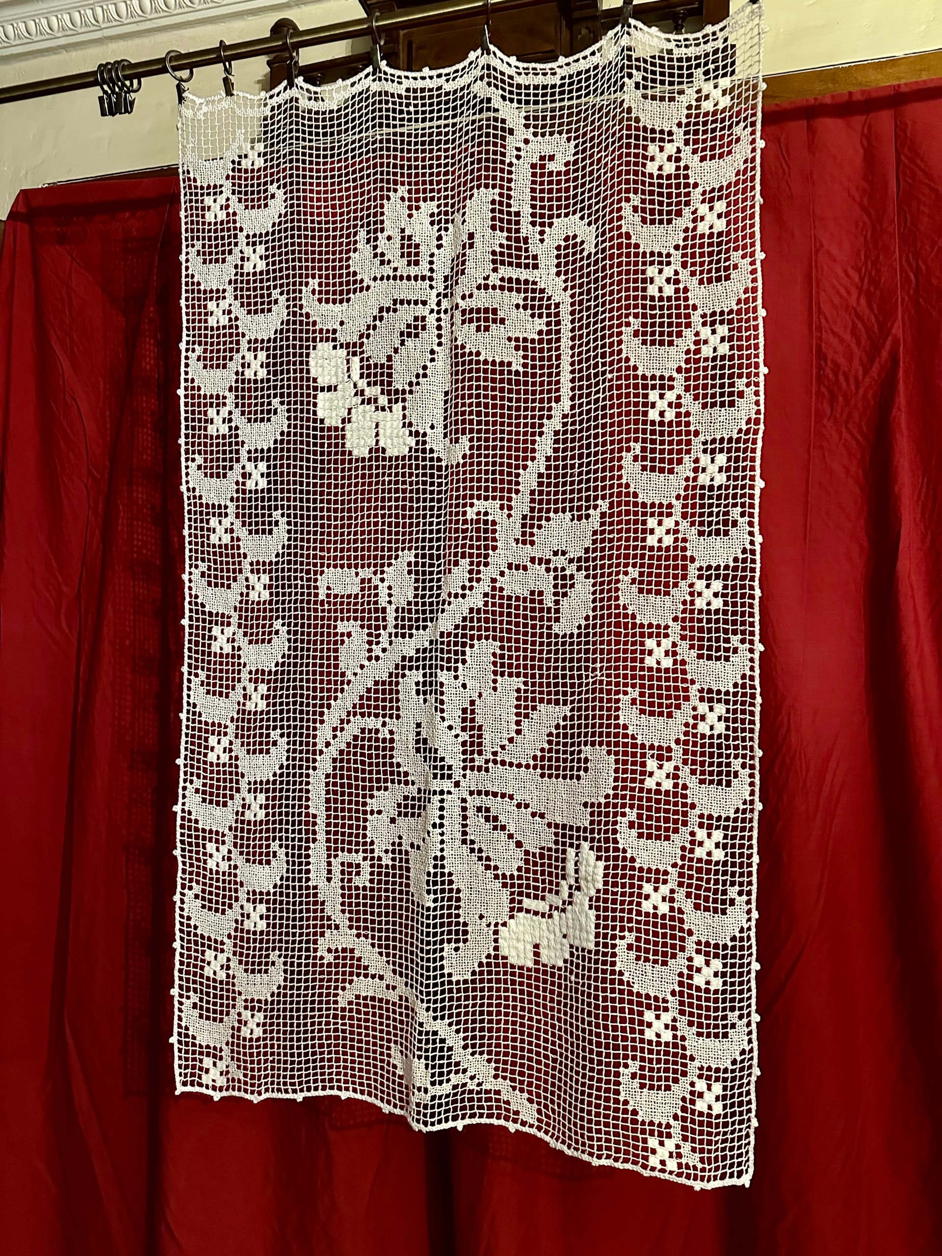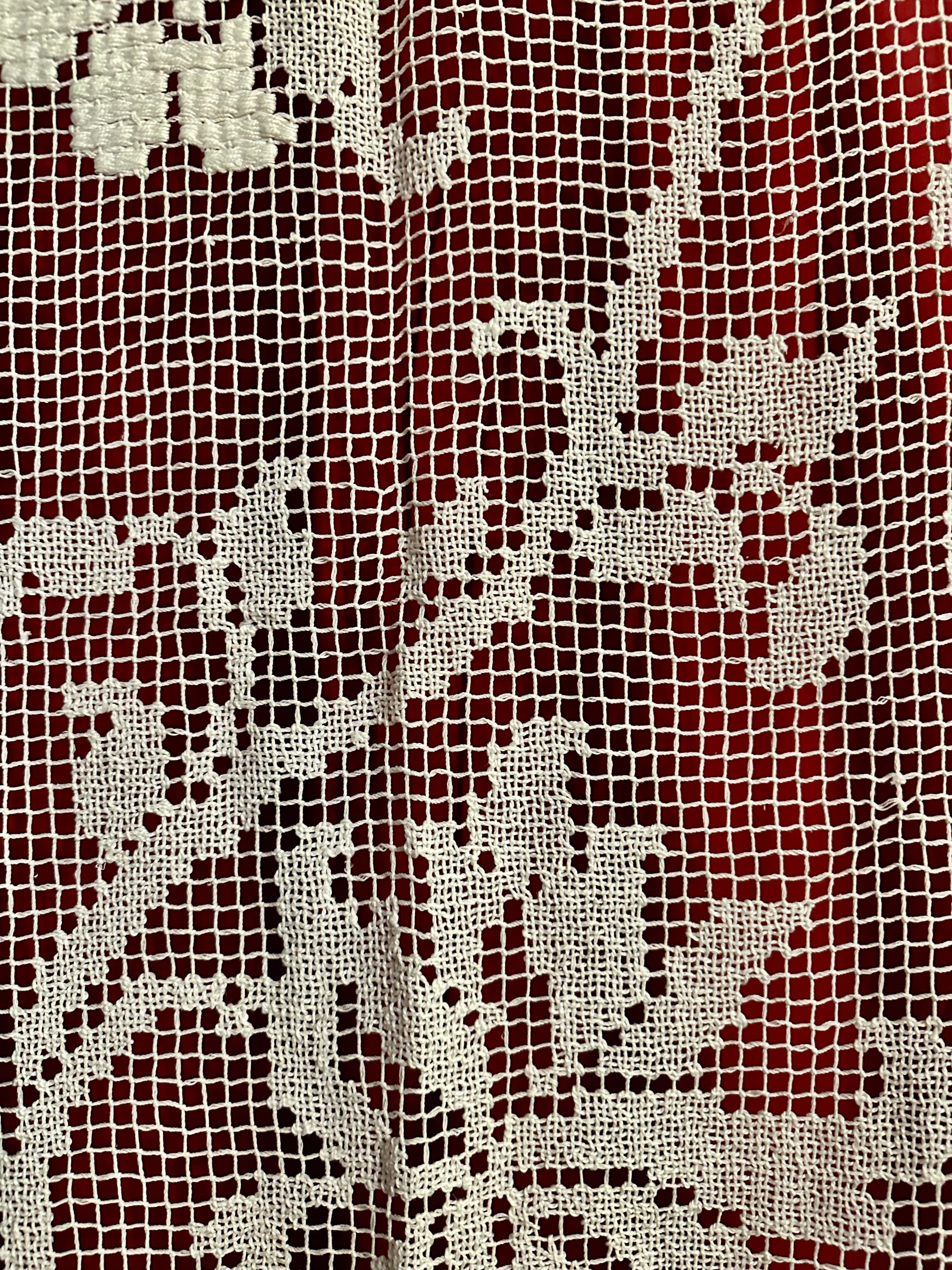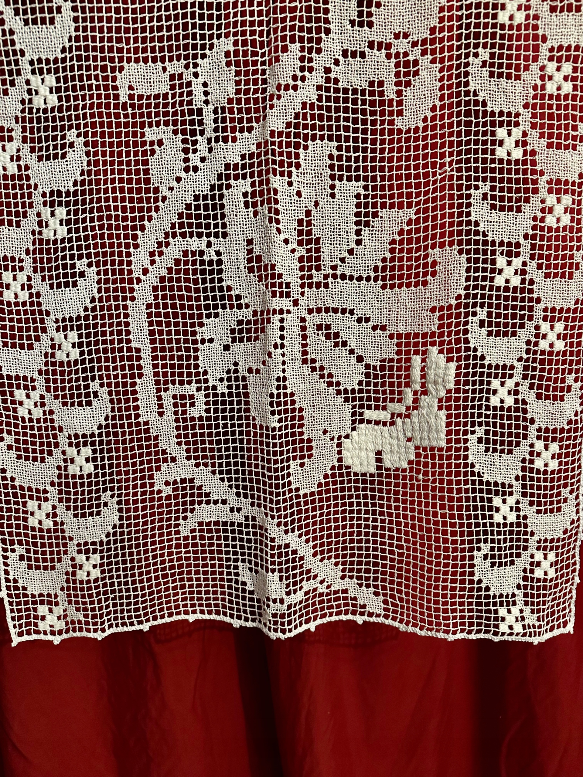 Wyjątkowej urody firaneczka-panel wykonana ręcznie techniką filet (haft na siatce). W bardzo dobrym stanie. Wykonana z bawełnianych nici w kolorze białym.