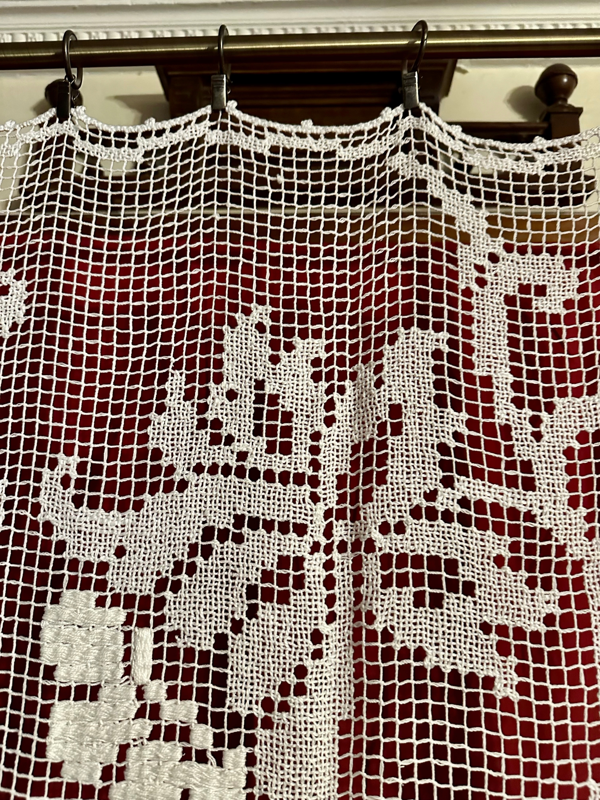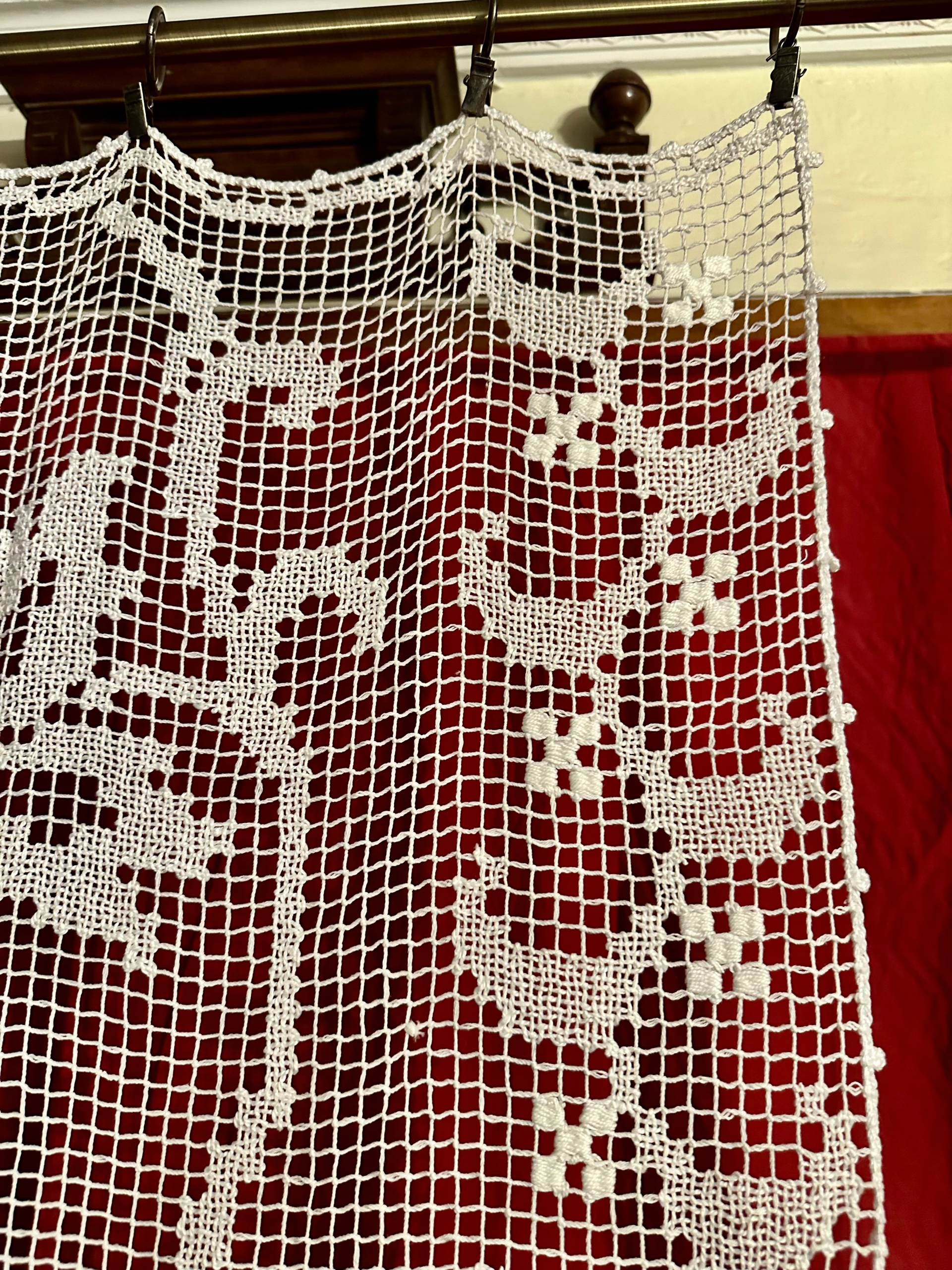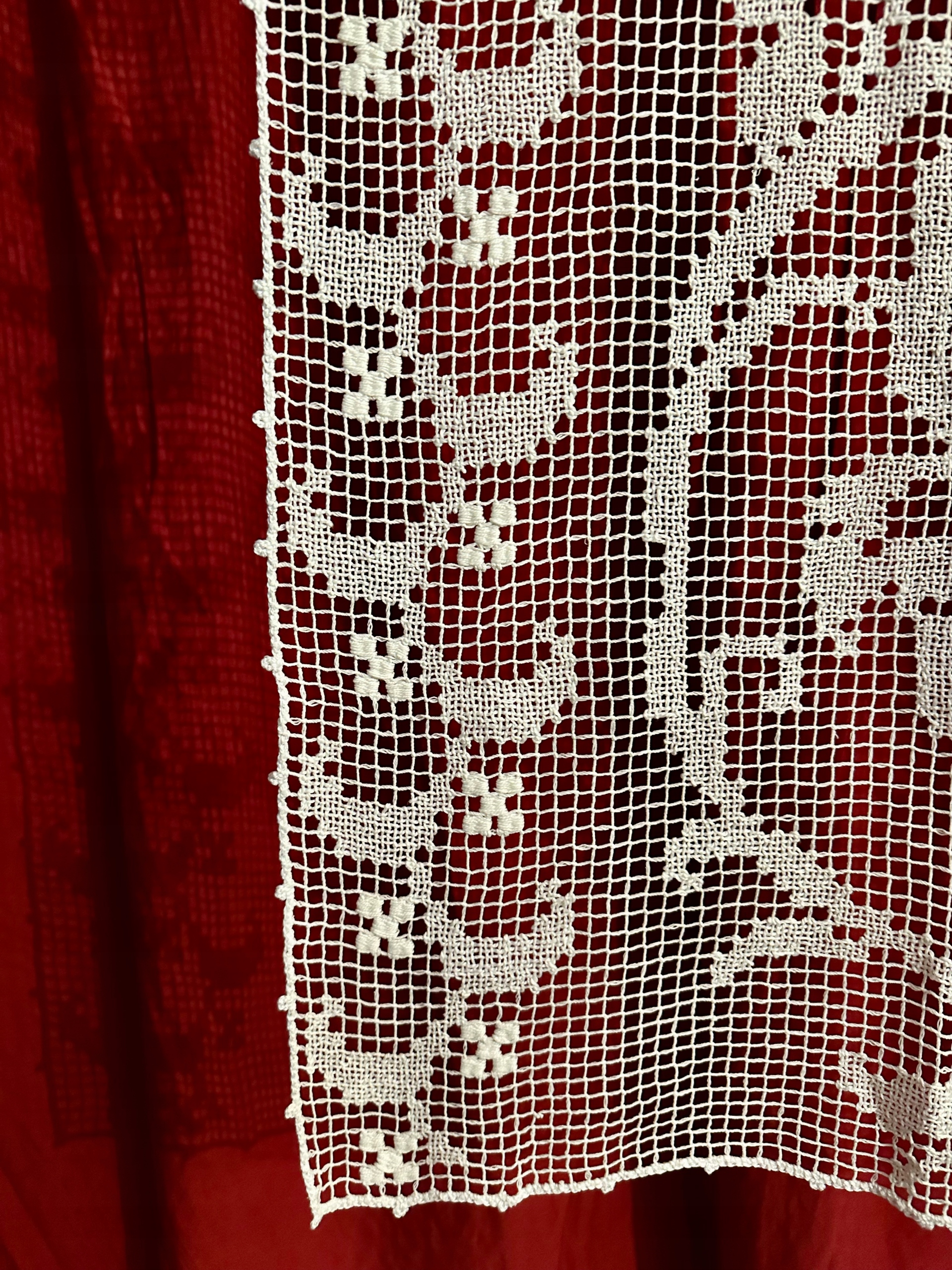 Wyjątkowej urody firaneczka-panel wykonana ręcznie techniką filet (haft na siatce). W bardzo dobrym stanie. Wykonana z bawełnianych nici w kolorze białym.