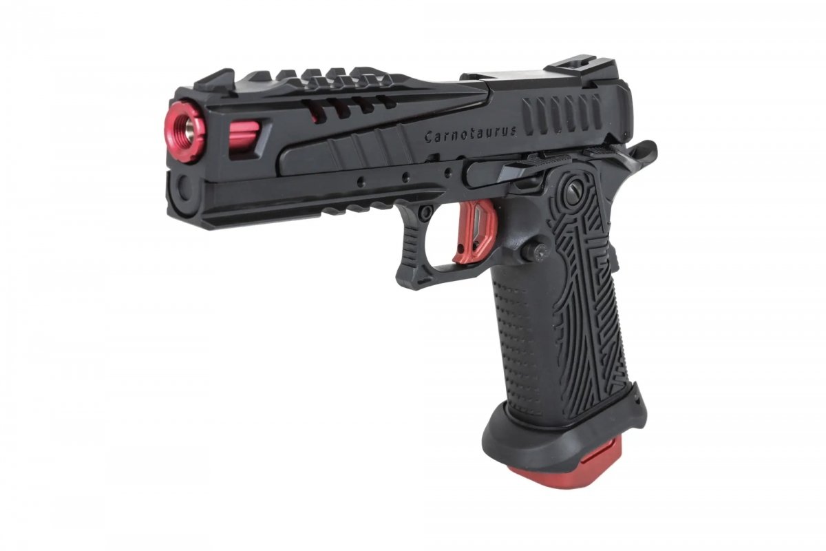 Pistolet airsoftowy zasilany green gasem od firmy ICS został wykonany przy wykorzystaniu m.in. aluminium oraz tworzywa sztucznego. Z aluminium wykonano zamek typu Split-Slide (co pozwoli na zmniejszenie zużycia gazu i większą celność repliki), który posiada elegancki napis Carnotaurus, żebrowania, które ułatwią obsługę pistoletu nawet, gdy użytkownik nosi rękawiczki, szynę RIS, która znajduje się pod lufą - pozwoli na montaż np. latarki lub lasera, magazynek, lufę zewnętrzną, obustronny bezpiecznik skrzydełkowy. Pistolet posiada również bezpiecznik w chwycie pistoletowym - uniemożliwi oddanie niekontrolowanego strzału.