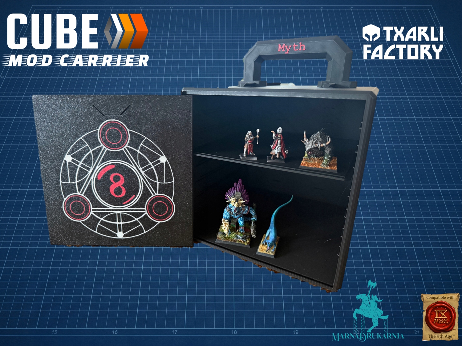 Oferujemy zestaw Cube Mod Carrier Small autorstwa Txarli Factory, wydrukowany na drukarce filamentowej z PLA. Wymiary wewnętrzne korpusu: wysokość 204 x szerokość 204 x długoość 213mm.