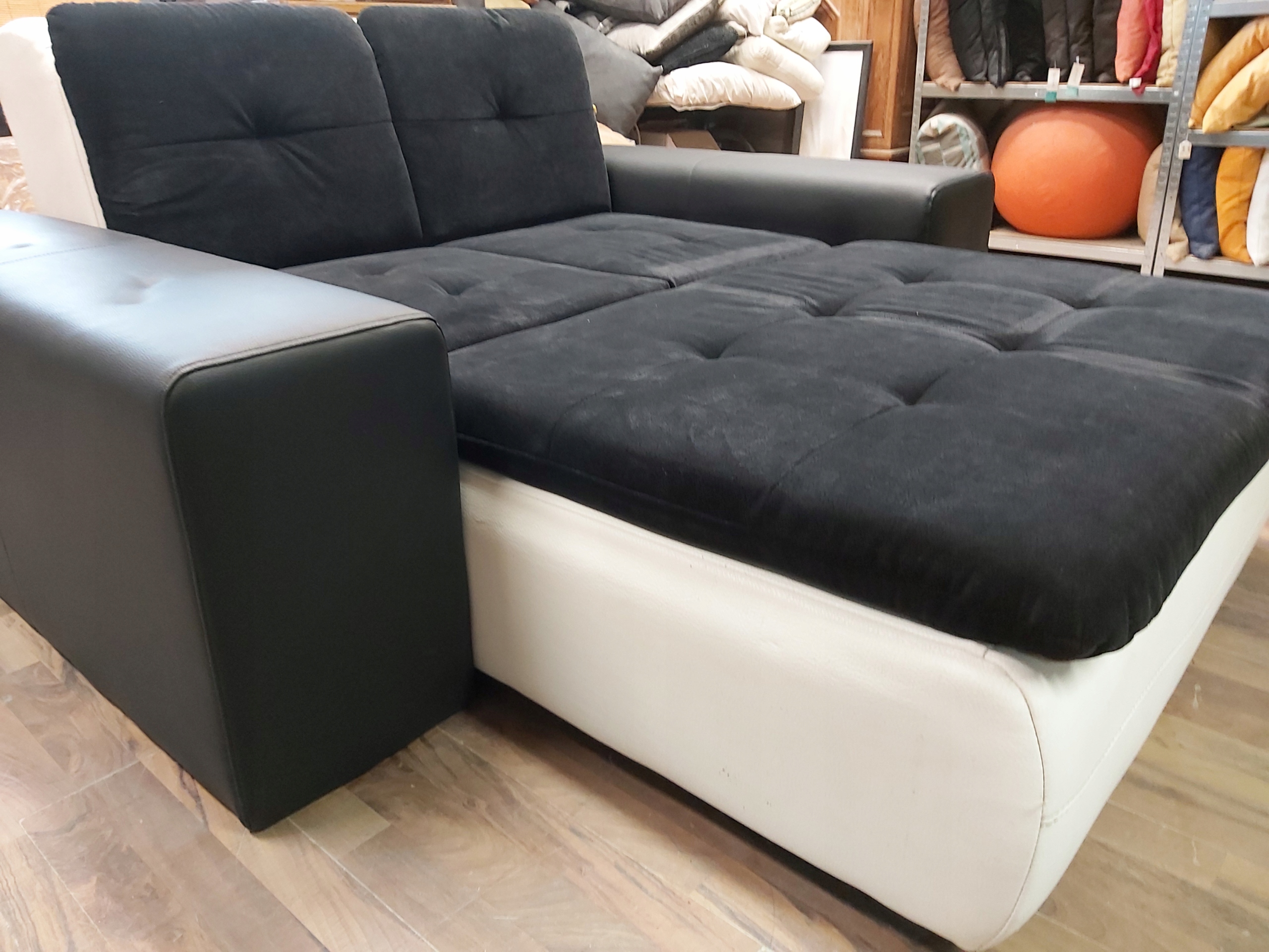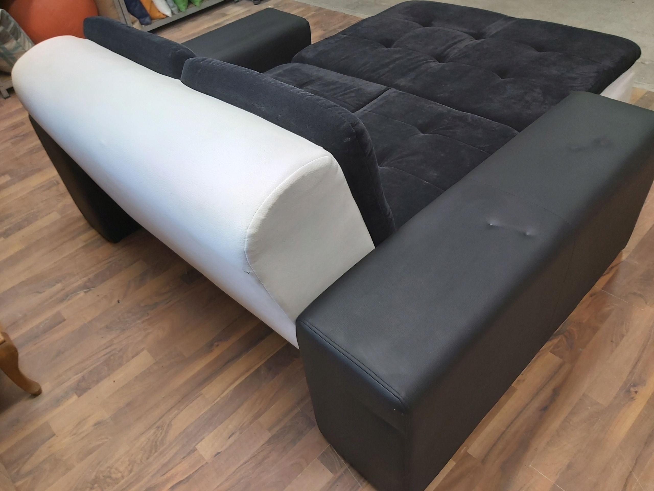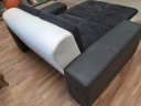 FOTEL SZEZLONG - WYPOCZYNKOWY dwu osobowy - siedzisko i oparcie gruba TKANINA - czarna , natomiast doły i podłokietniki eko-skóra czarna i biała - stan bardzo dobry , stolik i dywan za dopłatą z możliwością wyboru innego modelu . Możliwość oglądnięcia szezlongu na miejscu , pomoc w organizacji transportu . * 5 3 1 * 4 7 5 * 0 3 0 *