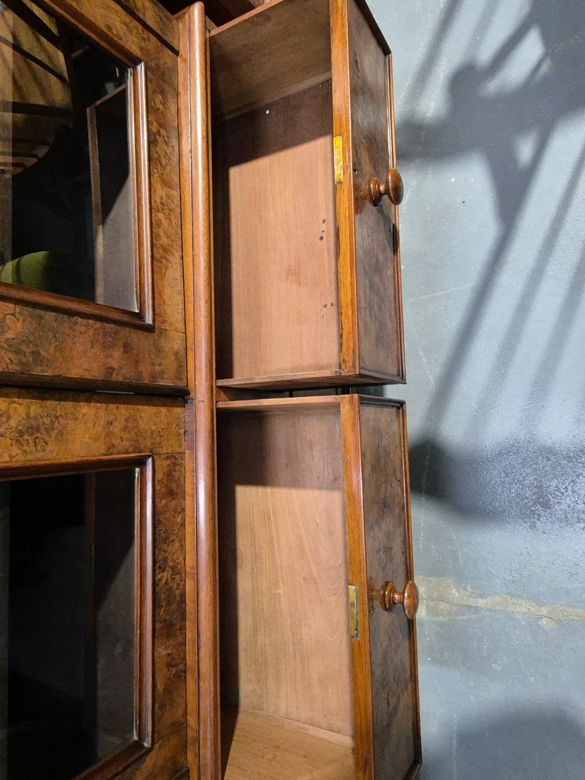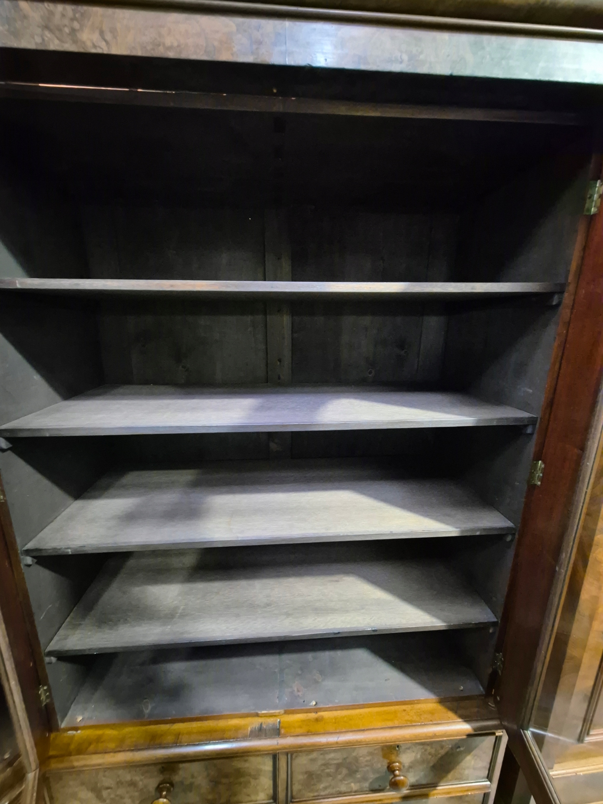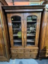 Elegancka witryna / biblioteczka w klasycznym stylu wykonana z drewna pokrytego pięknym fornirem o charakterystycznym rysunku (tzw. czeczot / orzech). Mebel posiada przeszklone drzwi z łukowymi ramami, dzięki czemu idealnie nadaje się do eksponowania książek, porcelany lub dekoracji.