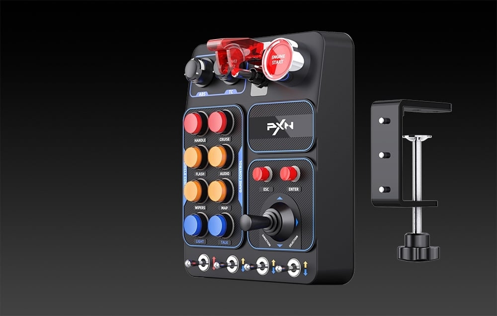 Panel PXN CB1 można łatwo zamontować na biurku za pomocą dołączonych zacisków – obsługuje blaty o grubości do 70 mm. To wygodne rozwiązanie zapewnia stabilność nawet podczas intensywnej gry. Poza montażem na biurku CB1 oferuje również możliwość mocowania na specjalnych standach lub uchwytach kompatybilnych z otworami montażowymi. Dzięki temu każdy gracz może dostosować położenie panelu do swojego stanowiska, zwiększając komfort i ergonomię obsługi.