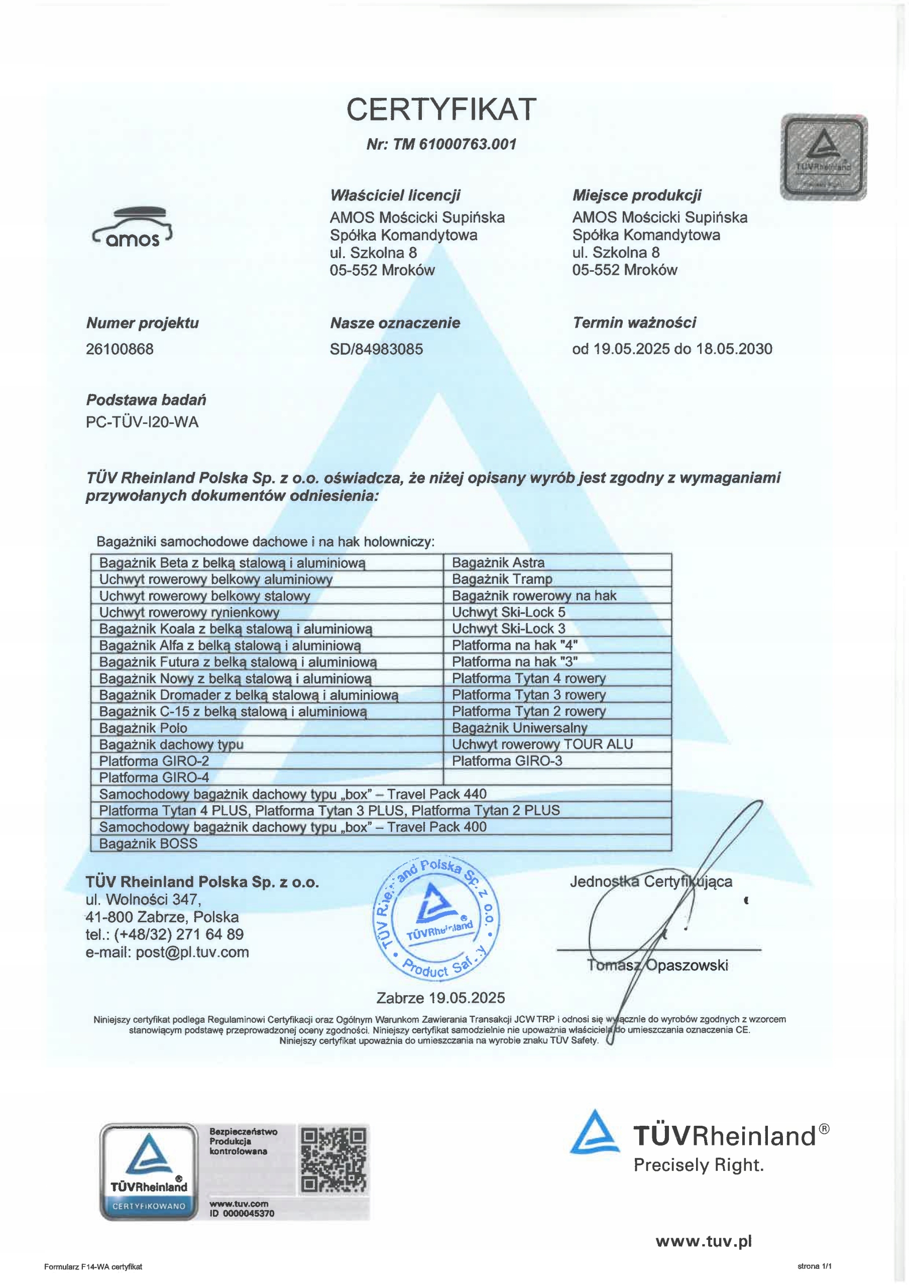 Niska cena nie oznacza braku bezpieczeństwa. Bagażnik przeszedł rygorystyczne testy w instytucie TÜV Rheinland i posiada aktualny, odświeżony certyfikat. To pieczęć jakości, która gwarantuje, że konstrukcja jest stabilna, bezpieczna i nie zawiedzie Cię nawet na autostradzie.