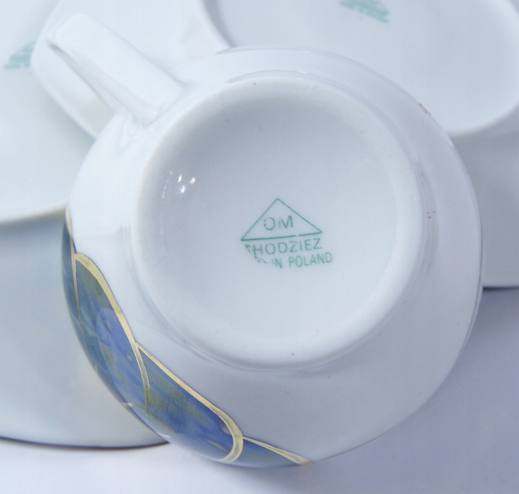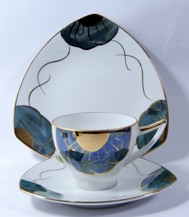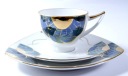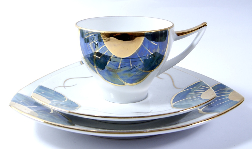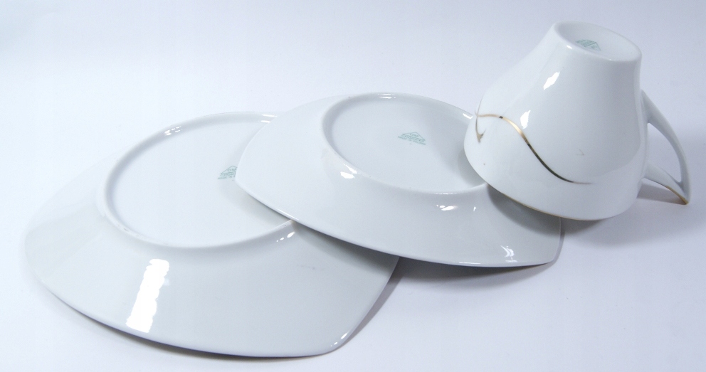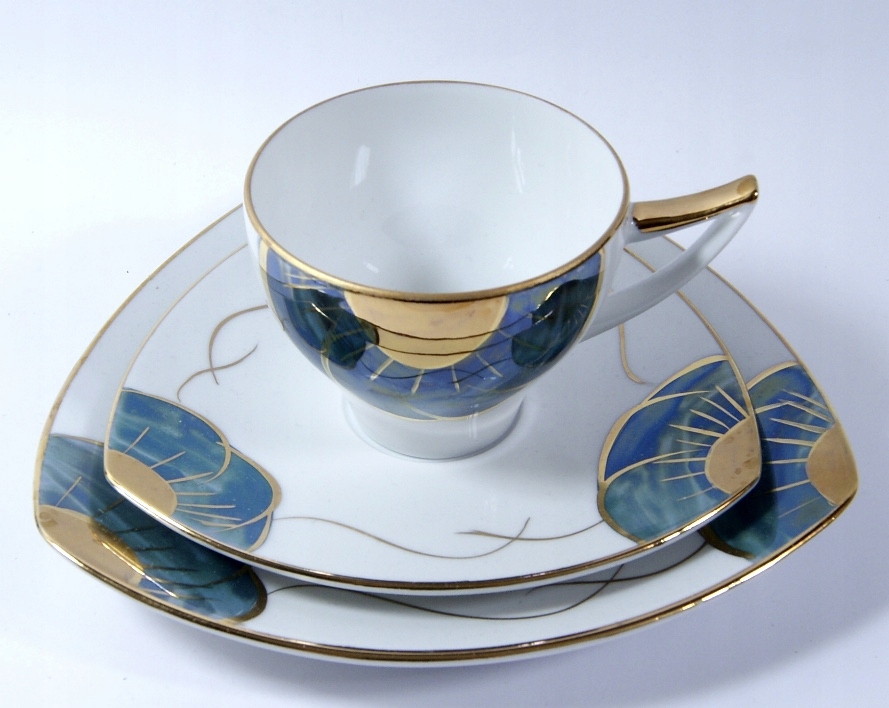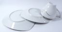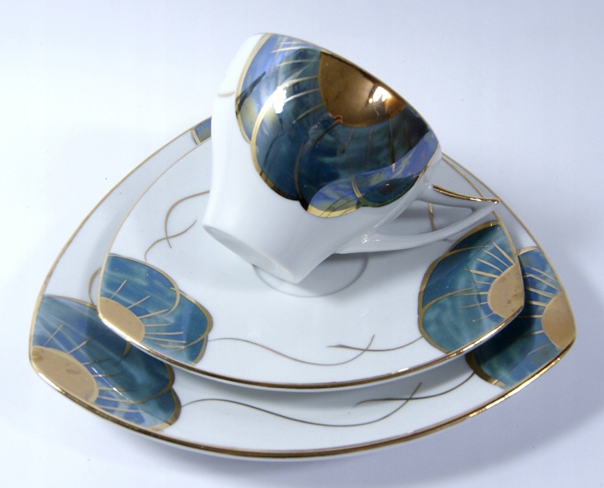 Przedmiotem aukcji jest śliczny, stary zestaw śniadaniowy- Biała porcelana zdobiona jest złoceniem
