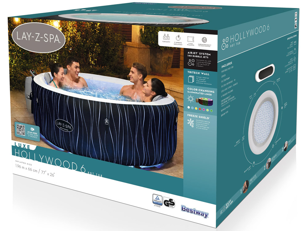 Bestway Lay-Z-Spa HOLLYWOOD™ to dmuchana wanna z hydromasażem, idealna dla osób ceniących luksusowy wypoczynek, z zachowaniem prywatności. Zapewni komfortowy wypoczynek po długim dniu. Dzięki modelowi Lay-Z-Spa Hollywood™ można poczuć się jak w najlepszym spa i to w przy domowym ogródku. Dmuchane spa zostało wyposażone w wielokolorowe oświetlenie LED sterowane pilotem (możliwość wyboru aż z 7 kolorów). Diody LED świecą przez półprzezroczystą wyściółkę spa i oświetlają wodę, dla zapewnienia jeszcze więcej unikalnych wrażeń. Ponadto w zestawie znajdziemy 4 poduszki pod głowę, zapewniające dodatkowy komfort użytkowania. Tysiące masujących bąbelków, odpowiednia temperatura wody oaz efektowne oświetlenie zrelaksują i odprężą ciało a także pozwolą na chwilę wytchnienia.