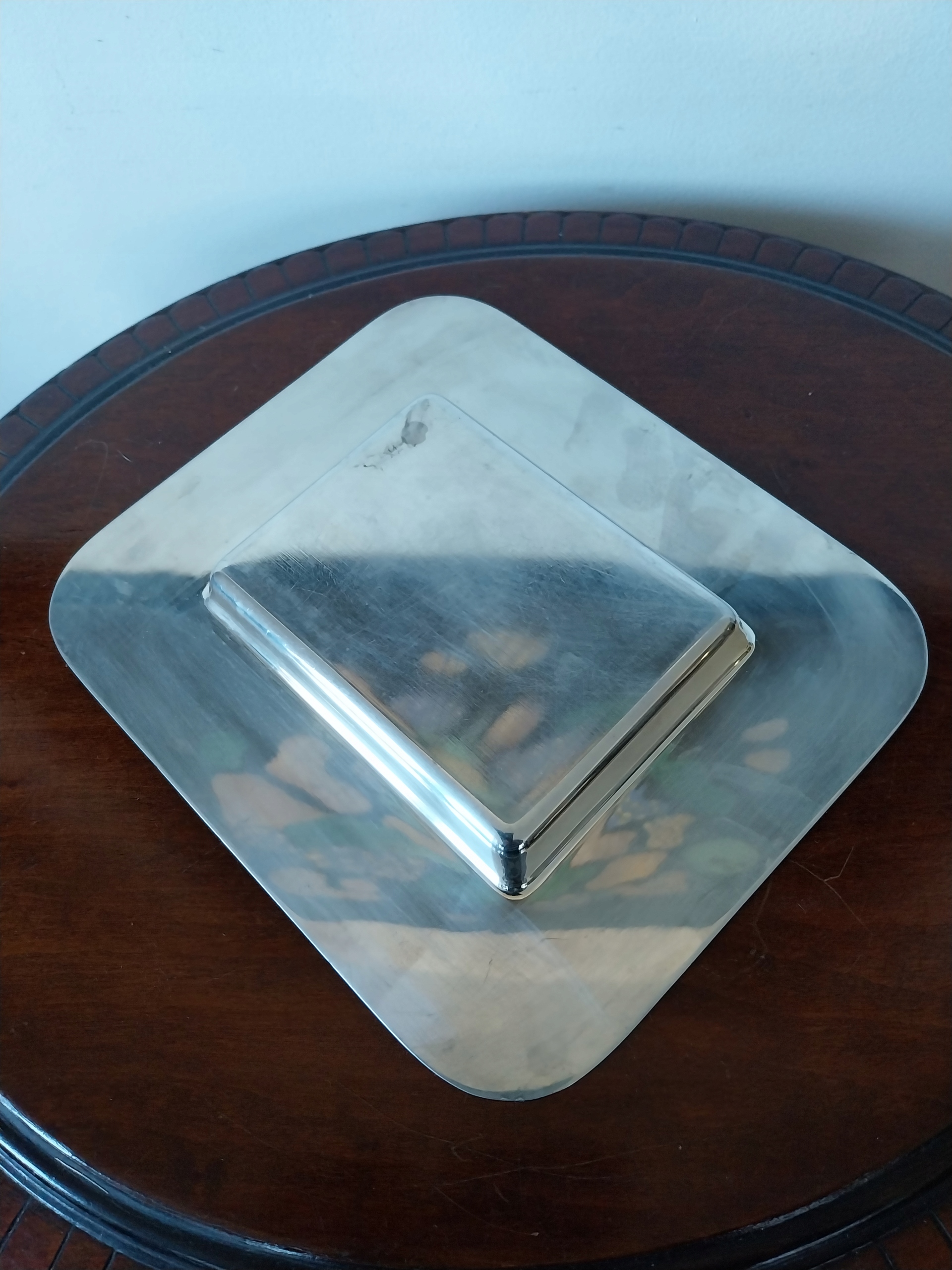 Ładna , mała , srebrzona patera , wymiary 20 x 17 cm , wysokość 1,7 cm , stan ogólny jak na zdjęciu b.dobry