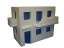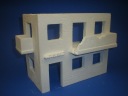 Ruiny domu mieszkalnego z podłogą, balkonami, podłogami i resztkami gruzu.