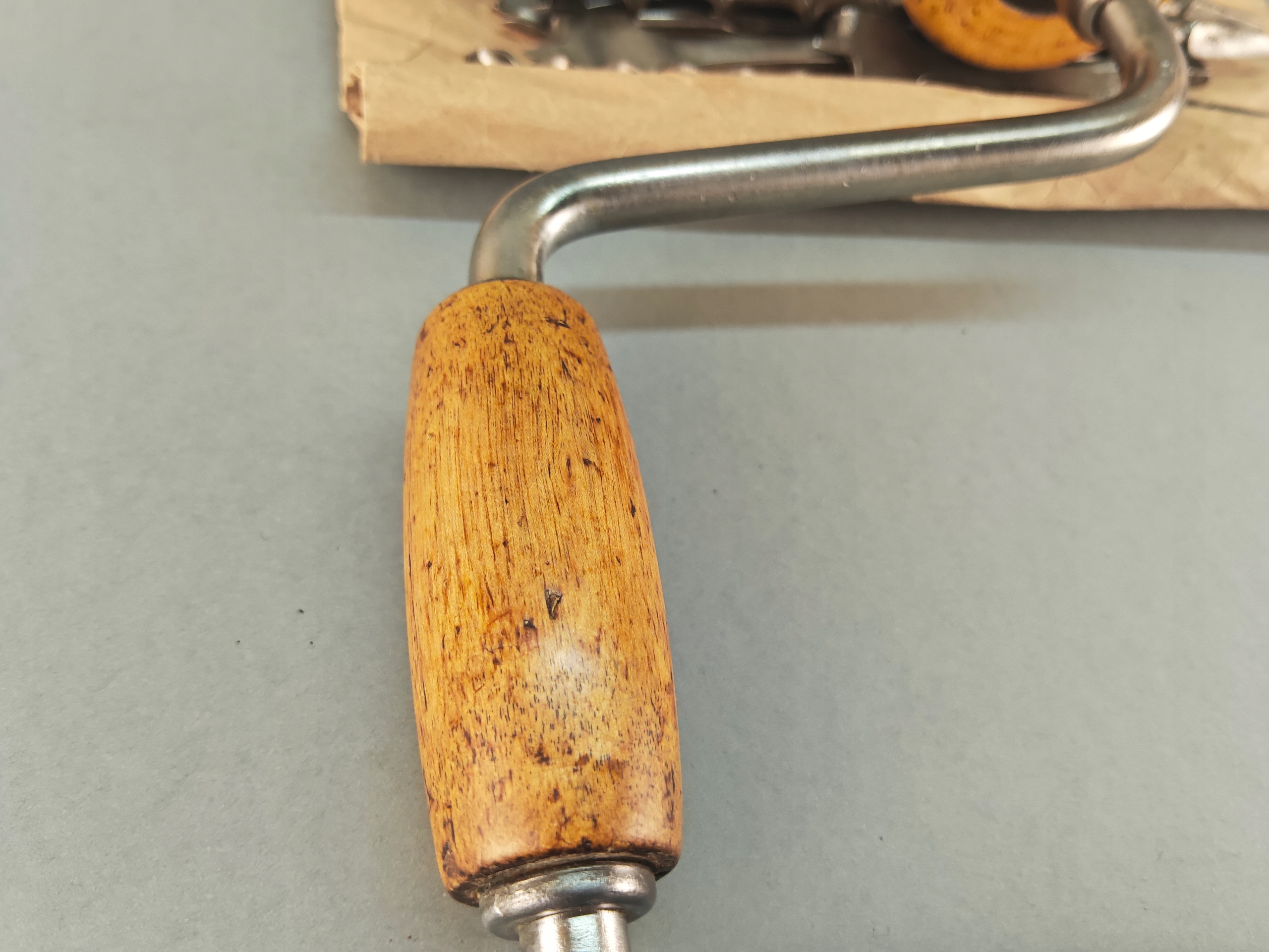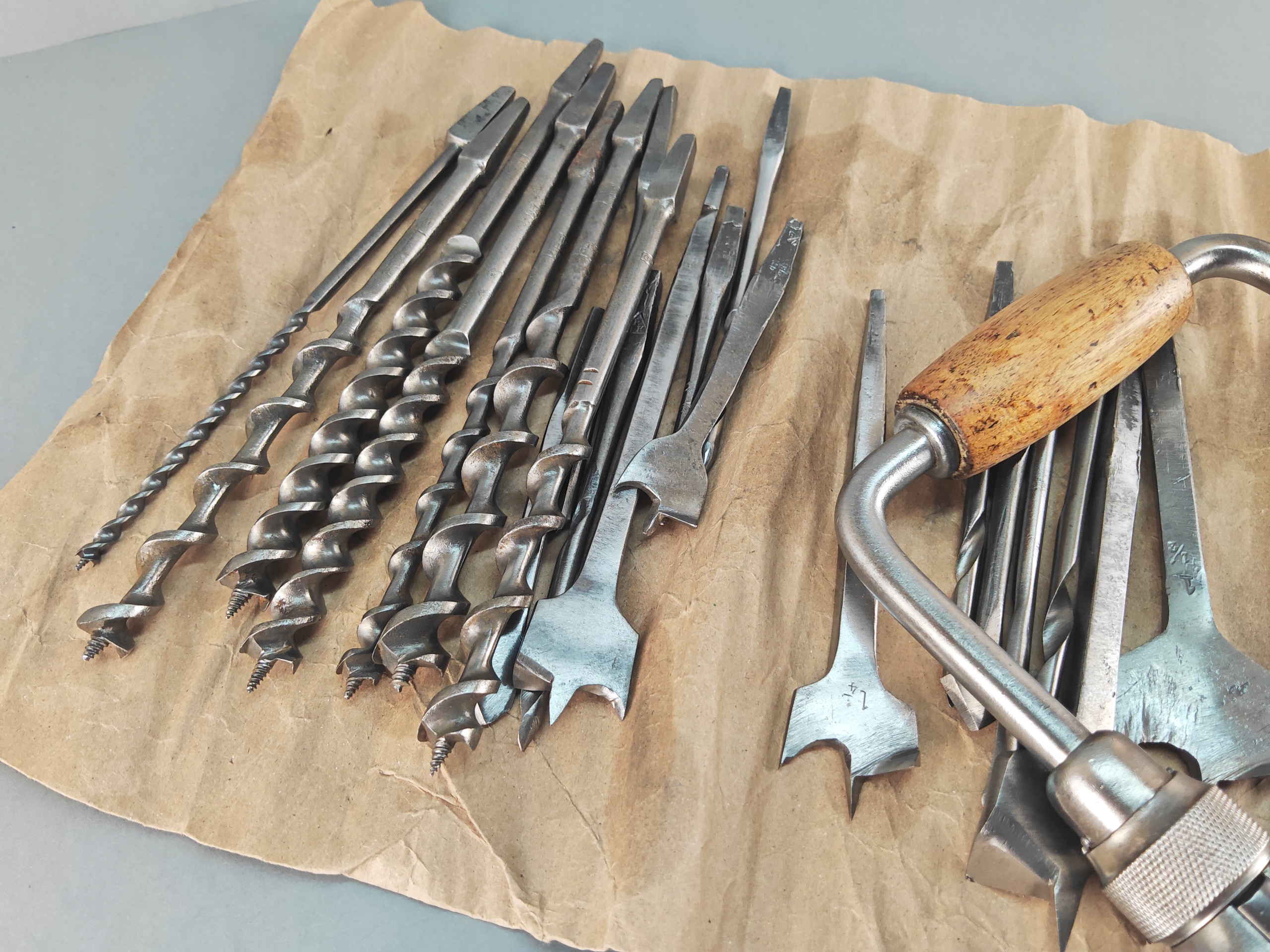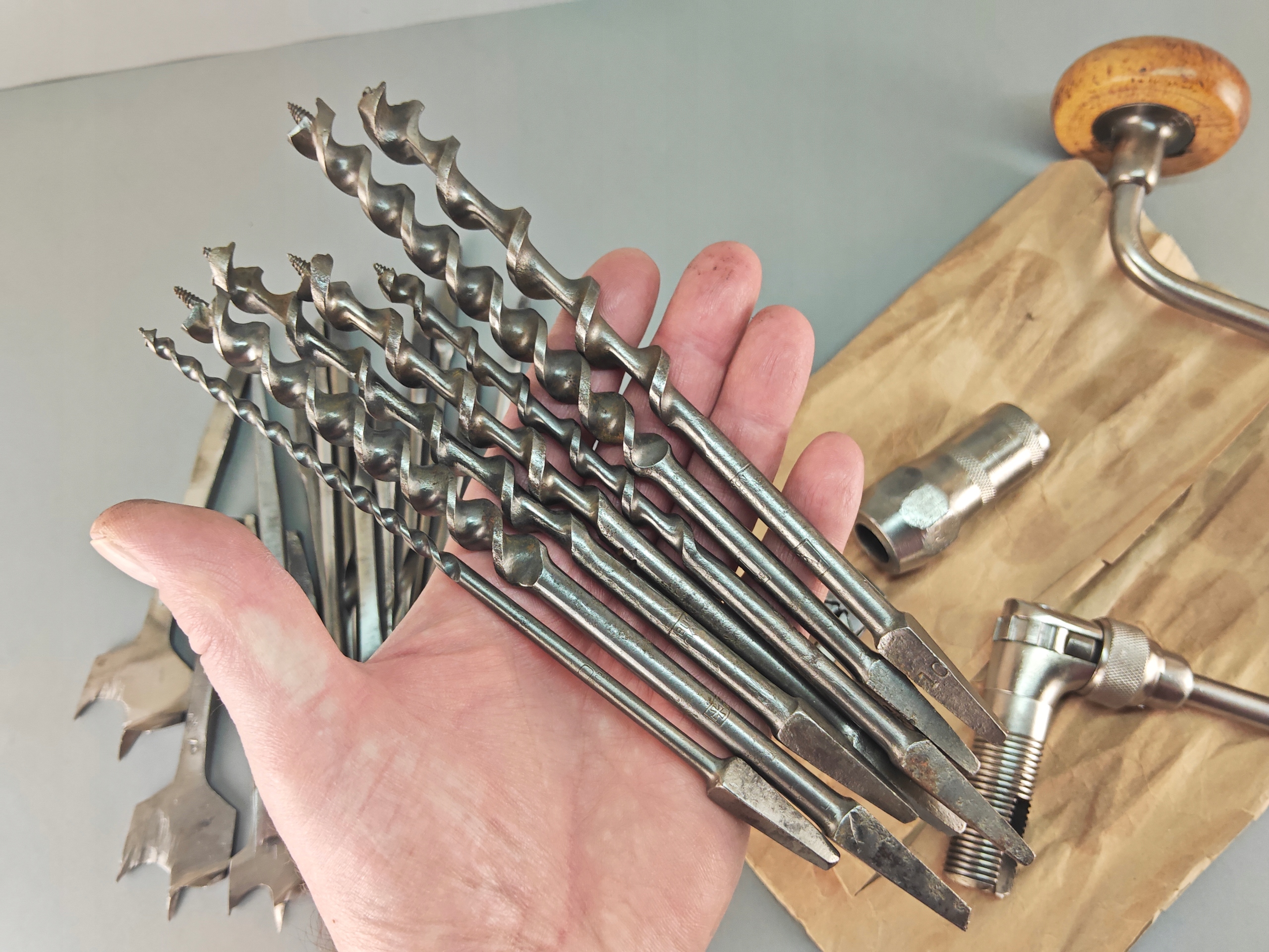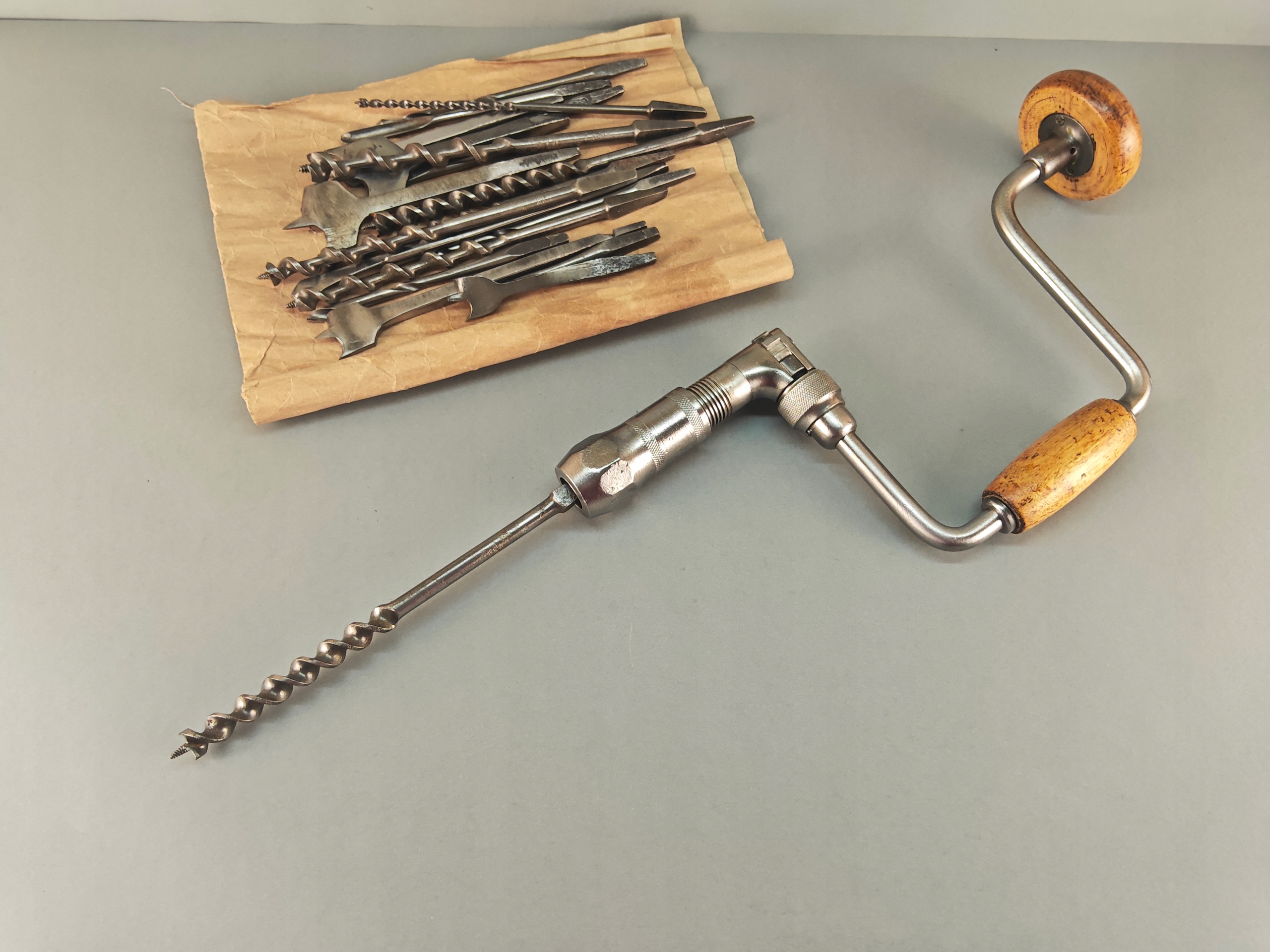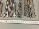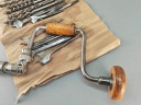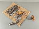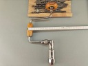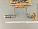 Stara Szwecka wiertarka ręczna, stan bardzo dobry, wszystko w porządku, drewniane rączki całe żadnych pęknięć ( ciekawy rodzaj drewna, jasny kolor, na pewno nie buk), rączki kręcą lekko, obrory lewo- prawo działają poprawnie, szczęki mocujące w porządku. Do komplety zestaw wierteł i świdrów, sygnowane, część szweckich część angelskich ( spiralne świdry). Pochodzenie Szwecja.