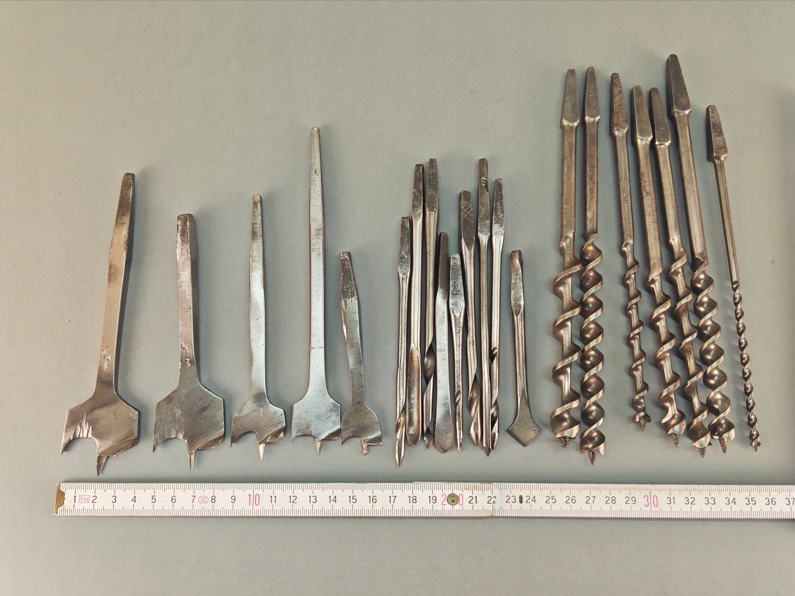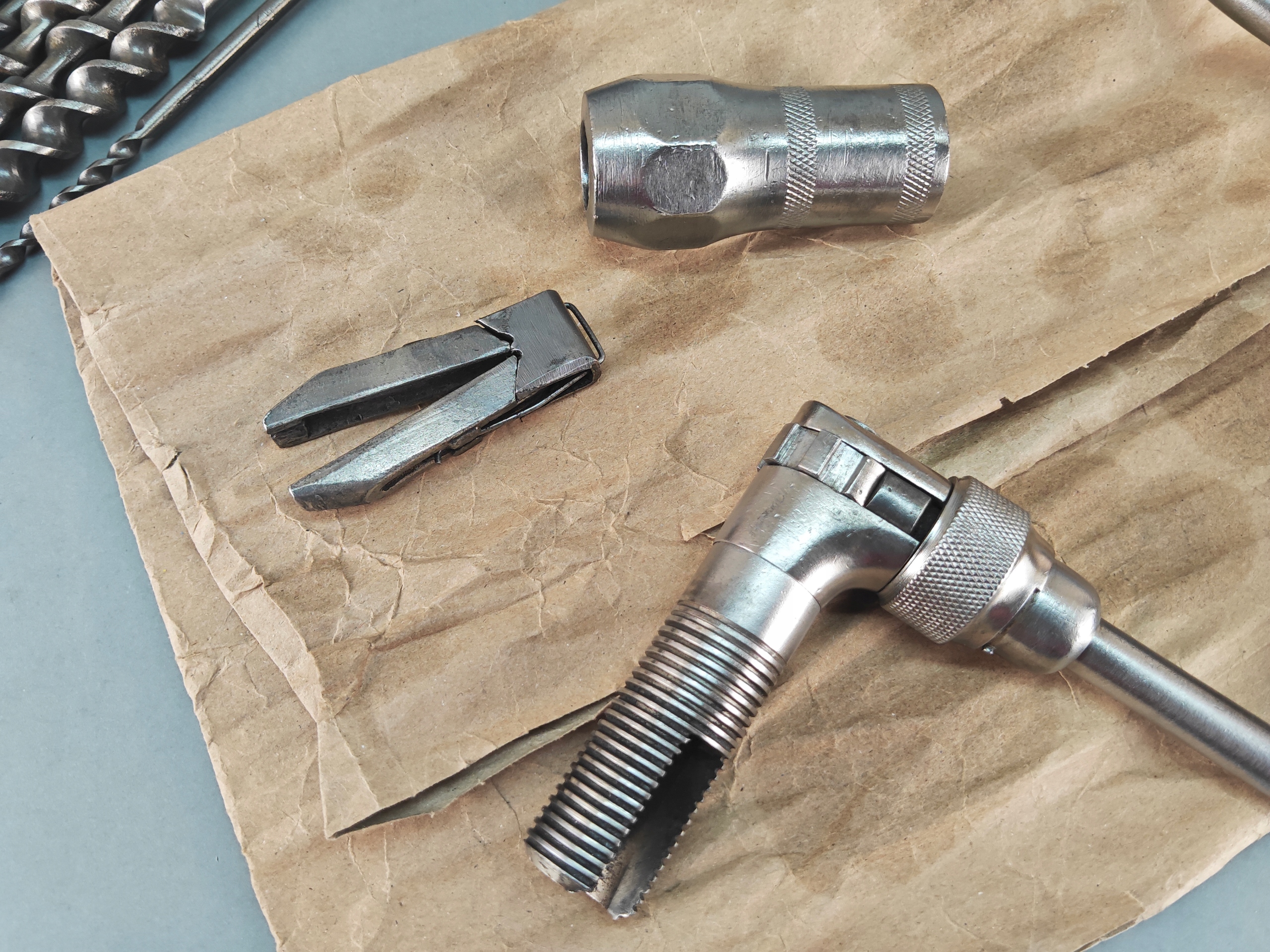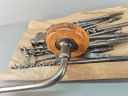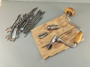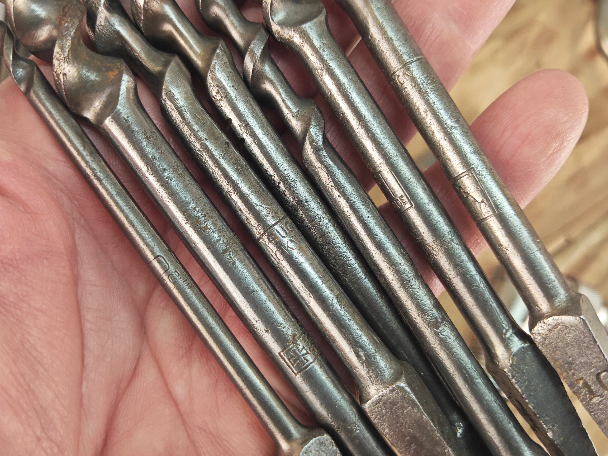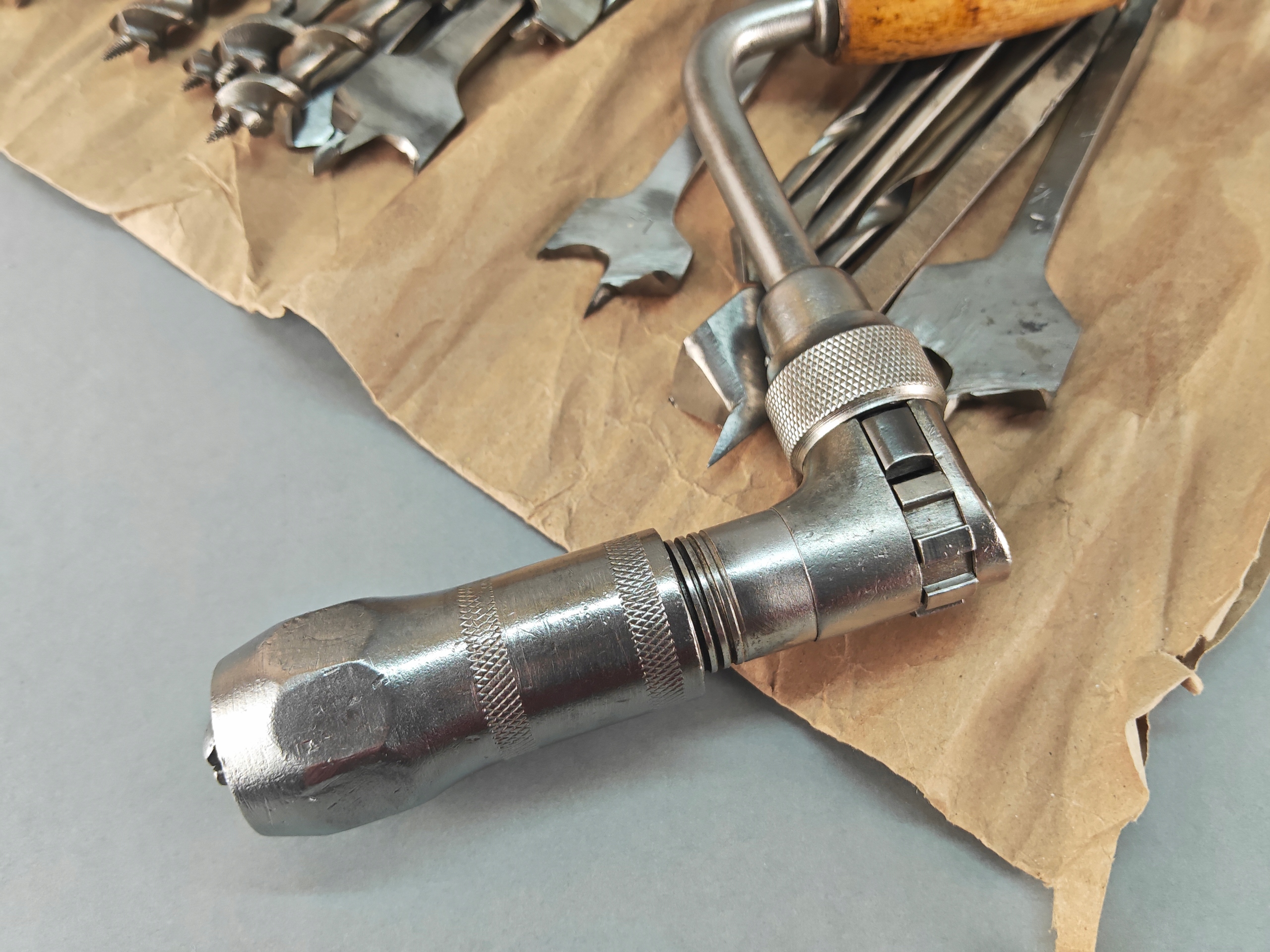 Stara Szwecka wiertarka ręczna, stan bardzo dobry, wszystko w porządku, drewniane rączki całe żadnych pęknięć ( ciekawy rodzaj drewna, jasny kolor, na pewno nie buk), rączki kręcą lekko, obrory lewo- prawo działają poprawnie, szczęki mocujące w porządku. Do komplety zestaw wierteł i świdrów, sygnowane, część szweckich część angelskich ( spiralne świdry). Pochodzenie Szwecja.