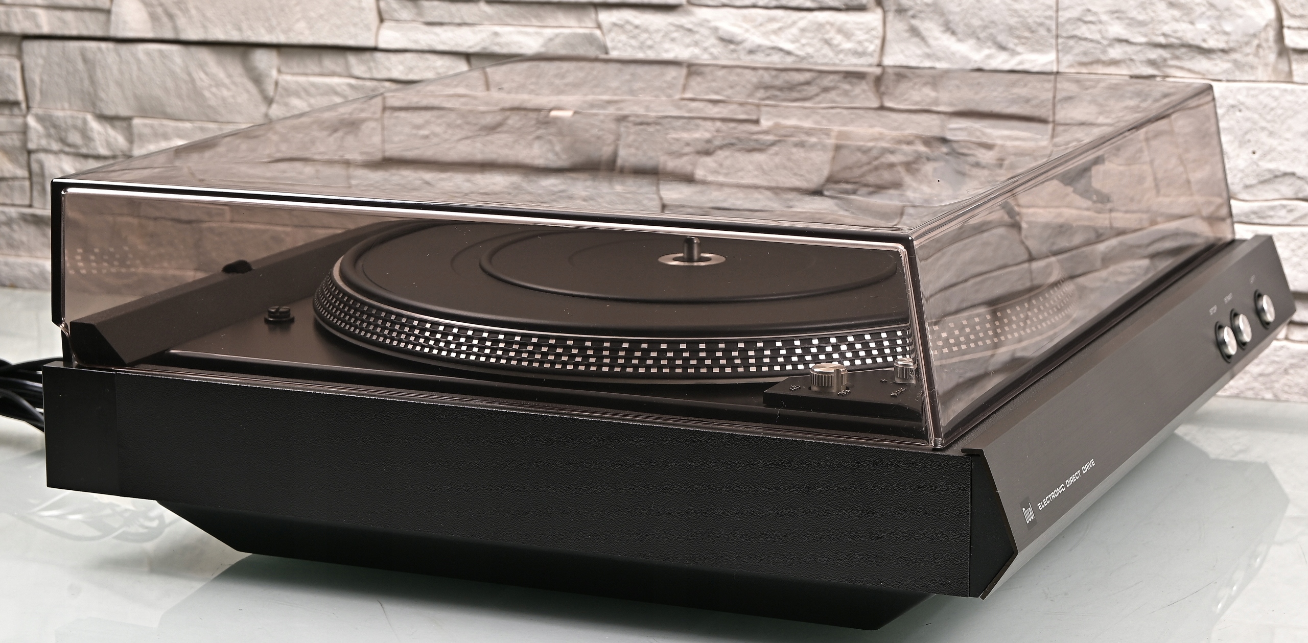 Gramofon oferuje pełną automatykę – po wciśnięciu przycisku "Start" ramię samoczynnie wędruje nad początek płyty i delikatnie opuszcza igłę, a po zakończeniu odsłuchu (lub wciśnięciu "Stop") wraca na swoją podpórkę, wyłączając napęd. Dla fanów pełnej kontroli pozostawiono precyzyjną regulację obrotów (Pitch Control) wspieraną przez podświetlany na pomarańczowo stroboskop, co pozwala na idealne, wizualne zestrojenie prędkości ciężkiego, niemagnetycznego talerza. Na pokładzie zamontowana jest doskonała wkładka systemu ULM (produkowana dla Duala przez kultową firmę Ortofon), wyposażona w charakterystyczną osłonę igły. Taki zestaw potrafi wyciągnąć z czarnego krążka niesamowitą ilość detali, oferując głęboki, sprężysty bas, soczystą średnicę i krystalicznie czyste wysokie tony. To po prostu mistrzowski kawał zachodnioniemieckiej inżynierii audio, stworzony do wielogodzinnych, absolutnie relaksujących sesji przy dźwiękach z ulubionych płyt.