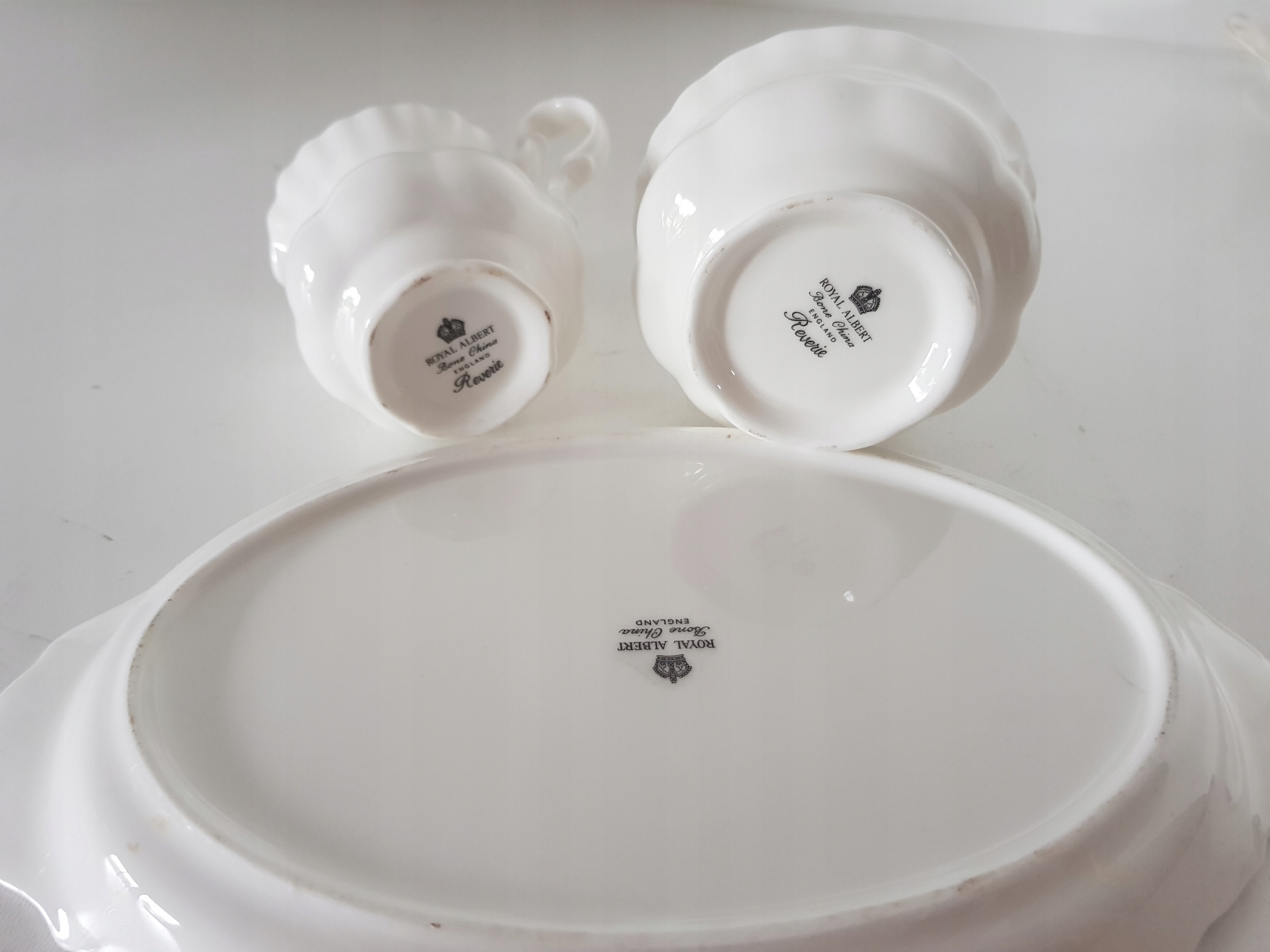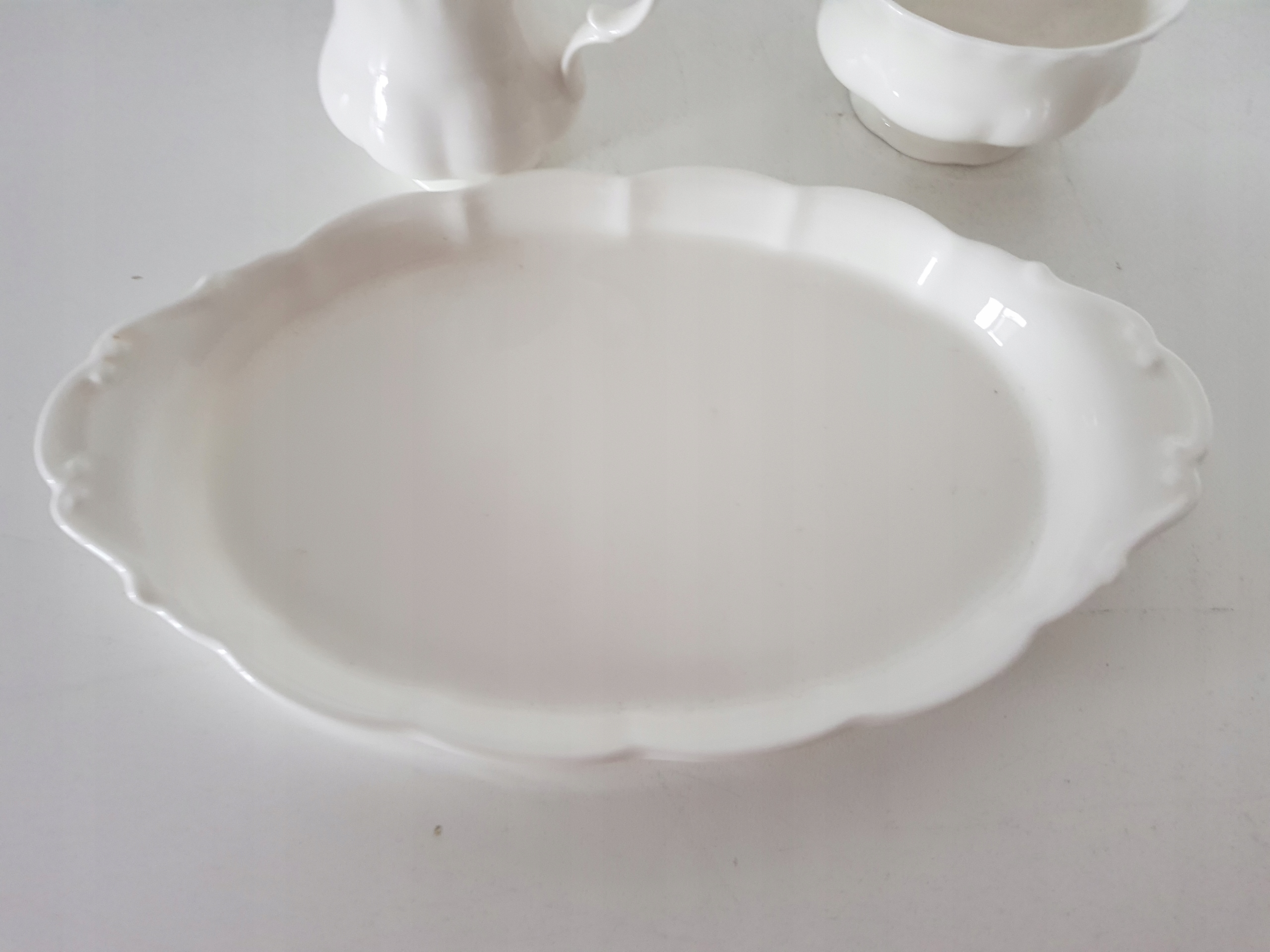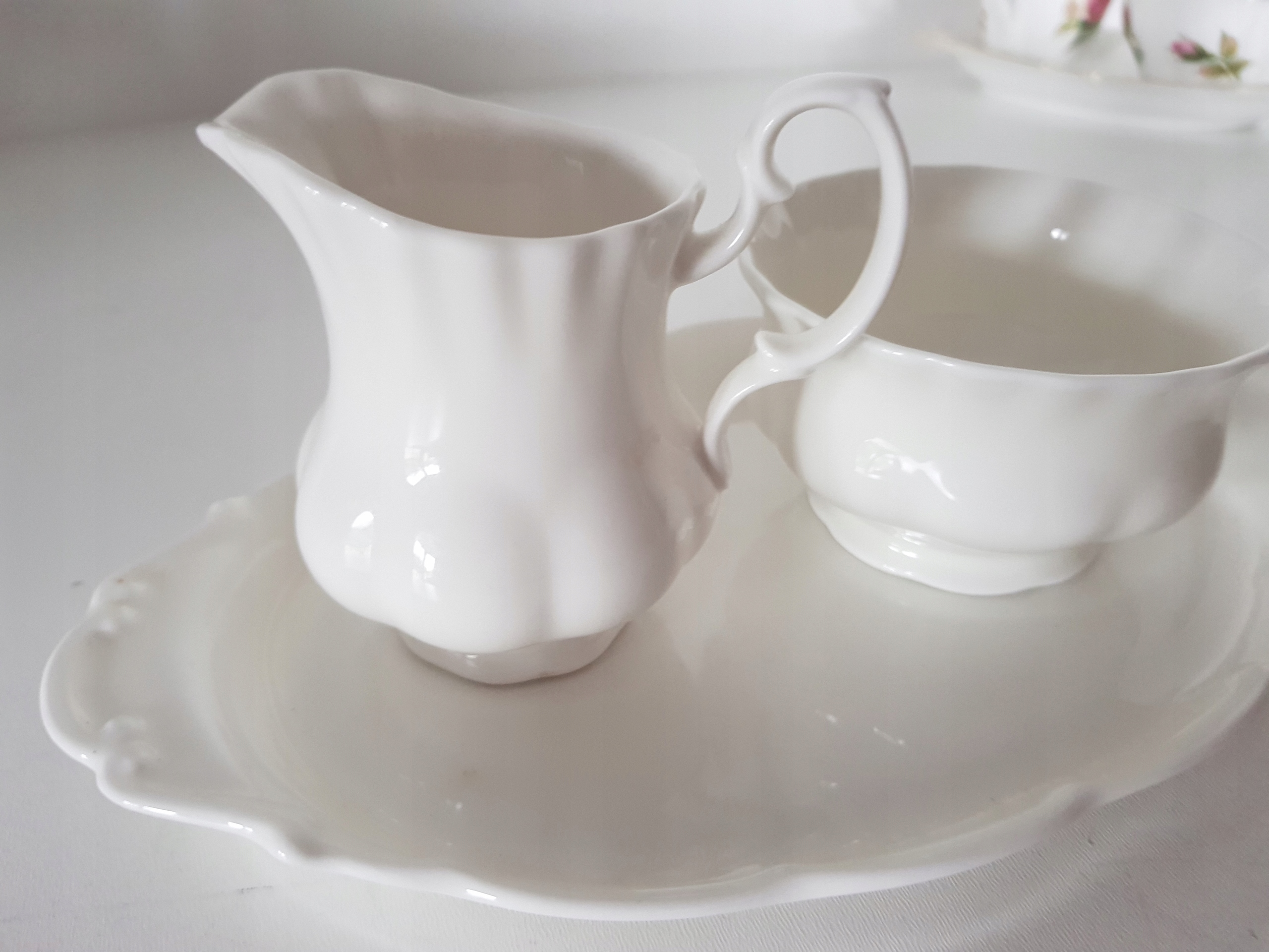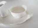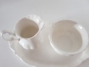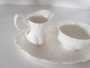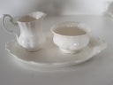 Wymiary podstawki 25 cm x 14 cm, Wysokość cukiernicy 5.5 cm, średnica 9.5 cm, mlecznika wysokość 8 cm, średnica 5.5 cm, posiadam wiele porcelany z Royal Albert, zapraszam na pozostałe moje aukcje,