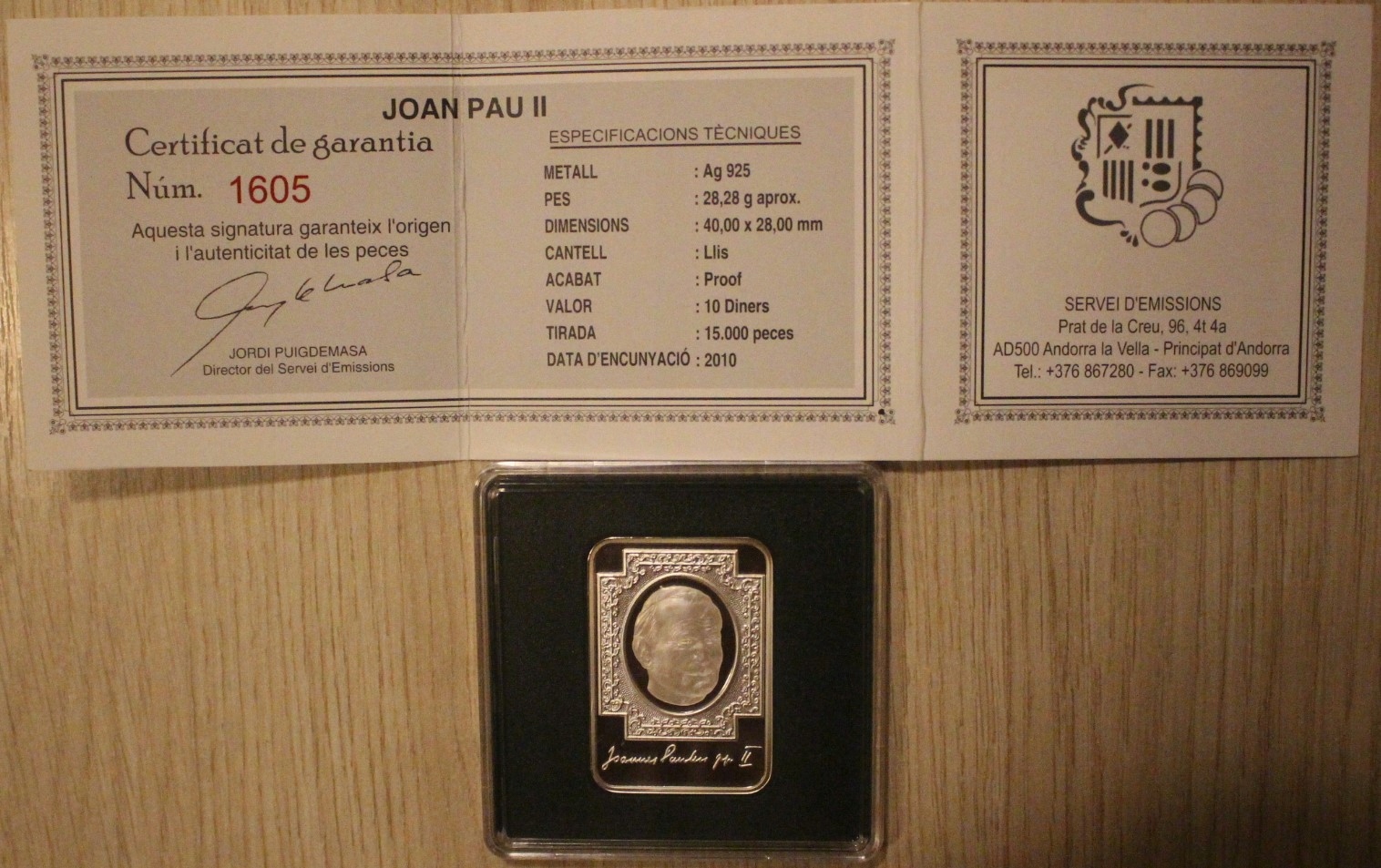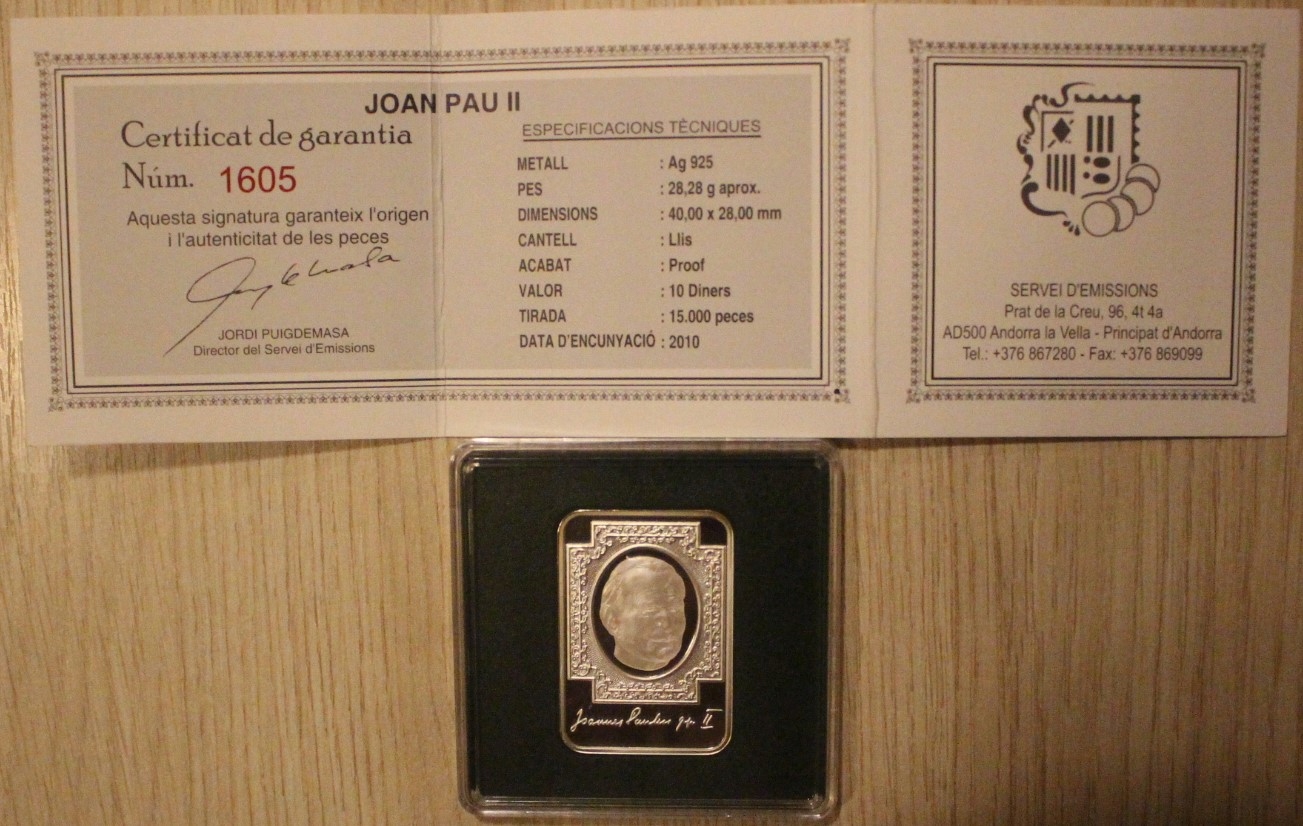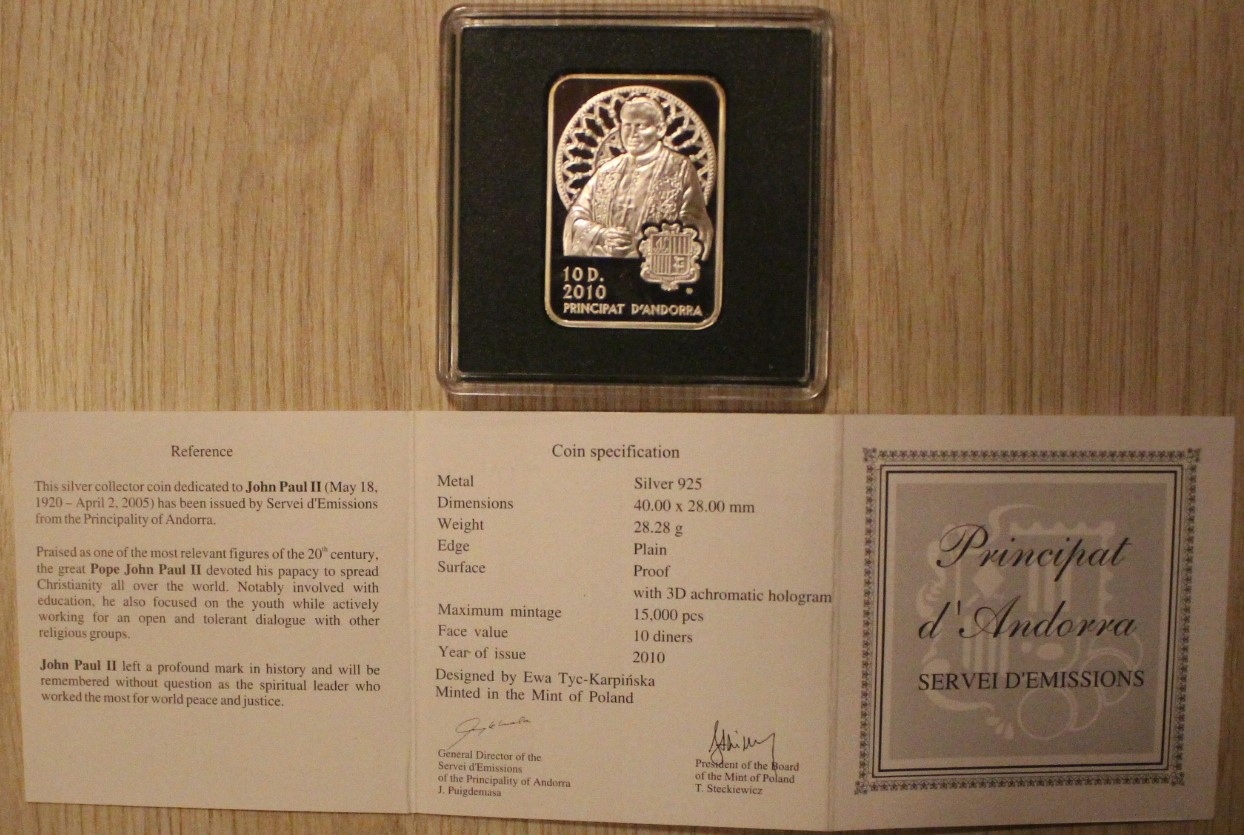 Название PAPIEŻ - JAN PAWEŁ II - 10 DINARS - DINERÓW - DINARÓW 2010 ANDORA, SREBRO PRÓBY 925, CERTYFIKAT, RZADKOŚĆ